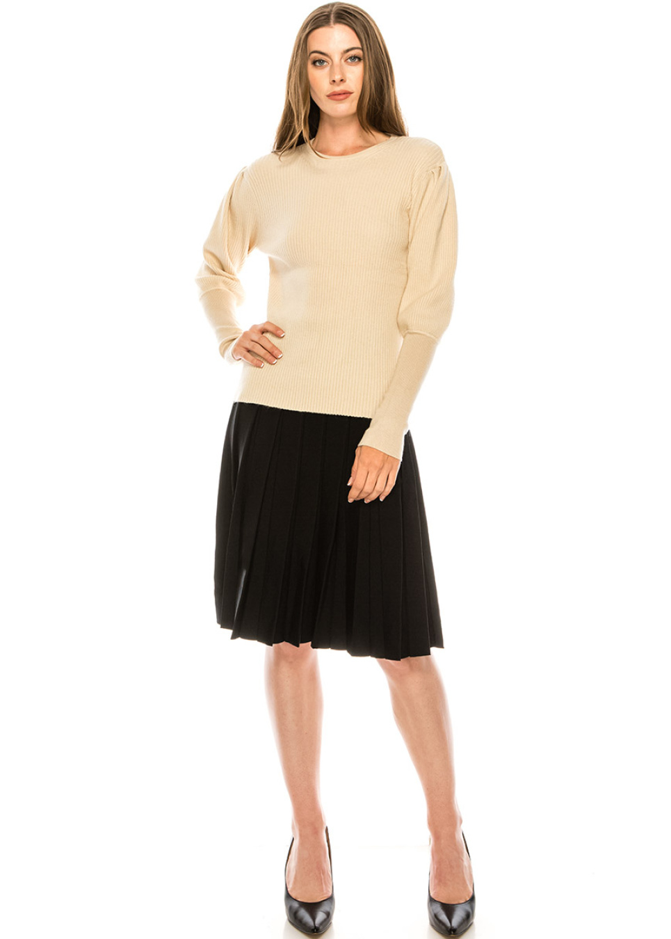 Crew neck leg-of-mutton sleeve sweater in beige