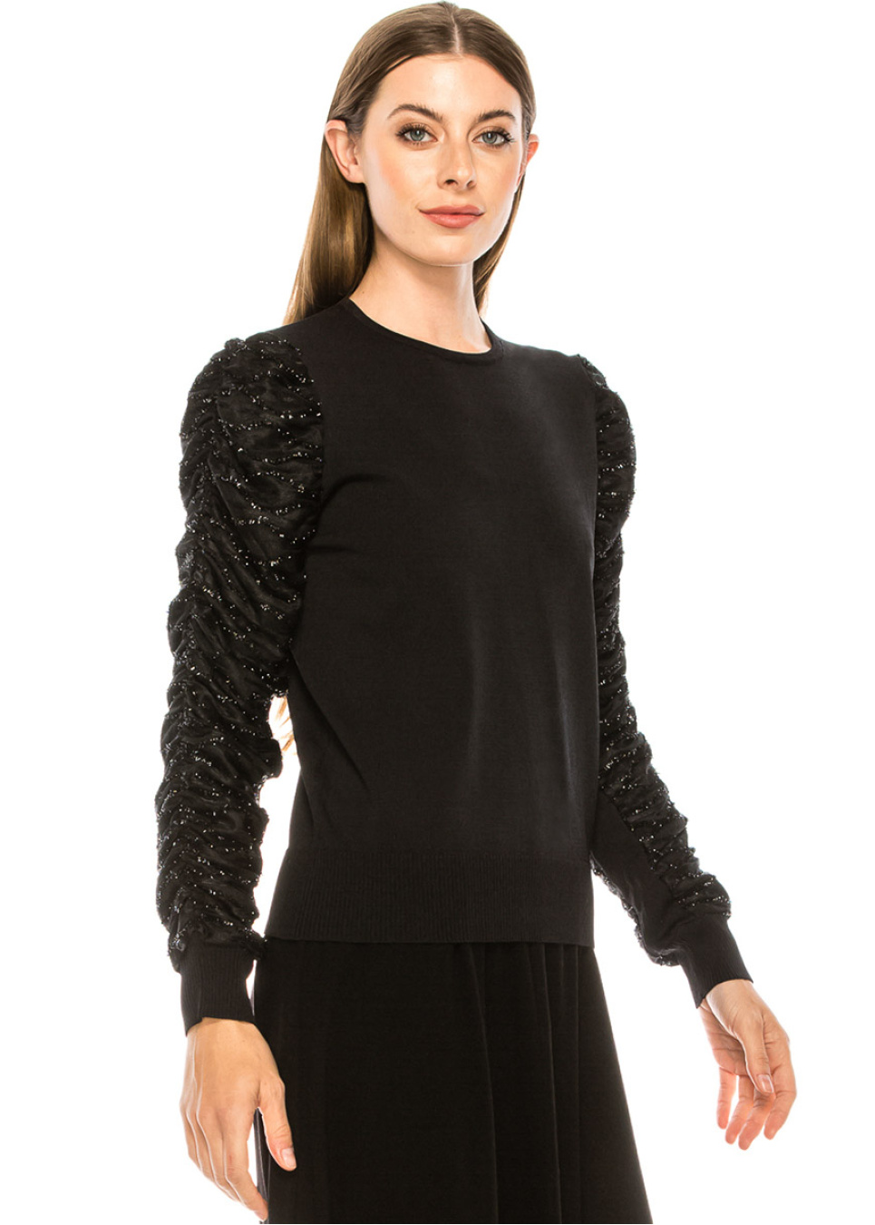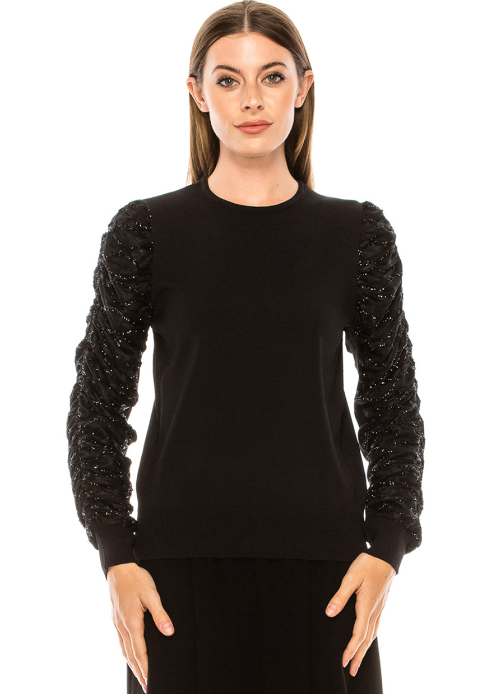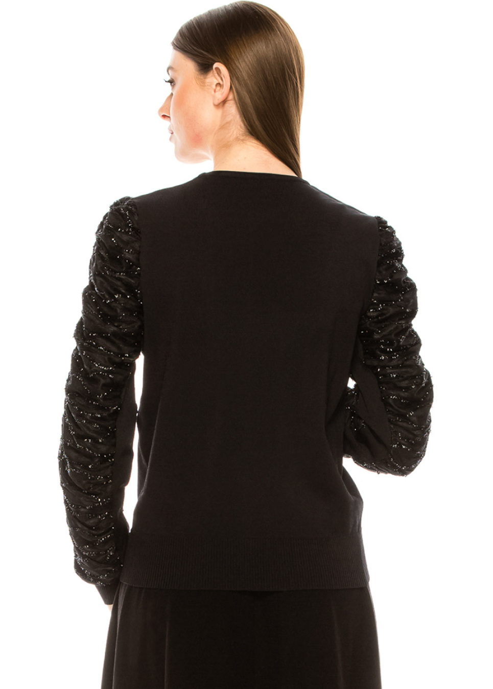 If you're searching for a standout sweater for the cold season, try this one. Black draped sleeves with sequins add some glamour. The basic cut, classical length, and muted color palette make it simple to pair with various bottoms.