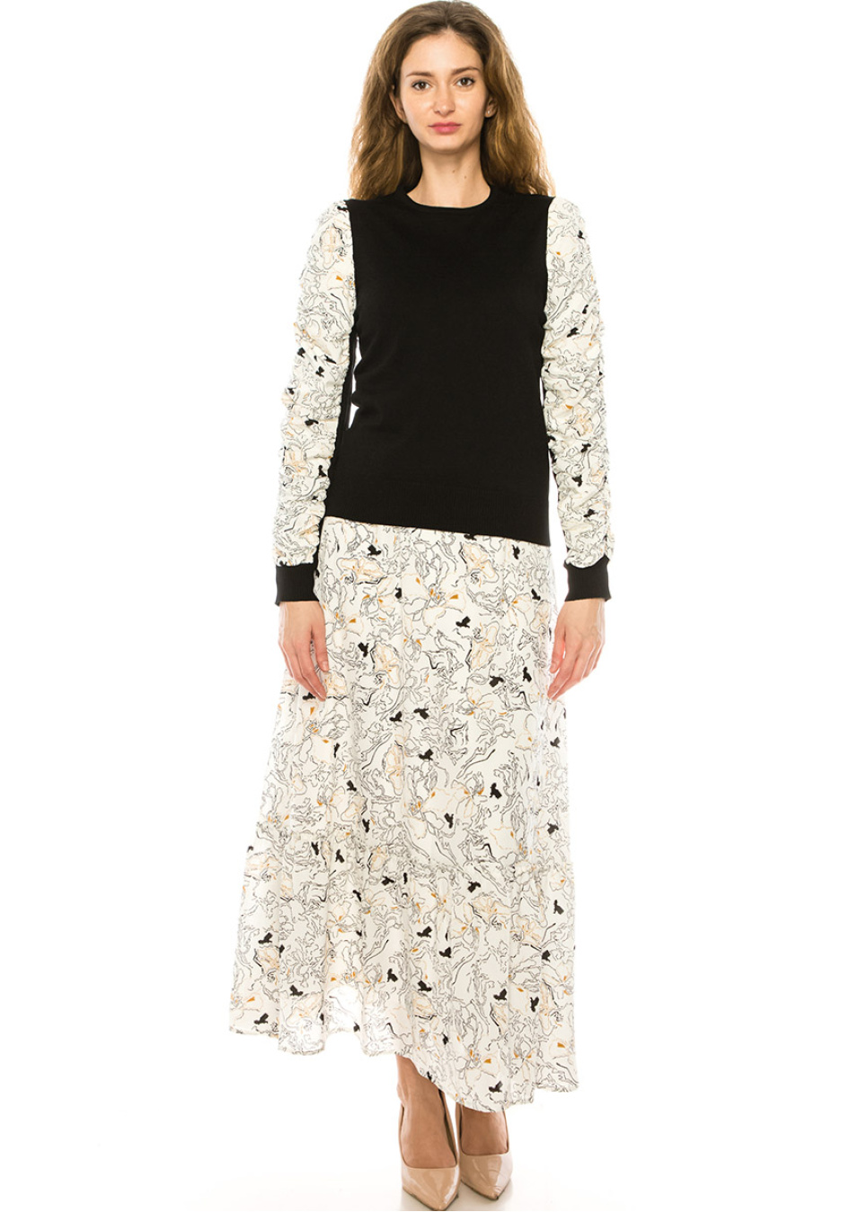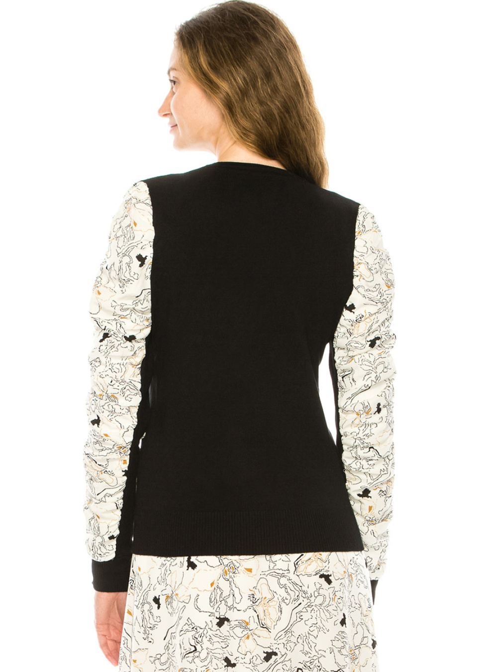 Elevate your style with this stunning black sweater, featuring striking white draped sleeves with an abstract print. The ribbed hem and soft, high-quality fabric make it the perfect choice for any occasion, while the unique design is sure to turn heads.