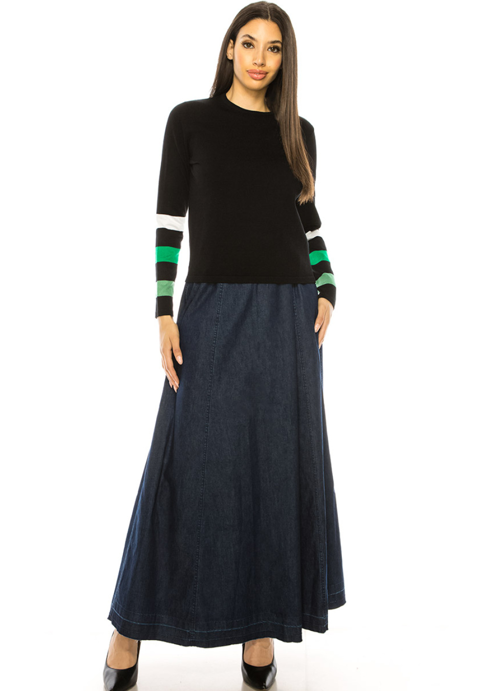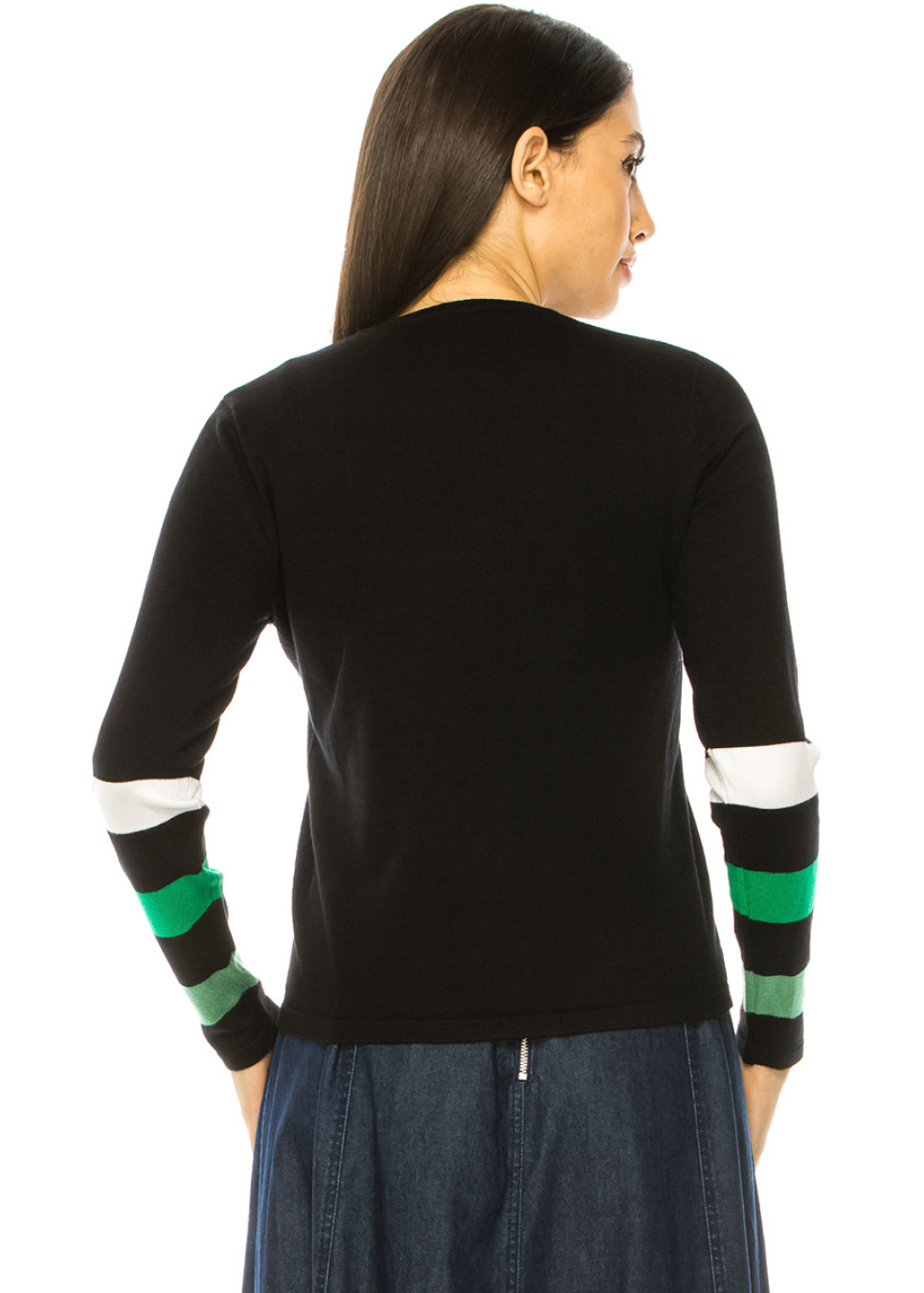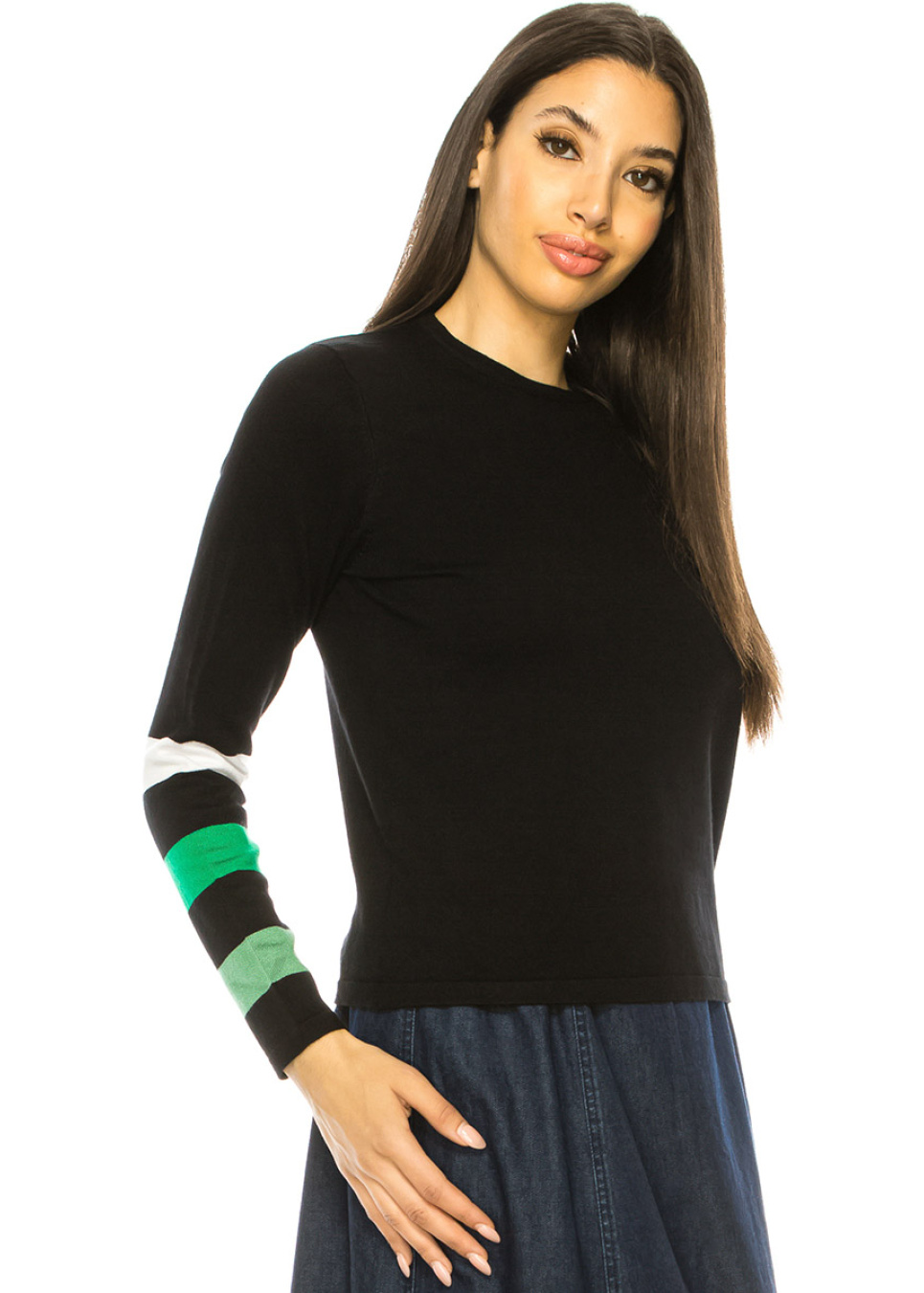 Upgrade your everyday style with this black crew neck sweater, featuring eye-catching stripes on the sleeves. The soft and cozy fabric will keep you comfortable throughout the day, while the stylish stripes add a pop of personality to your outfit.