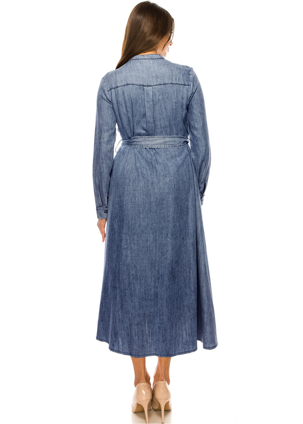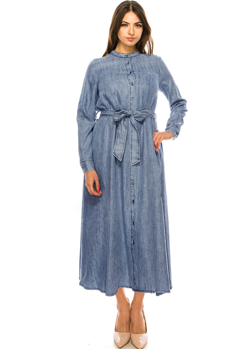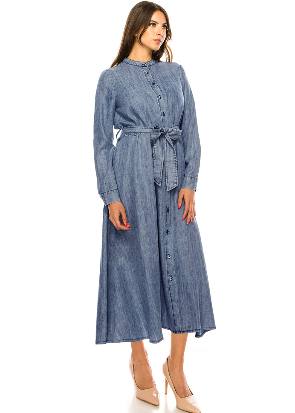 Keep it chic and effortless in our dark blue maxi dress with a crew neck and button-front design. The dress features a waist belt and cuffs with button details, adding a touch of style to the relaxed and comfortable denim fabric. Perfect for a day of sightseeing or a weekend getaway.