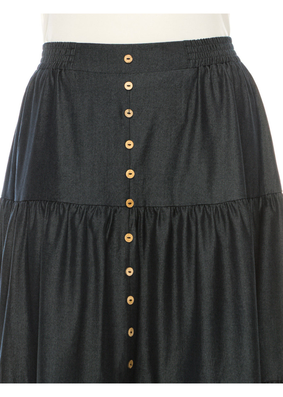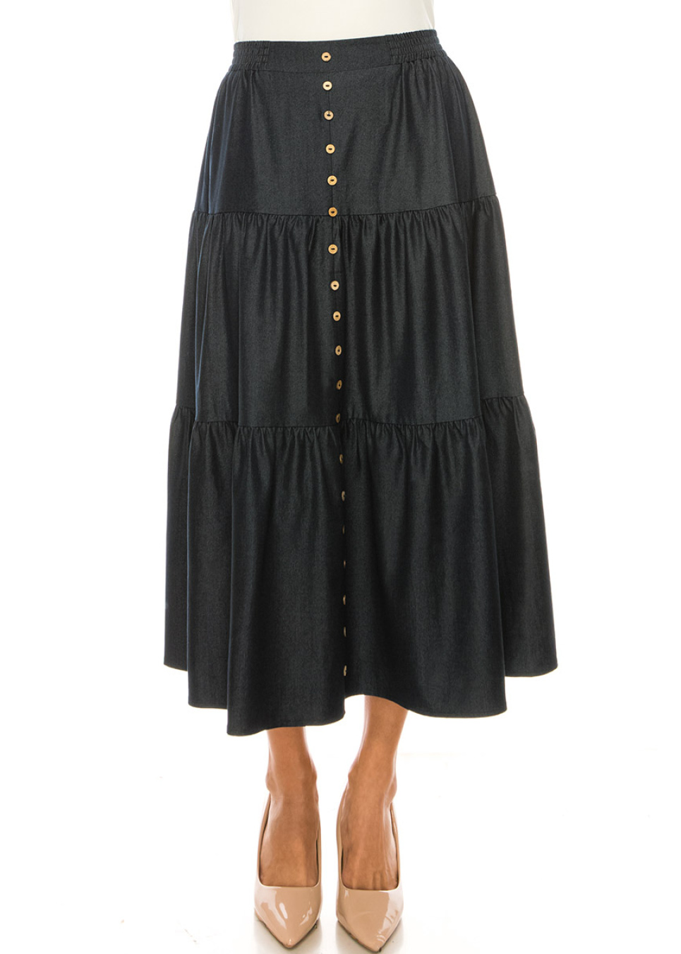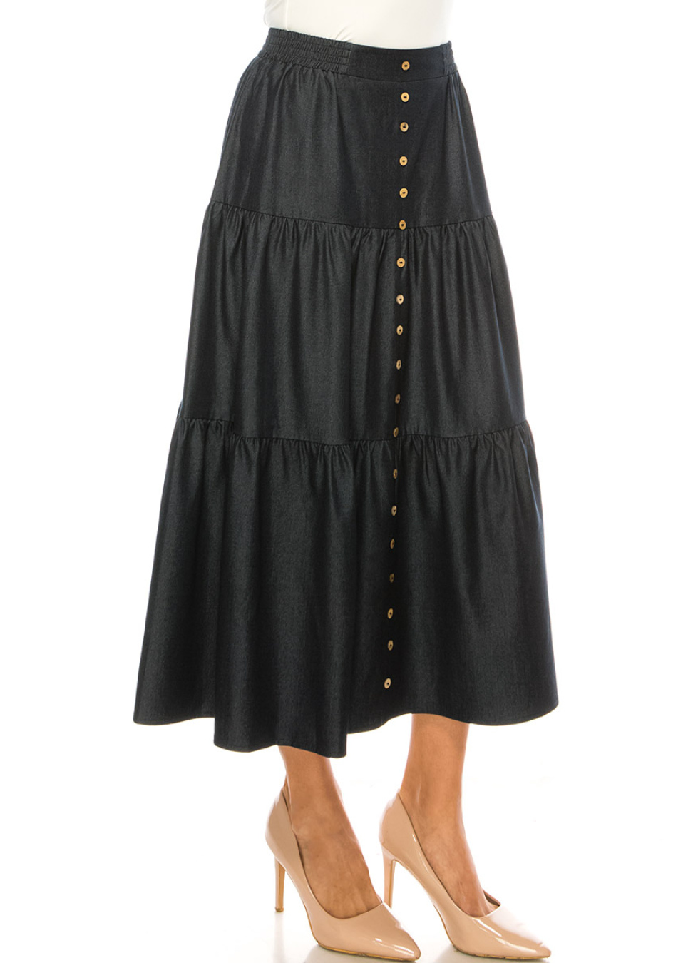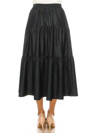 Take your modest wardrobe to the next level with this dark blue tiered denim midi skirt. The tiered design and button front create a unique and stylish look that is both practical and comfortable.