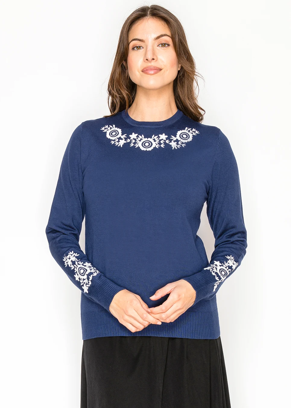 There’s something timeless about navy and white together. This sweater leans classic, but the placement of the embroidery keeps it feeling fresh.