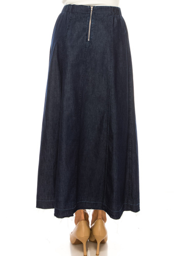 Add an element of effortless sophistication to your wardrobe with our navy denim maxi skirt with a back zipper closure. The skirt's classic denim fabric and elegant silhouette create a timeless piece that will never go out of style.