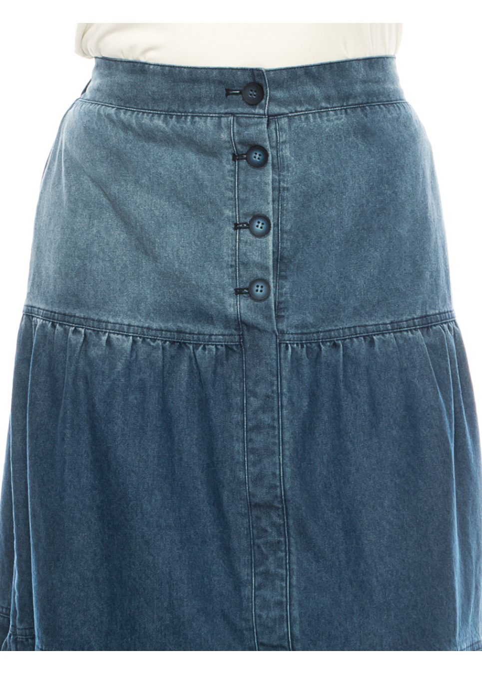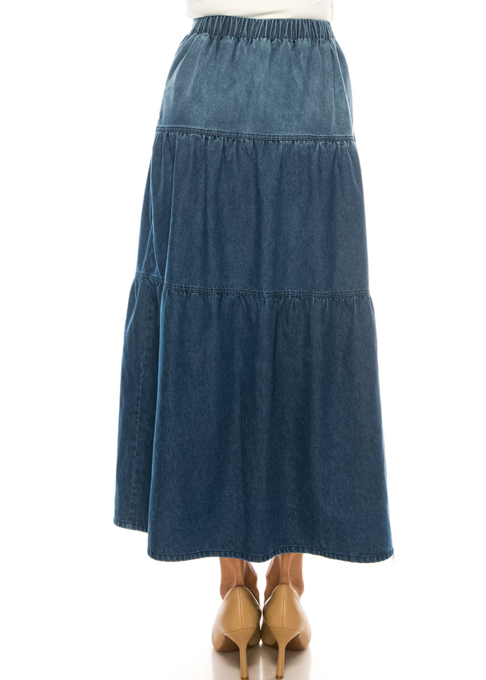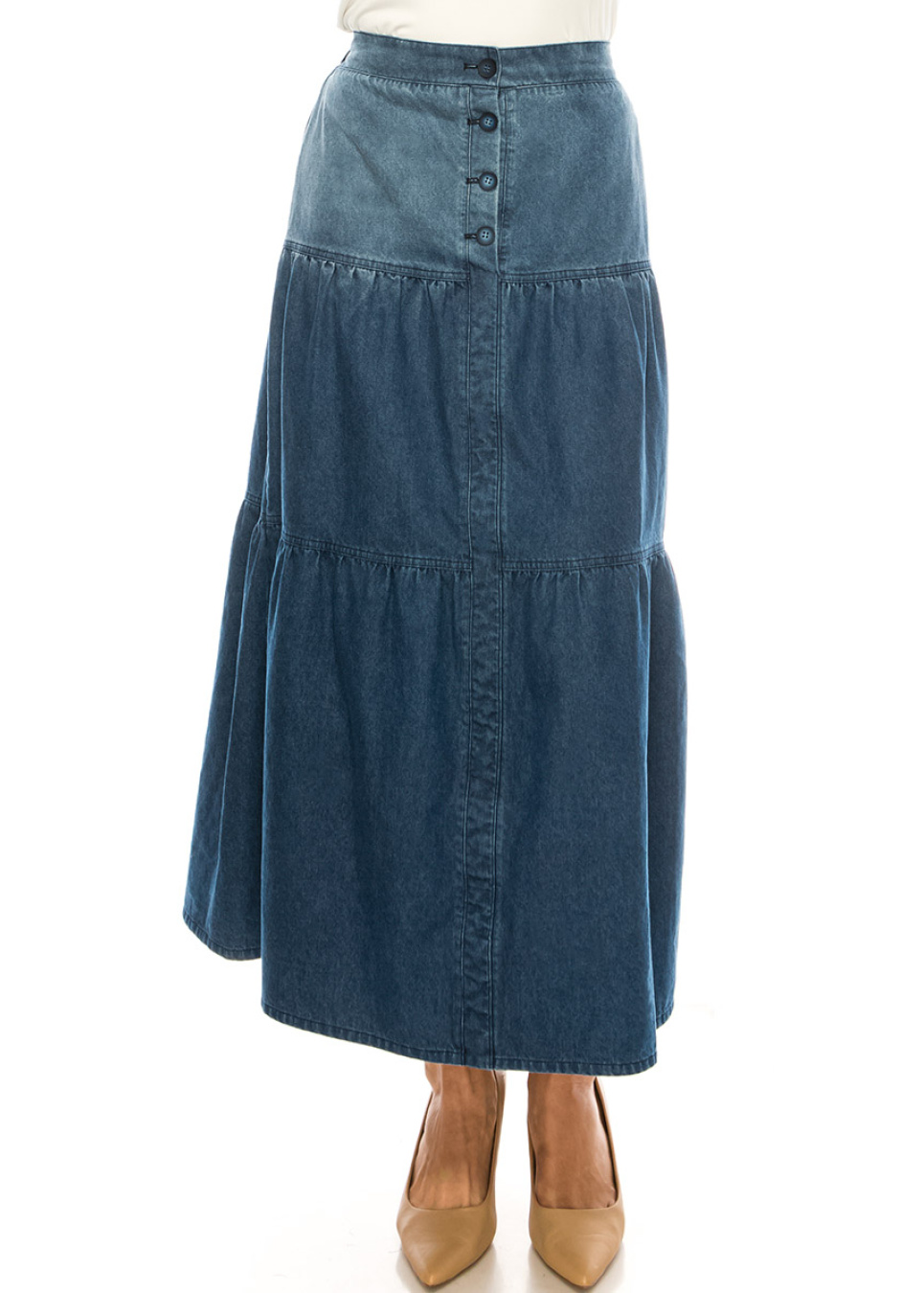 A modest denim midi skirt with a tiered design that adds subtle volume and movement. The row of buttons at the top adds a touch of vintage charm while keeping the overall look modest and refined. The skirt falls to a midi length, providing ample coverage while remaining stylish and comfortable. The versatile denim fabric allows for easy movement, making it perfect for everyday wear or special occasions.
