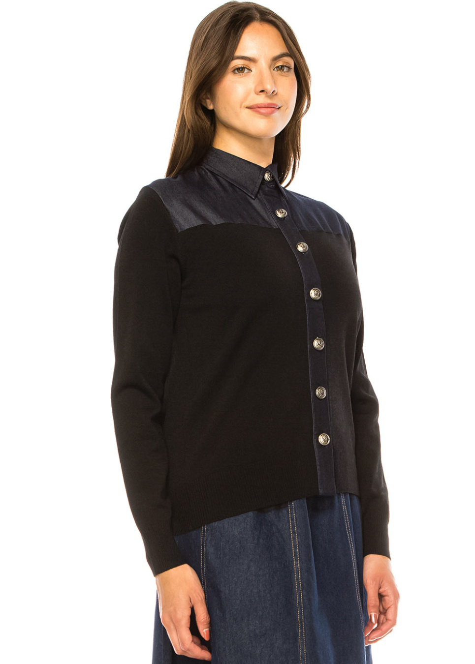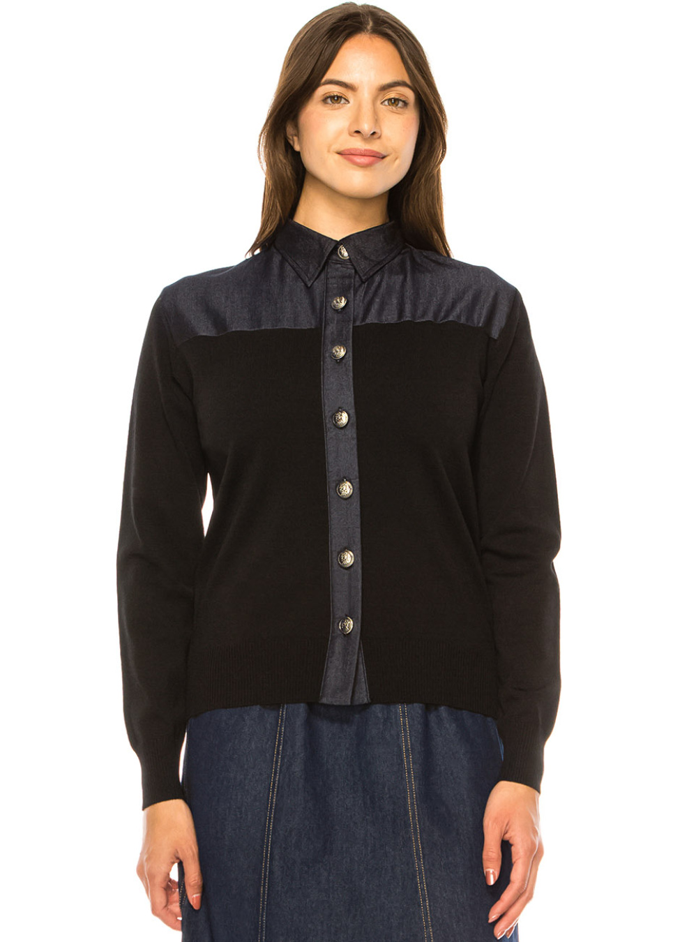 Denim-Trimmed Button-Up Cardigan - Classic Black