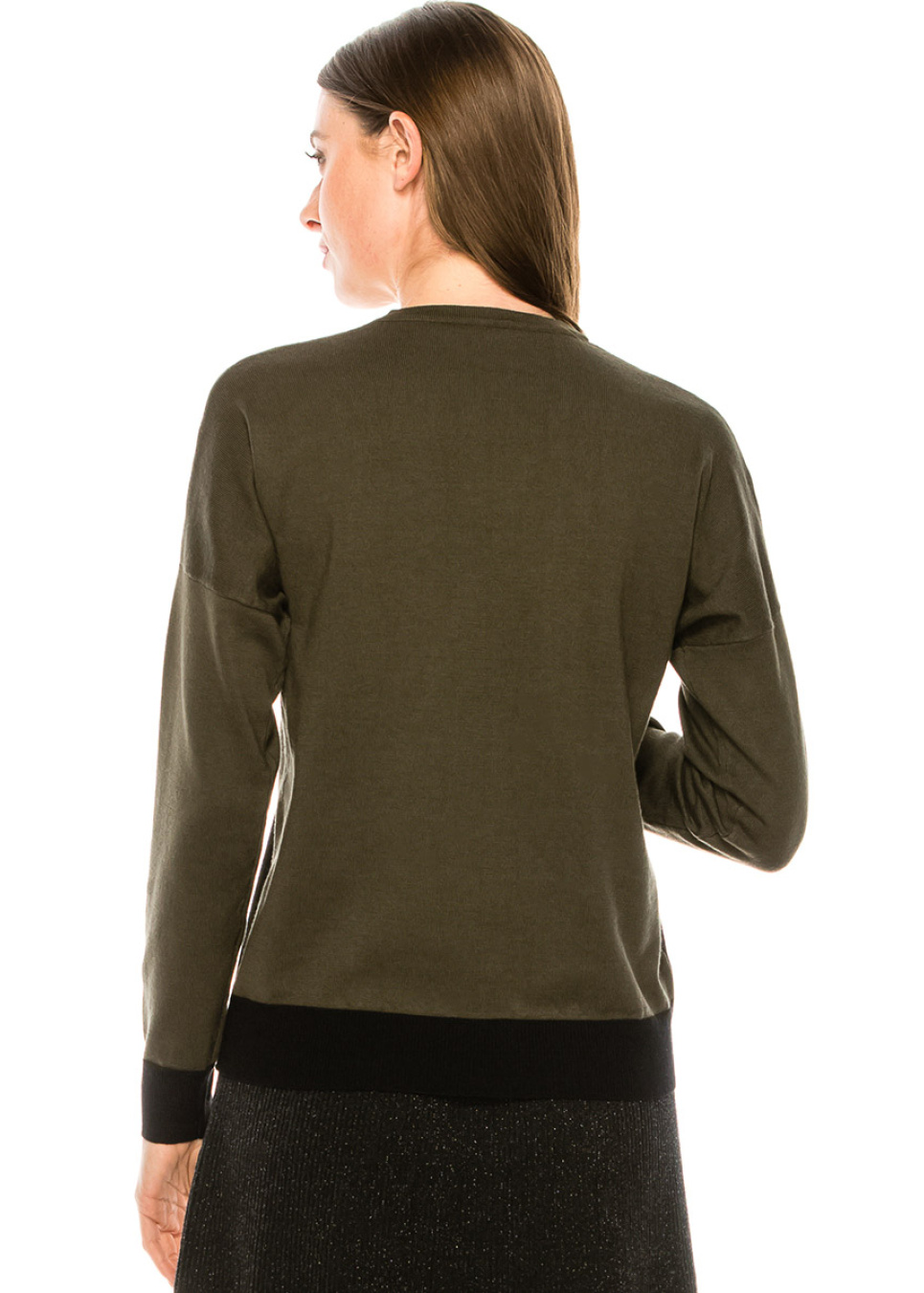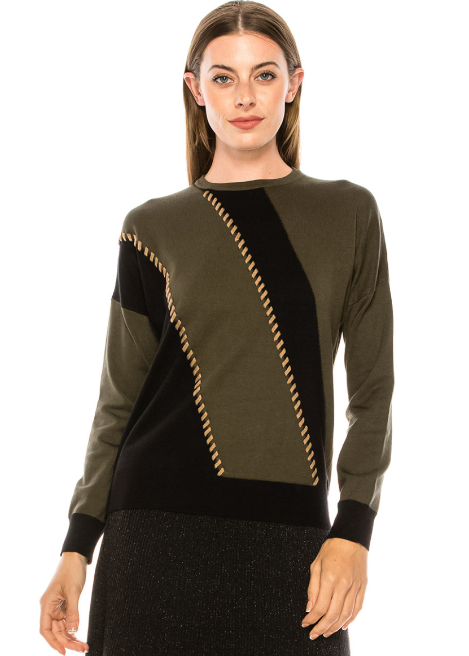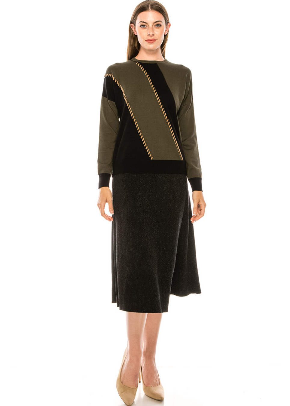 This crew neck sweater features rich olive color and a diagonal striped design. Stitches make the item stylish, giving it casual vibes. Ribbed cuffs and hem save the warmth inside and provide extra comfort for chilly days.