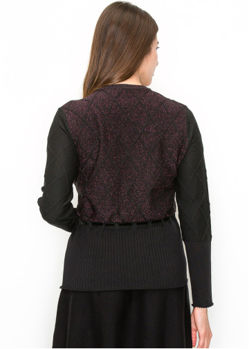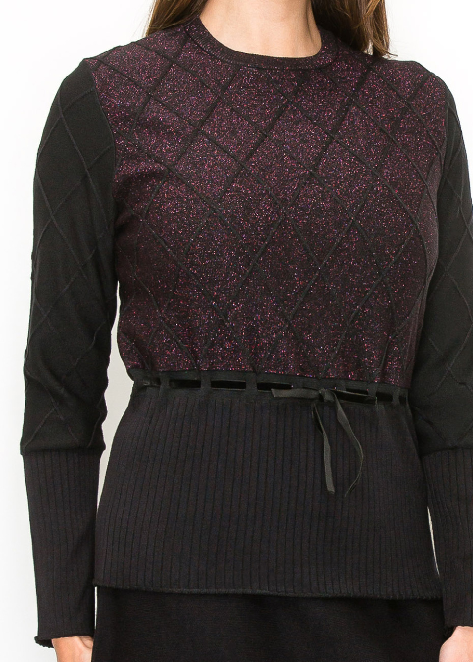 Add a bit of sparkle to your wardrobe with this elegant knit top. The burgundy diamond pattern gives a subtle shine, while the ribbed texture at the waist and tie detail complete the look. It’s an ideal choice for modest, refined style without sacrificing comfort.