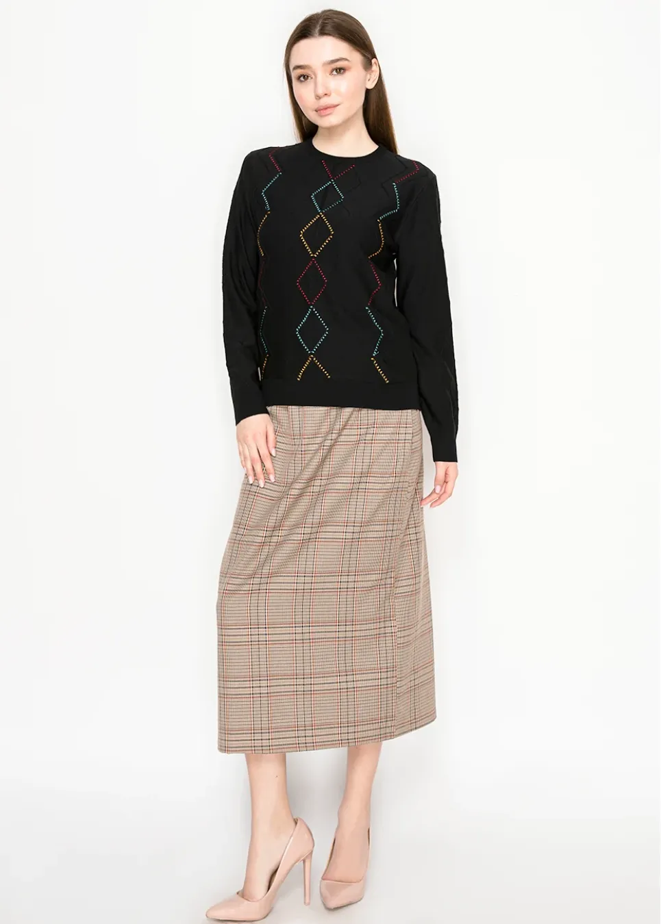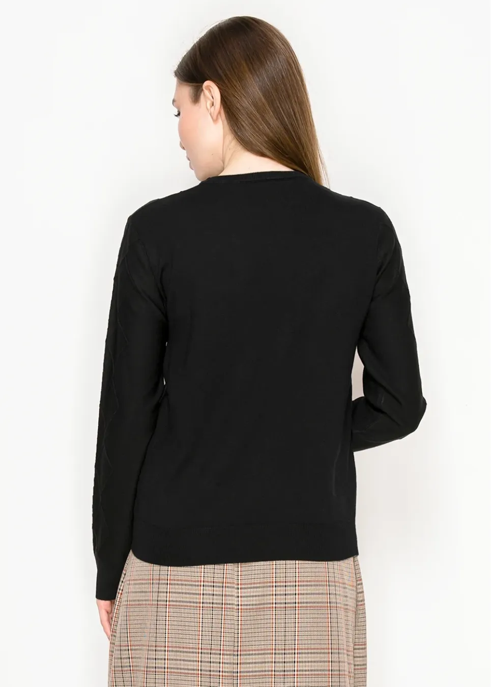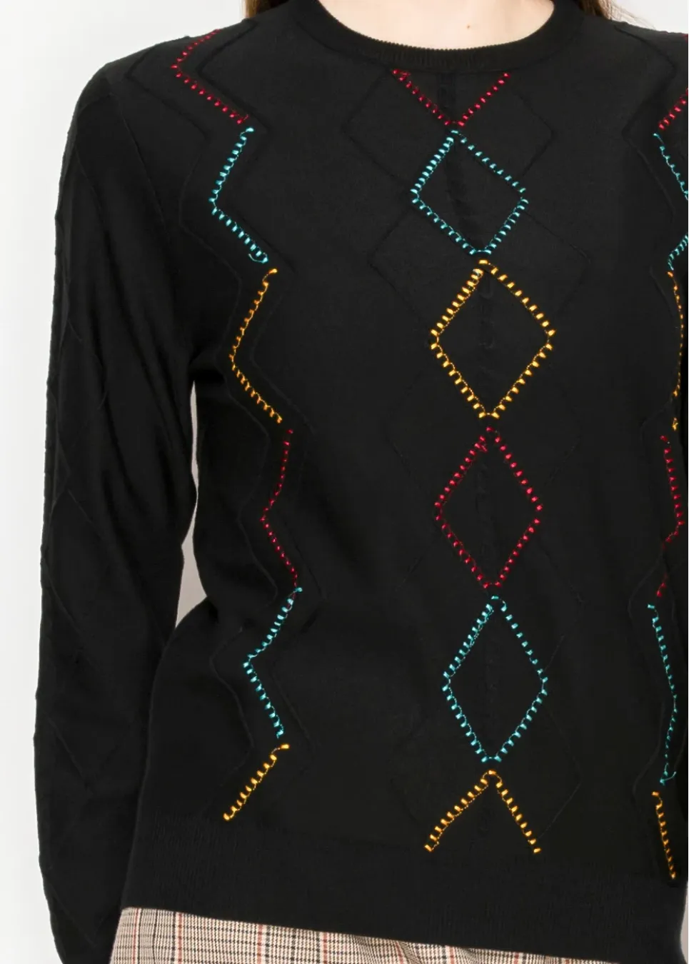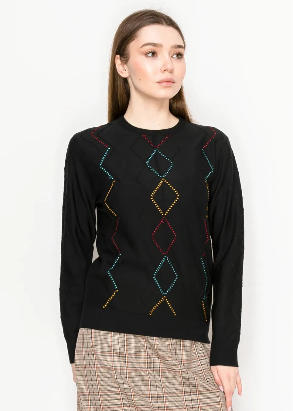 Graphic-inspired embroidery brings edge to this sleek black knit. A fresh take on geometric design, it moves from office to off-duty with ease.