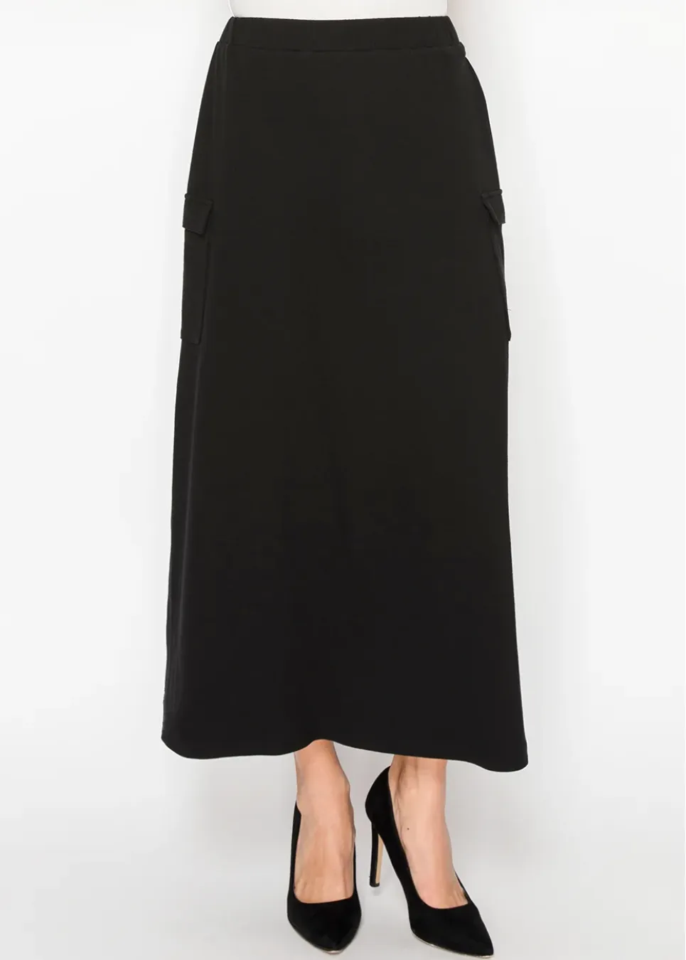 Stay stylish and comfortable in this black knit skirt. The side pockets provide a practical detail, while the soft, stretchy material ensures a flattering fit. Whether you’re dressing it up with heels or keeping it casual with flats, this skirt is a go-to piece for everyday modest style.