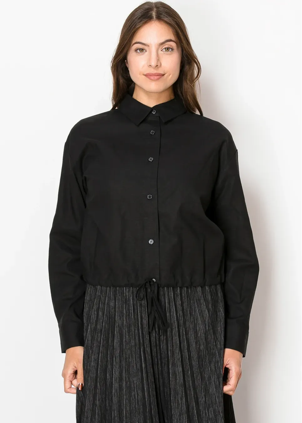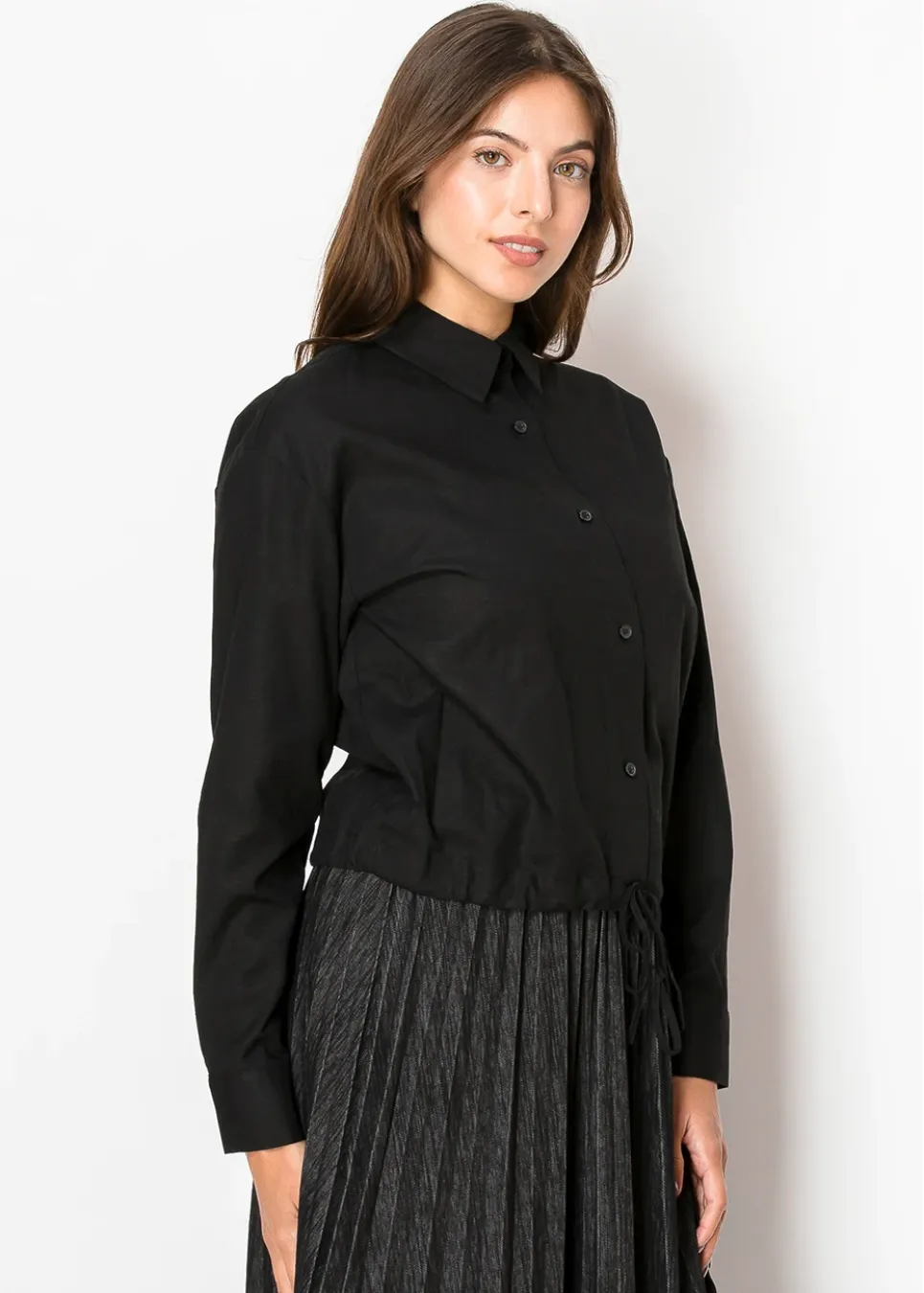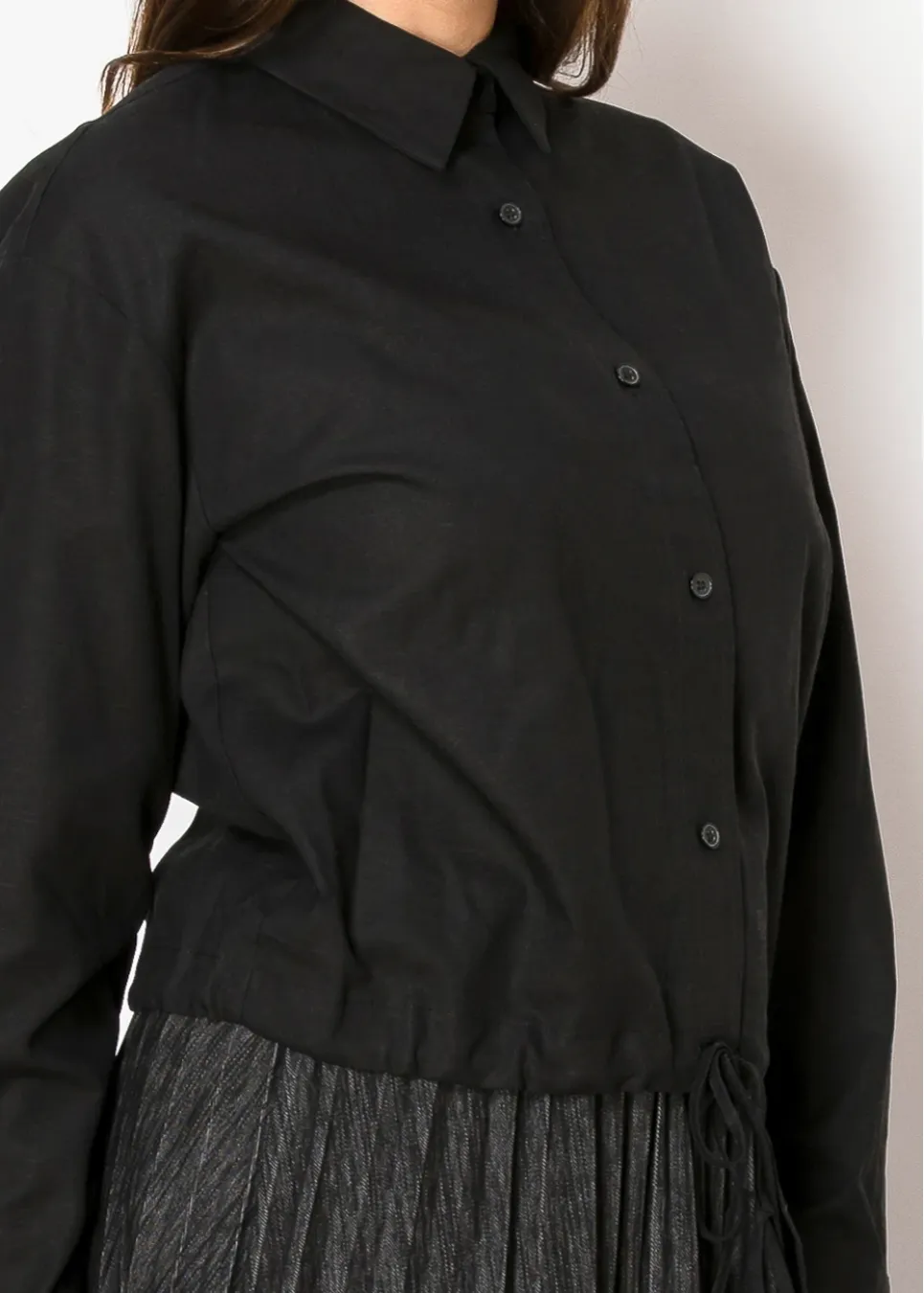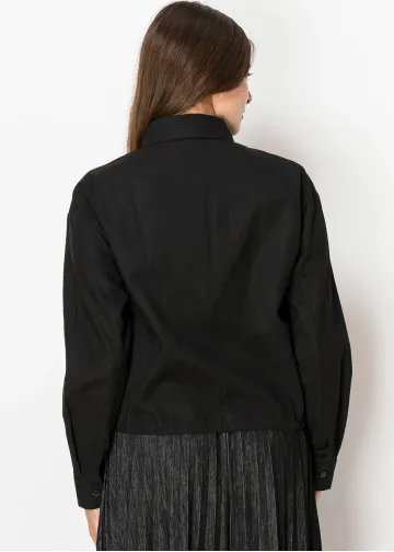 A blend of practicality and style, this blouse is a closet essential. The lightweight linen fabric keeps things cool, while the drawstring hem allows you to play with the silhouette—cinch it for a more tailored look or leave it loose for an easygoing vibe. Subtle details like buttoned cuffs and a sleek black tone make it effortlessly versatile.