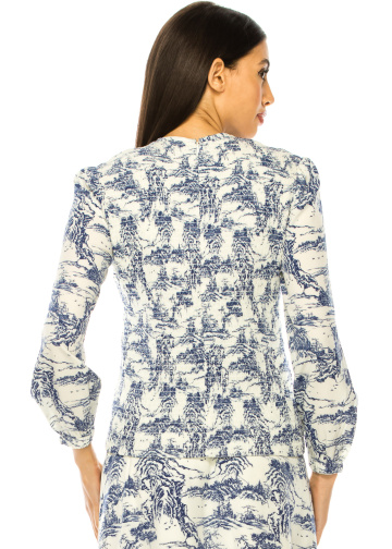 Bring a touch of elegance and romance to your wardrobe with this stunning chiffon top. The toile print and smocked bodice create a unique and feminine look, while the blouson sleeves with elastic cuffs and zipper back closure add a modern touch. Perfect for dressing up or down, this top is a versatile addition to any wardrobe.