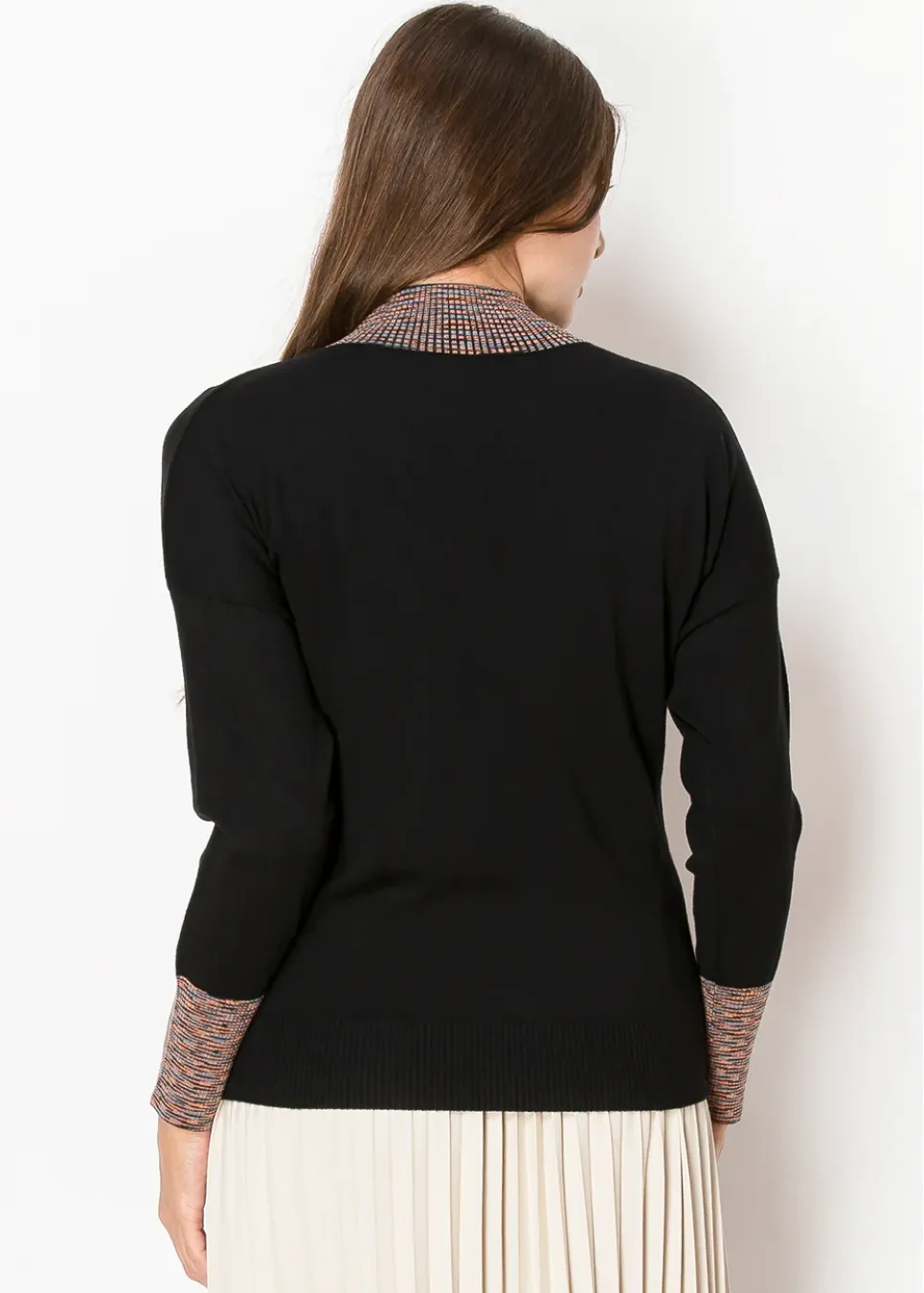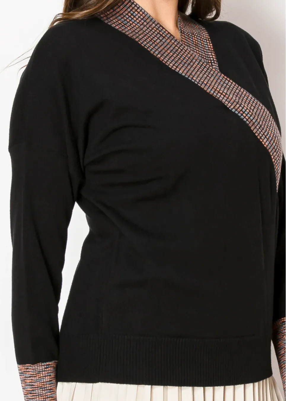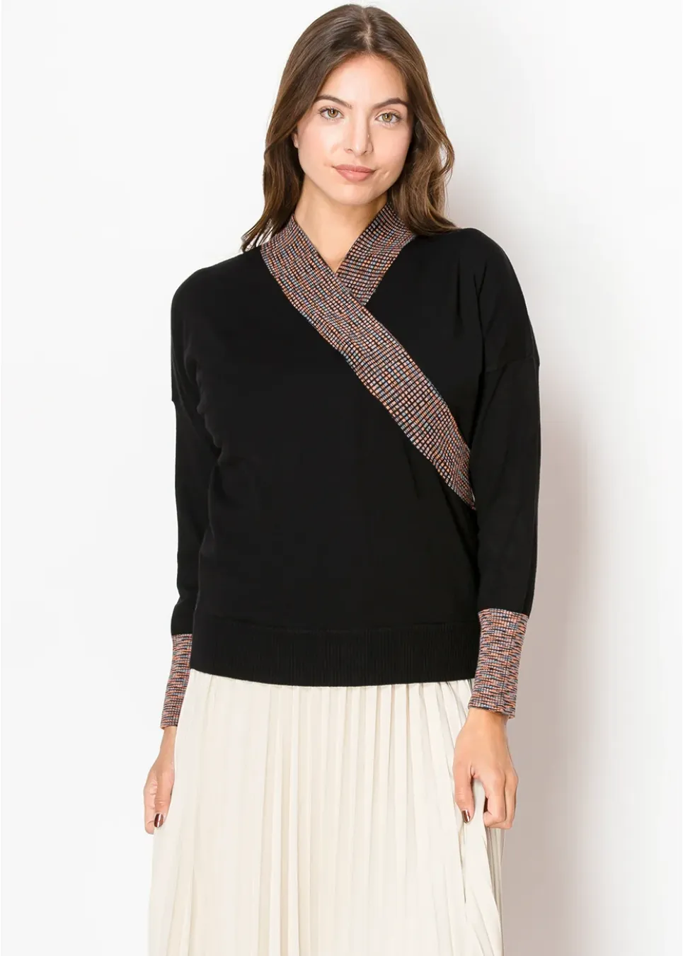 A versatile black sweater with a graceful V-wrap neckline and delicate patterned trim. The soft knit fabric offers all-day comfort, and the decorative accents make it a standout choice for modest wardrobes.