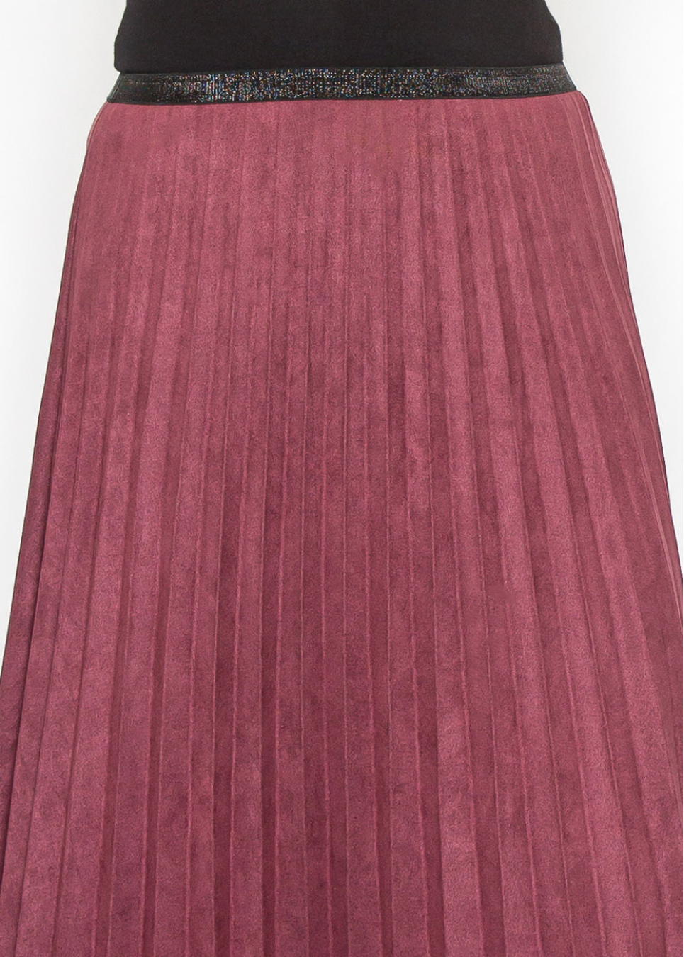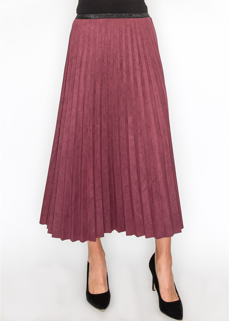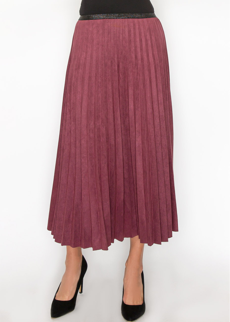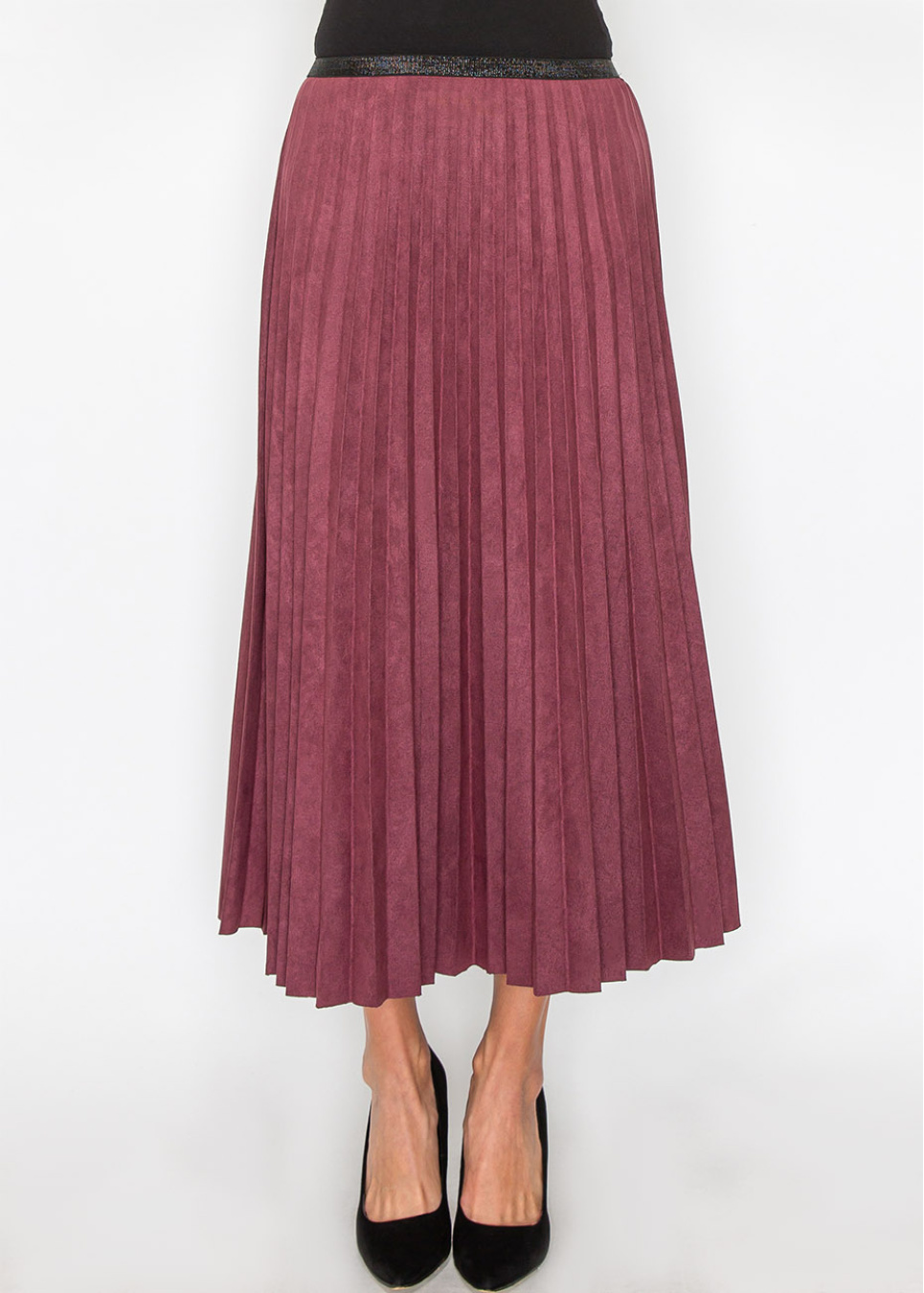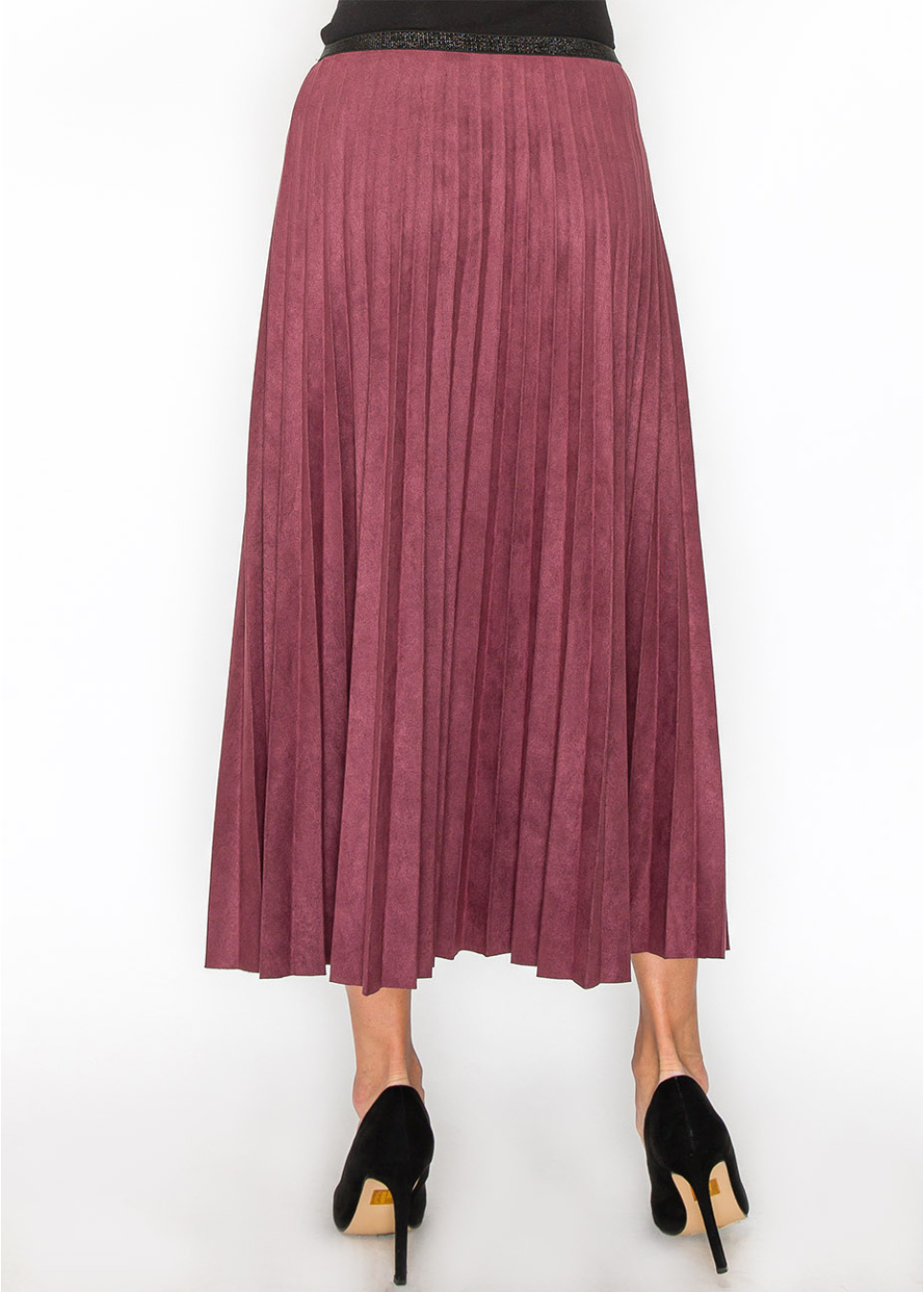 Sophisticated yet simple, this elegant burgundy suede midi skirt features soft pleats that flow gracefully with every step. The rich suede texture adds warmth and depth to your wardrobe, making it a versatile piece that’s easy to mix and match with different tops and shoes.