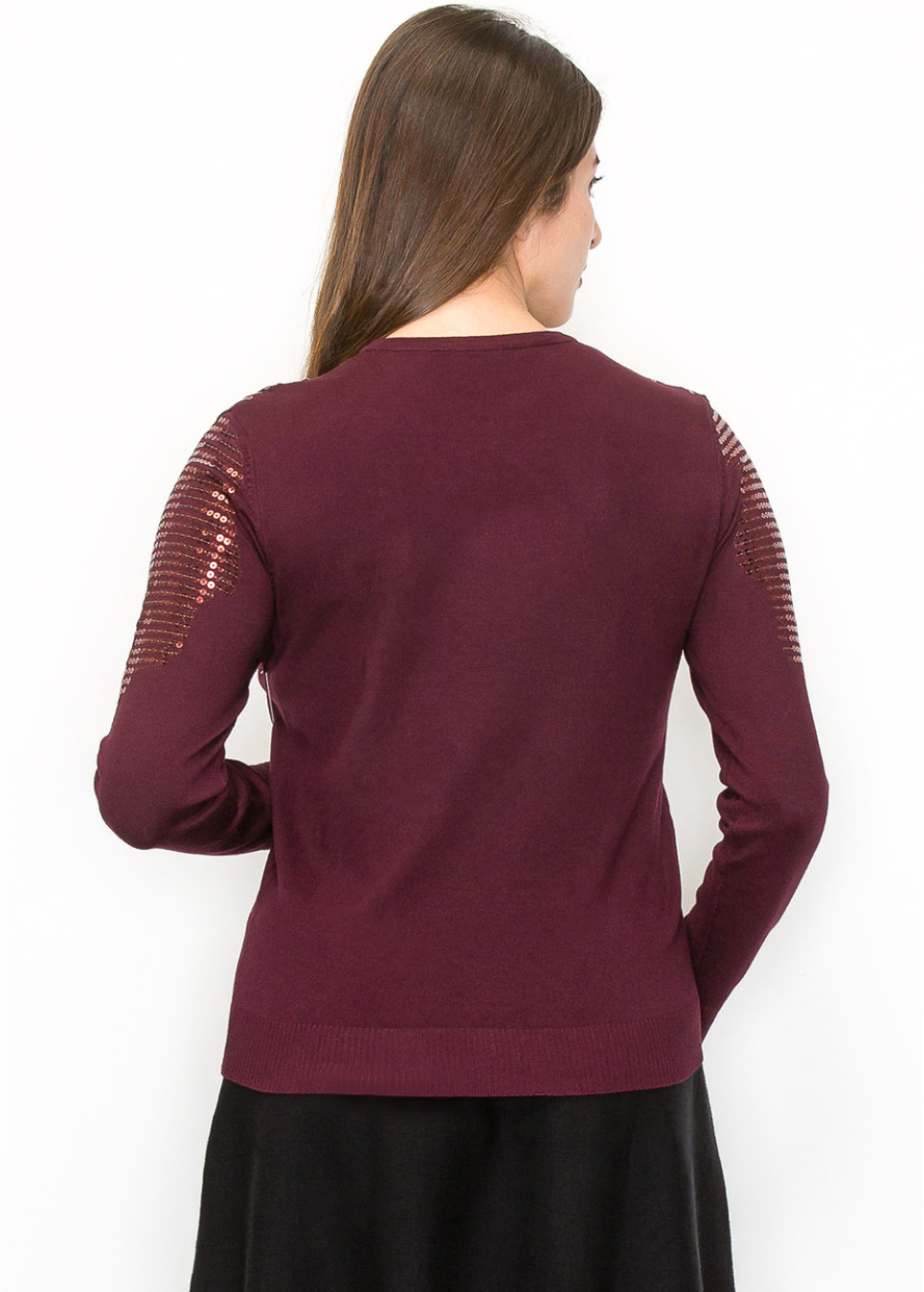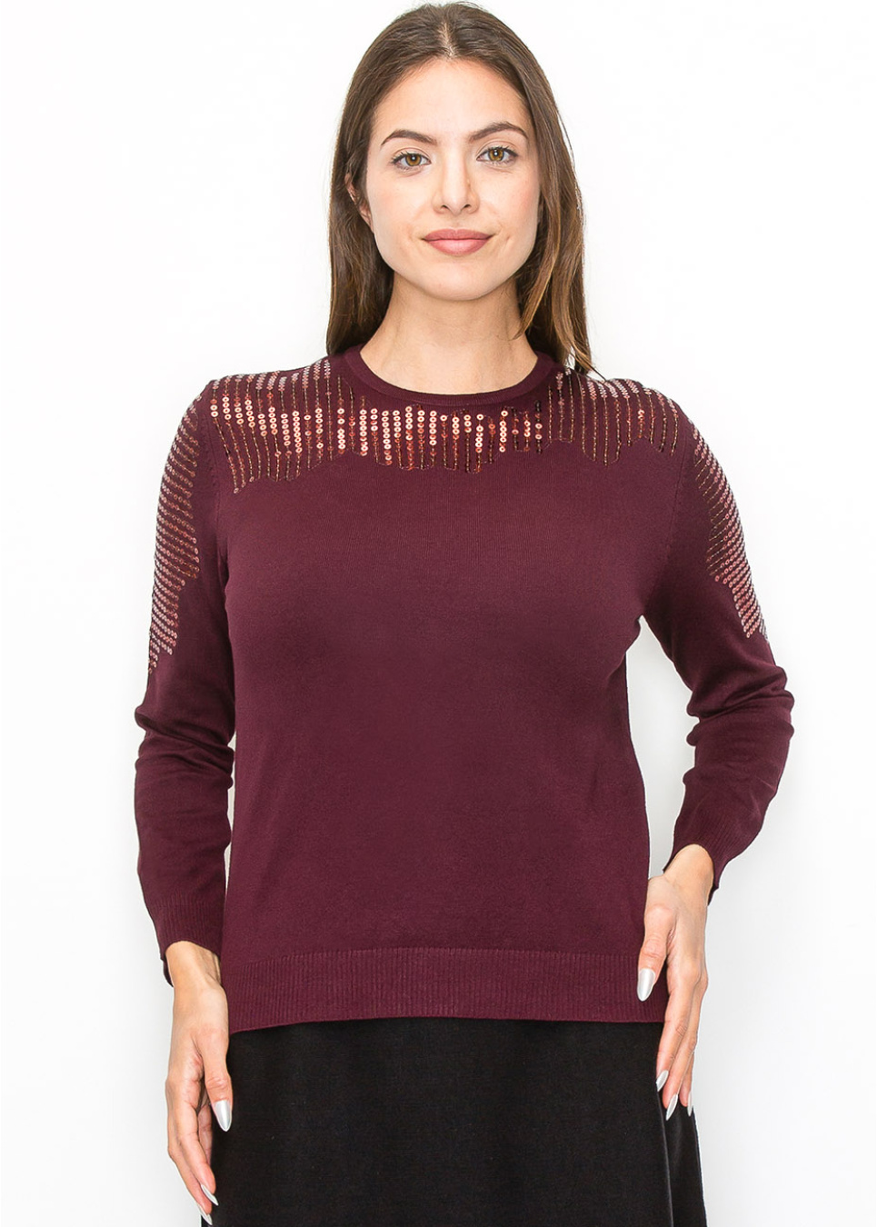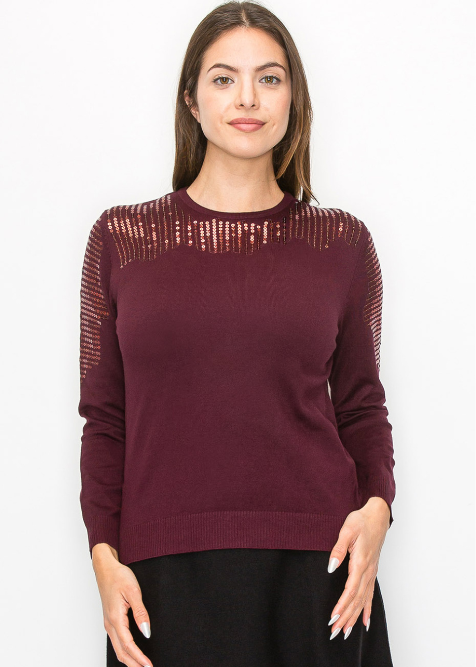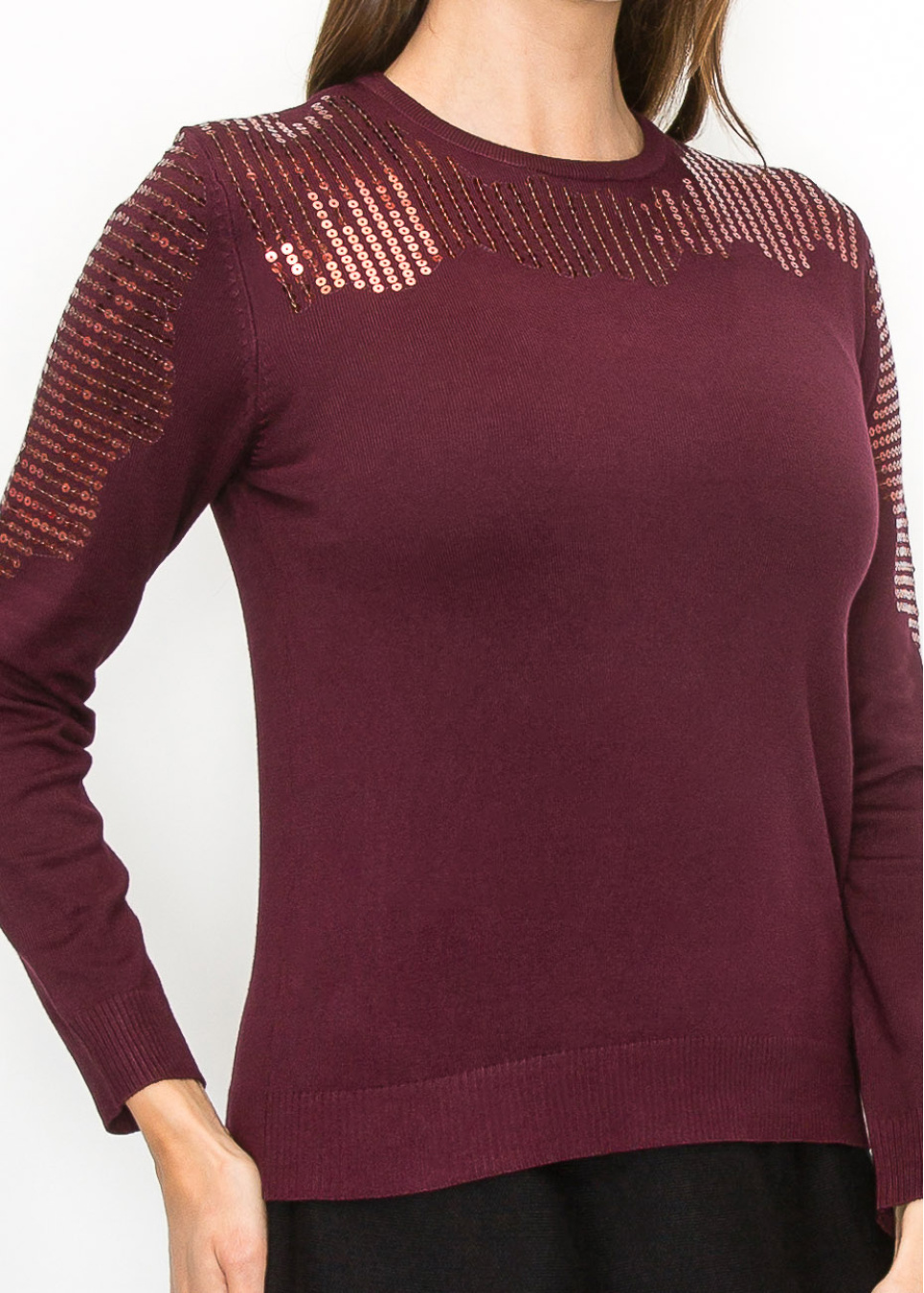 Stand out in a subtle way with this burgundy sweater, featuring sequin highlights on the shoulders. The soft fabric and classic silhouette make it a comfortable and versatile choice, perfect for adding a touch of elegance to your everyday style.