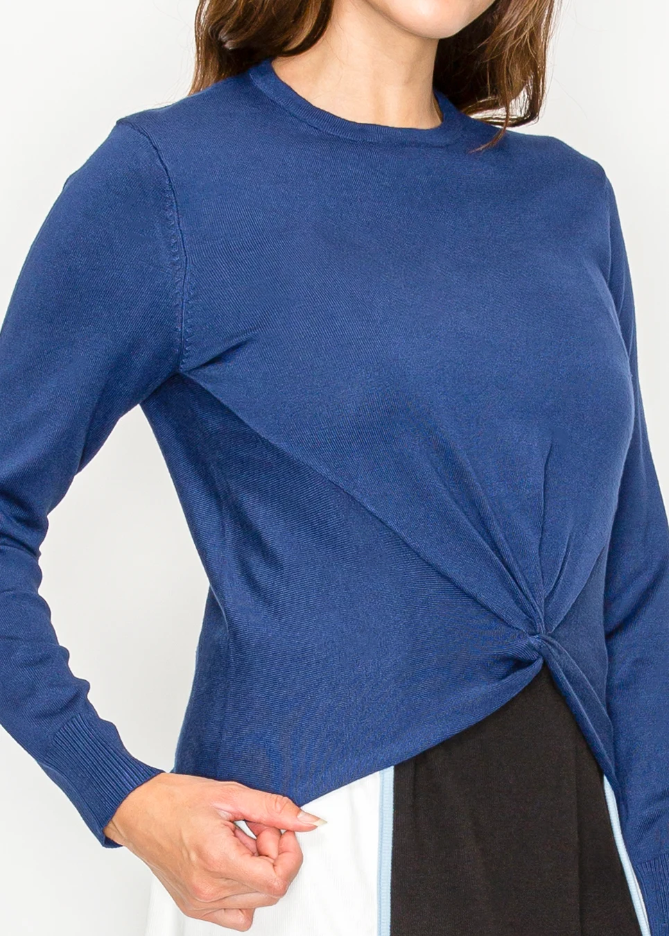 A polished blue knit top with a clean crew neckline and a subtle front twist that naturally flatters the waist. Lightweight and smooth to the touch, it layers beautifully and feels effortless from morning to evening.