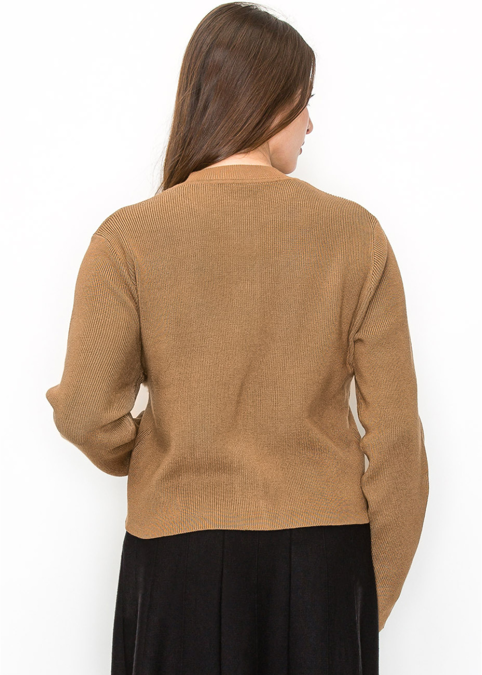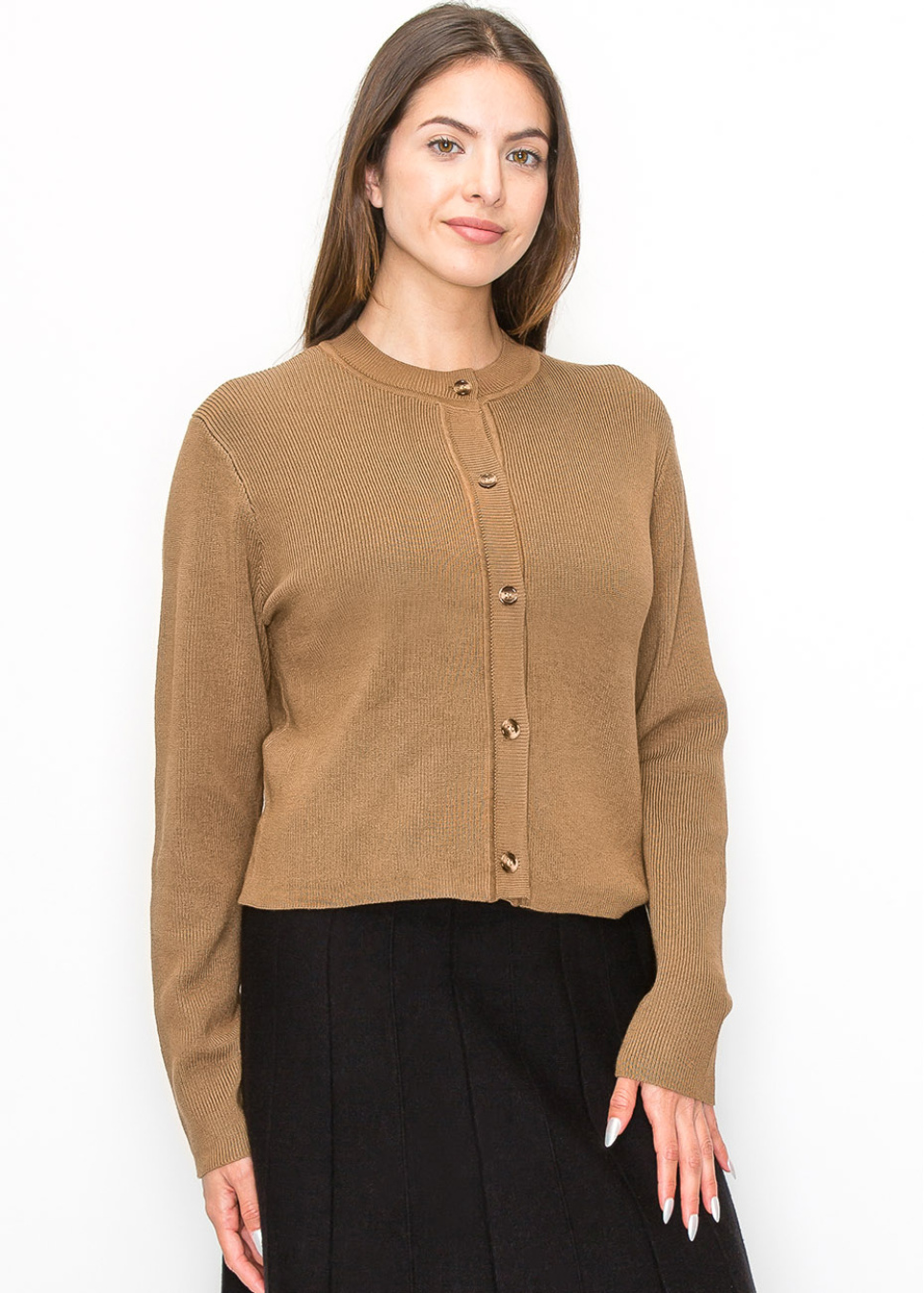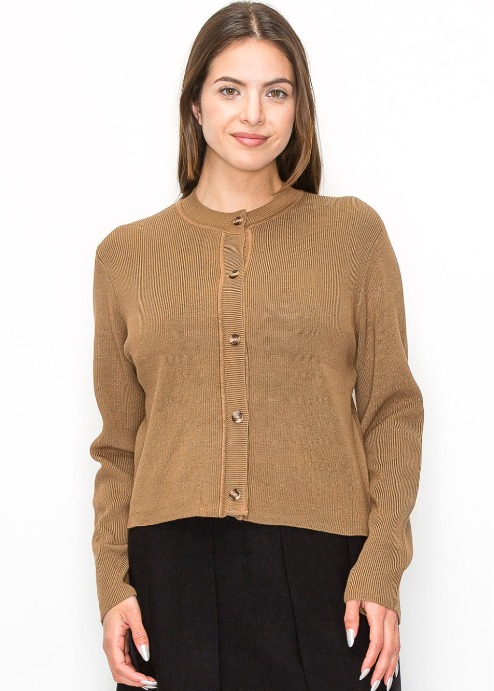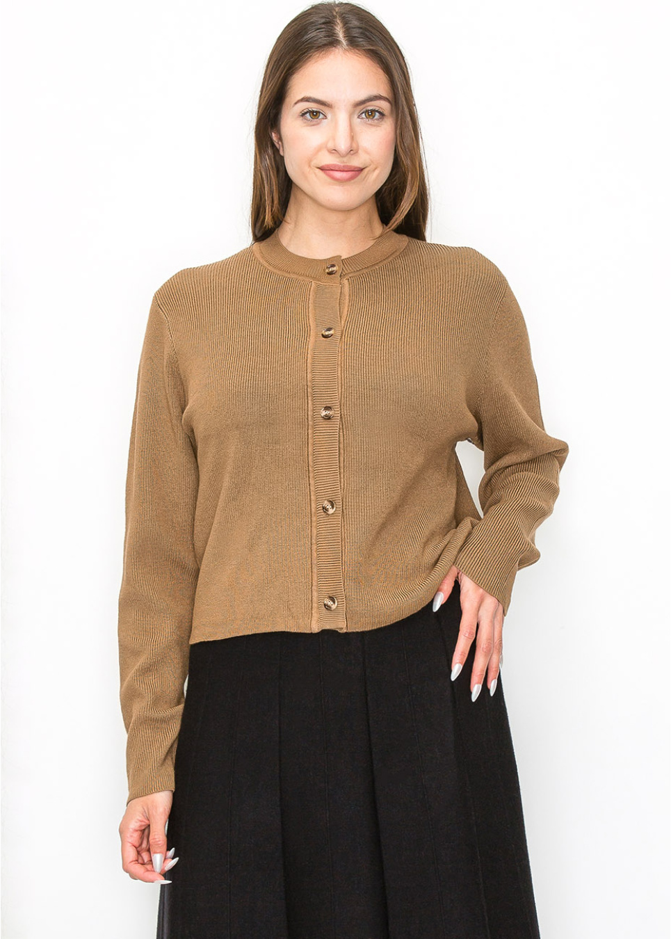 Add a touch of elegance to your outfit with this ribbed camel cardigan. The button-up style is both functional and stylish, making it easy to transition from day to night. The warm, earthy tone complements a wide range of outfits, making it a versatile addition to your wardrobe.