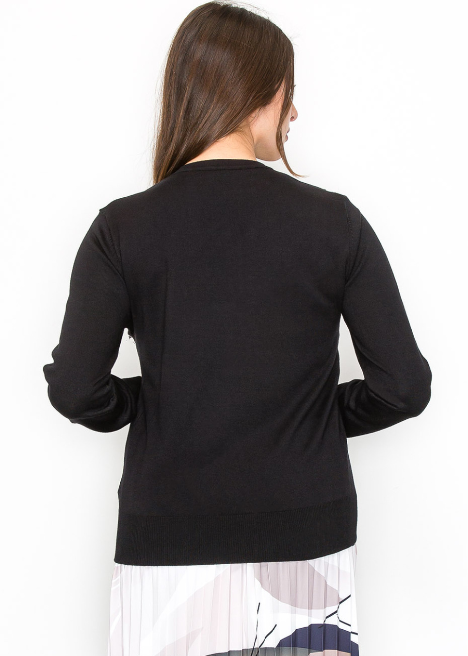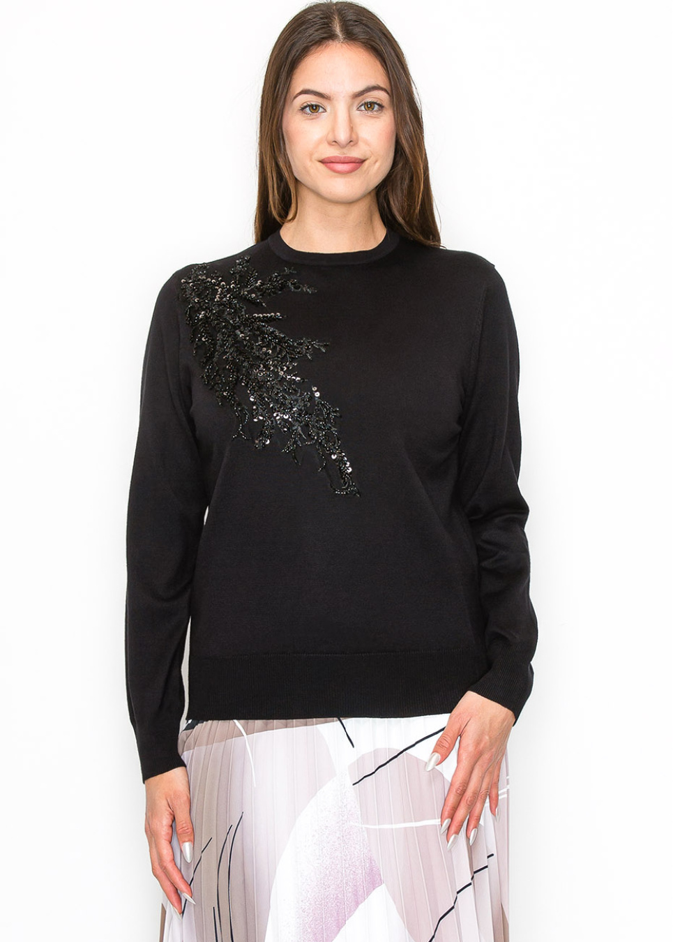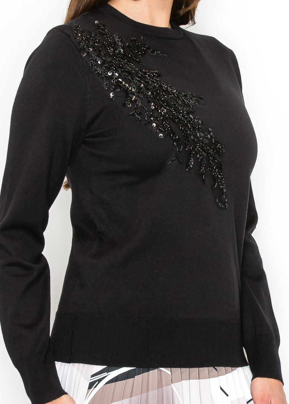 Make a subtle statement with this elegant black sweater, adorned with delicate beading on the shoulder. The design adds just the right amount of sparkle without being overpowering. It’s the perfect piece to dress up or down, offering versatility for any occasion while maintaining a modest and chic look.