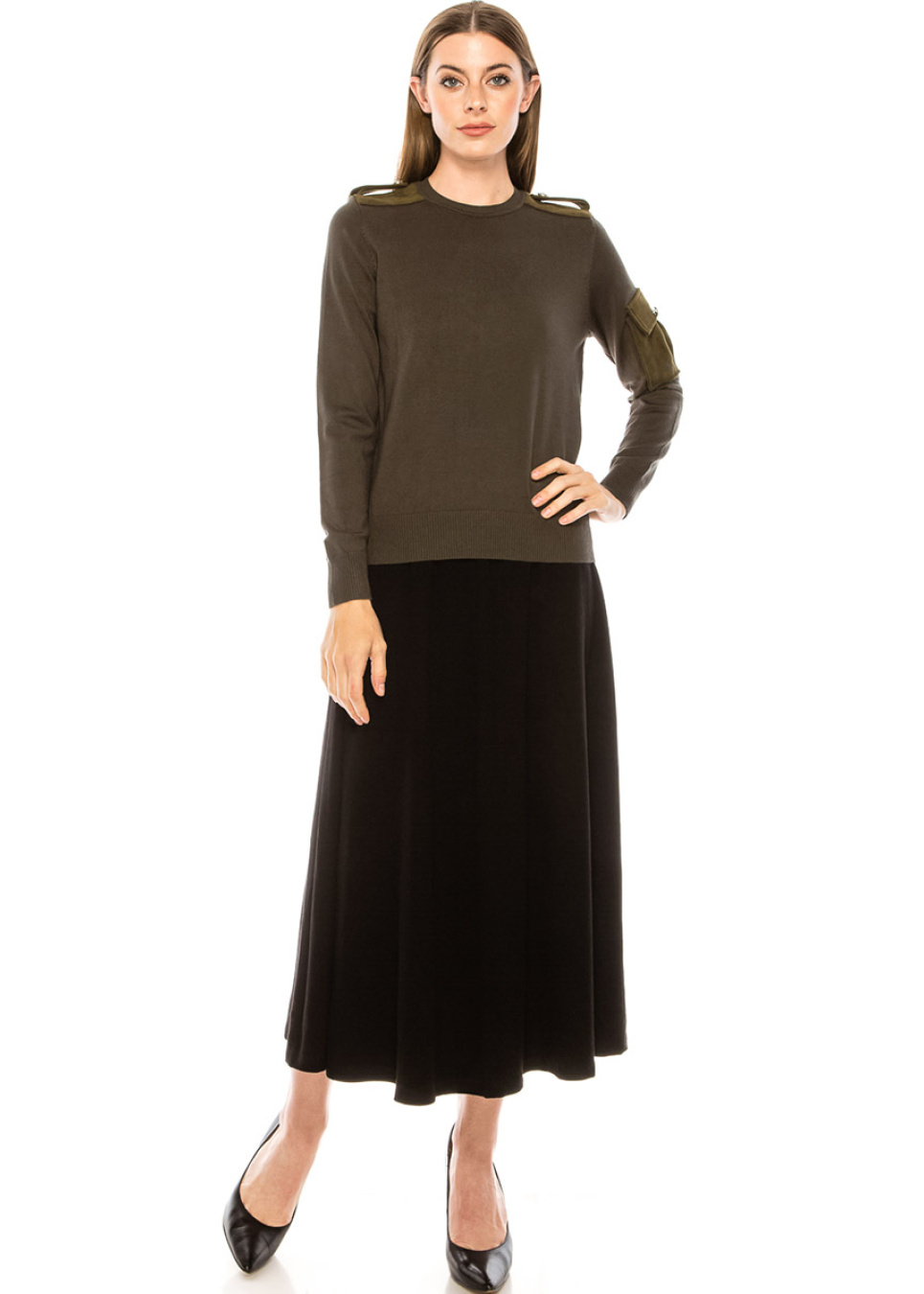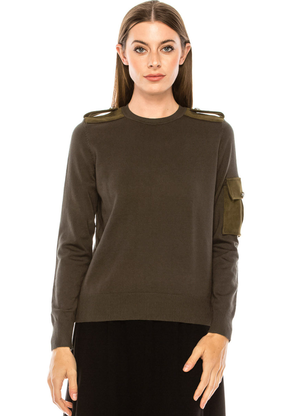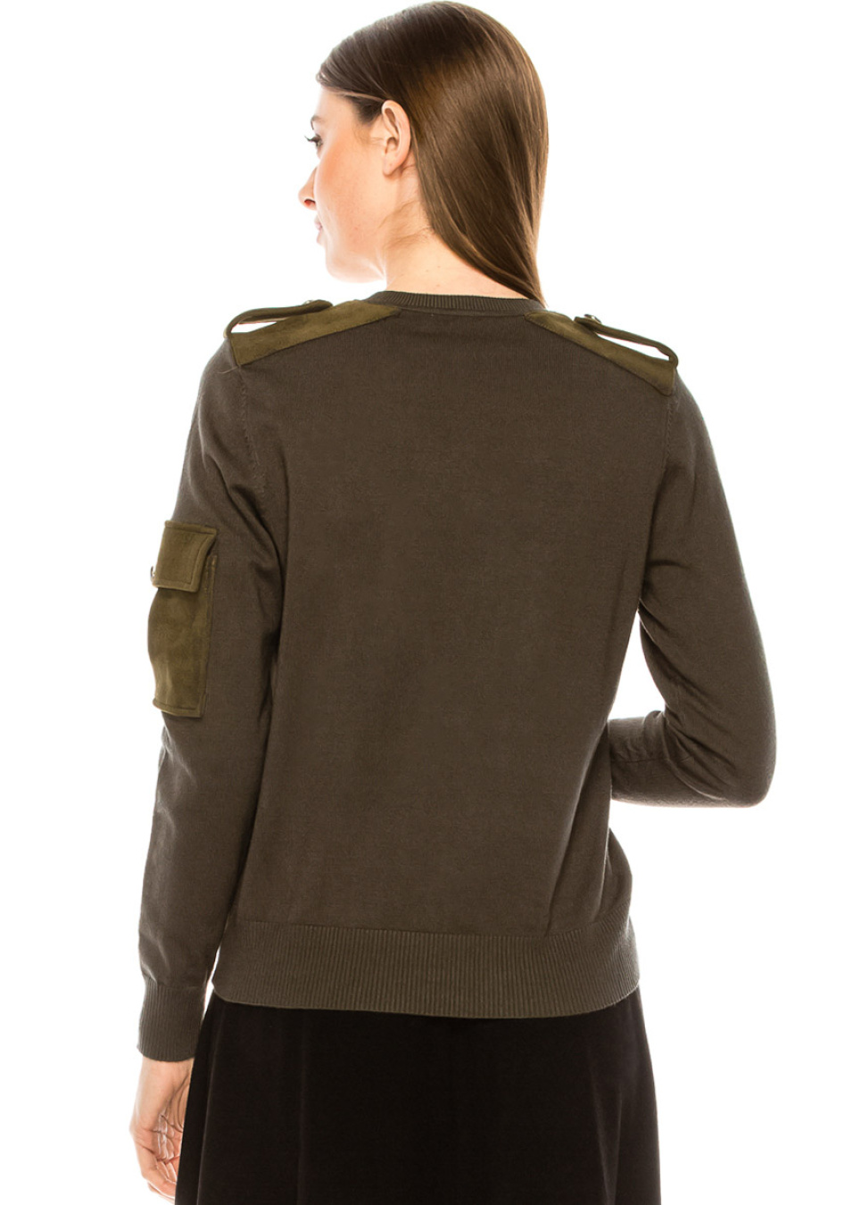 Olive color, epaulettes and a sleeve patch pocket add military style details to this sweater. Relaxed fit and ribbed edges ensure perfect fit and comfort. The sweater is made of high-quality materials, warm and pleasant to the body.