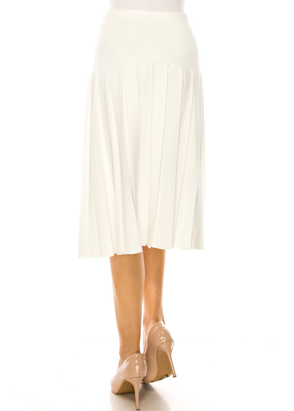 This elegant white skirt has a structured waist and graceful folds, which enhance its flattering shape and provide a comfortable fit. Its classic design and neutral color give it versatility, allowing you to pair it with a variety of tops, whether for casual or formal occasions.