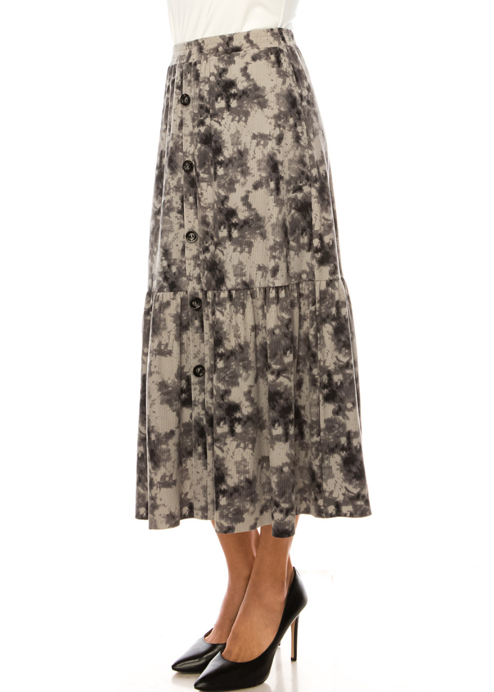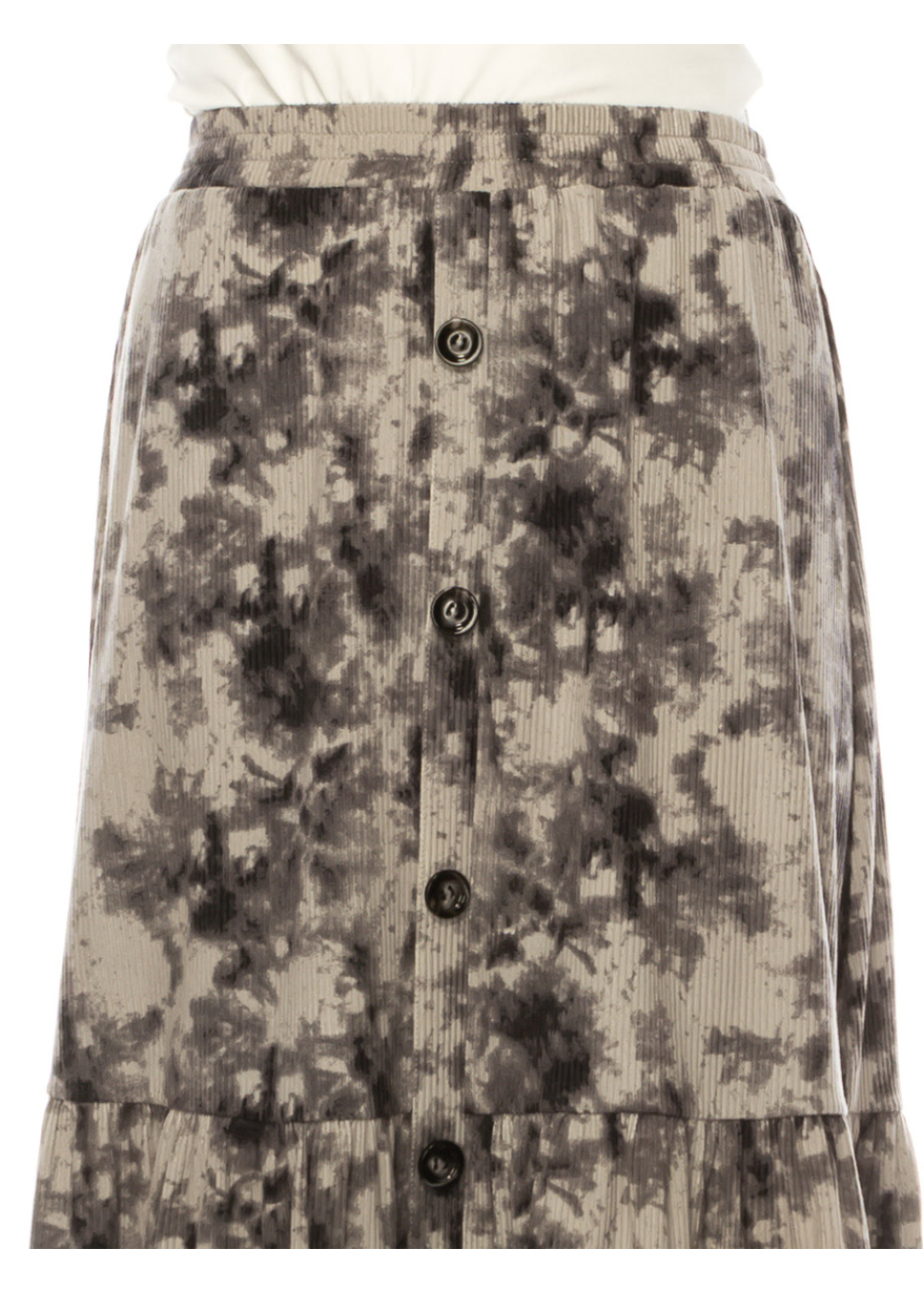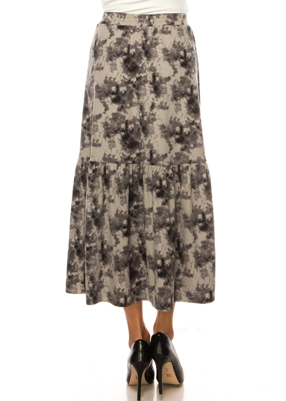 Try something new with this bold grey abstract print skirt. The flared hem adds playfulness to your outfit, while the abstract print expresses your individuality. This skirt is also available as a set with a matching knit top, perfect for those looking to push fashion boundaries and ignite their sense of adventure.