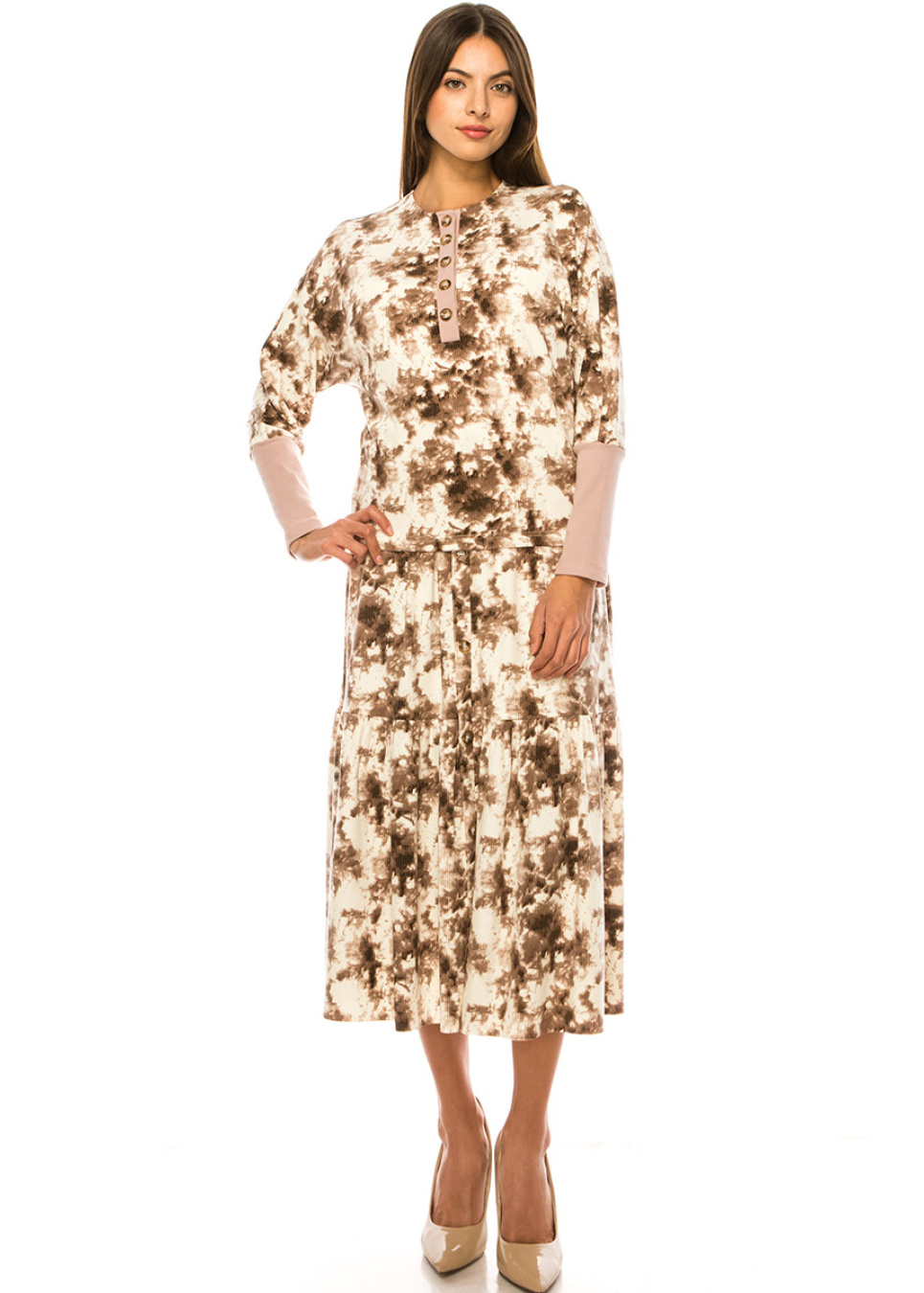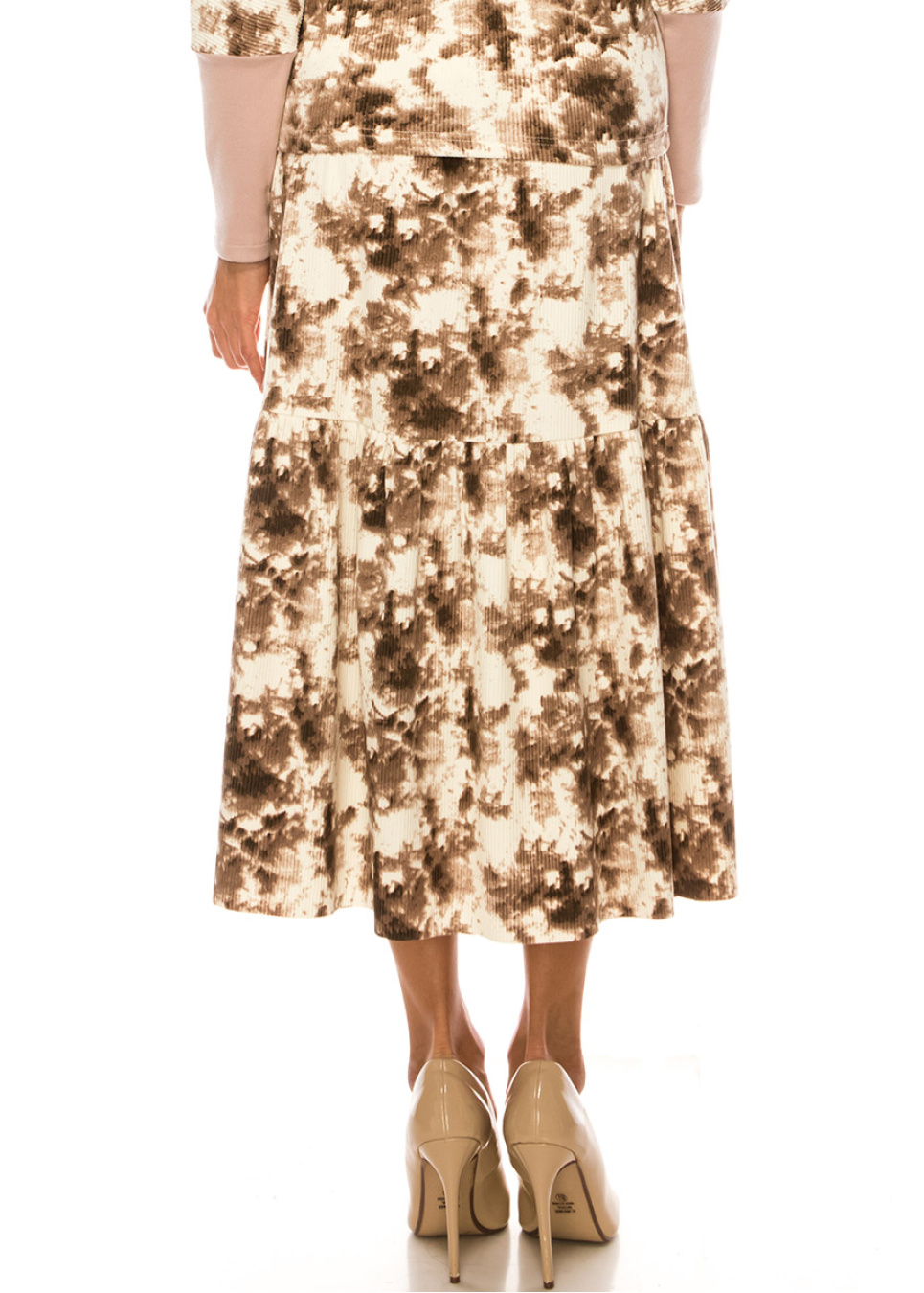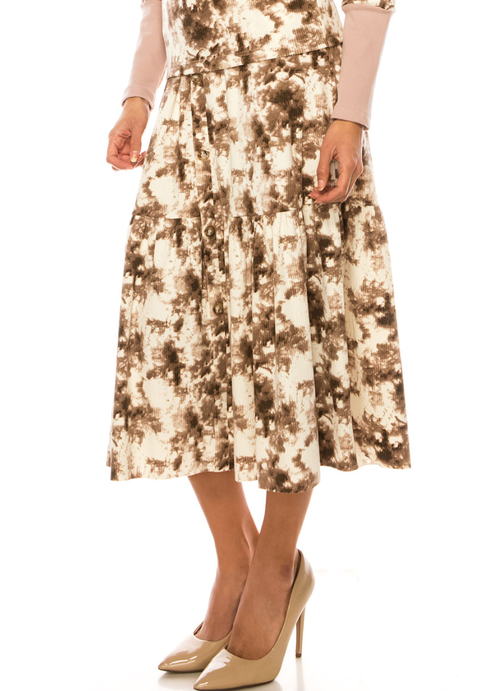 Step back in time with this stunning pink abstract print skirt and matching knit top featuring a flared hem. The vintage-inspired print and classic design create a timeless look that's perfect for any occasion, while the flared hem adds a playful touch.