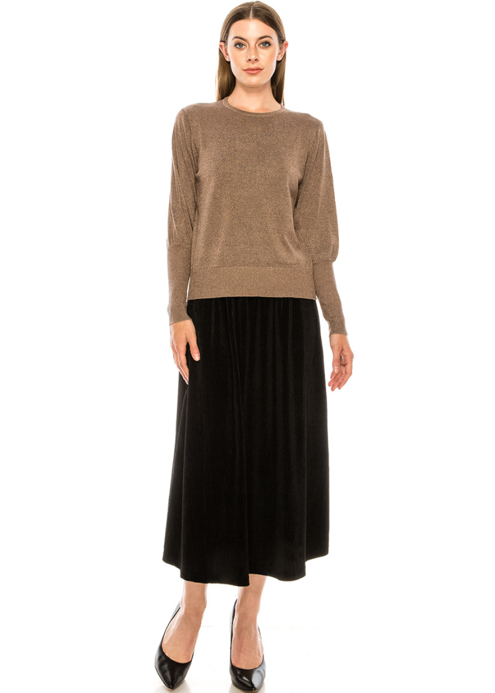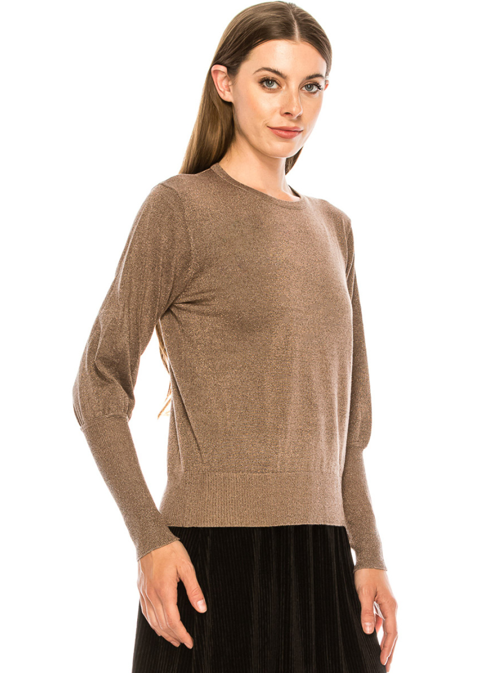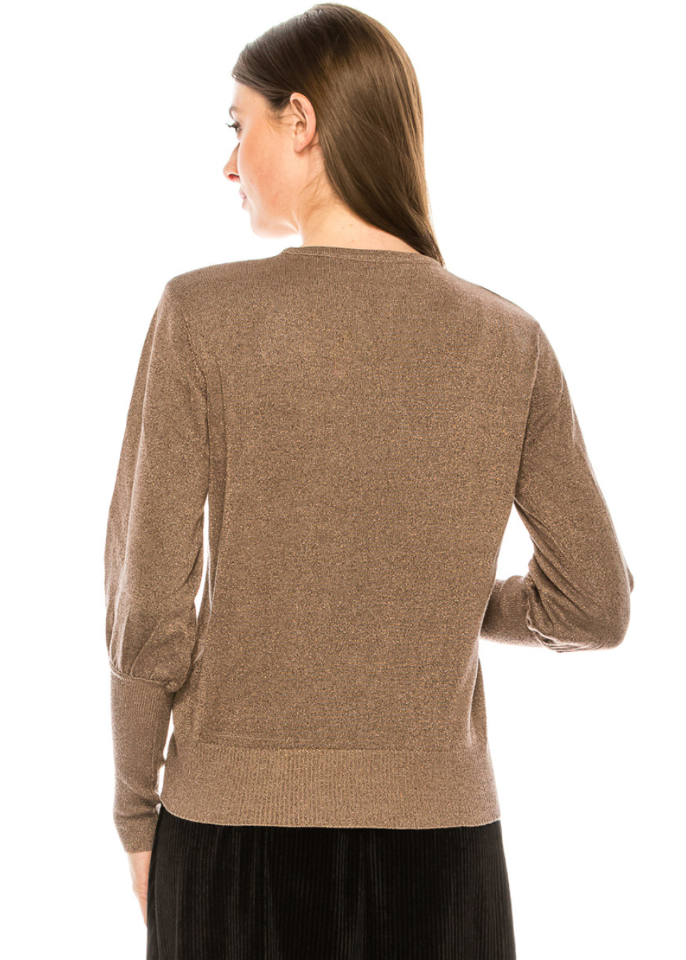 This classic sweater will blend beautifully with any element of your wardrobe. The elegant cut is complemented by the radiance of the rose lurex and high cuffs.