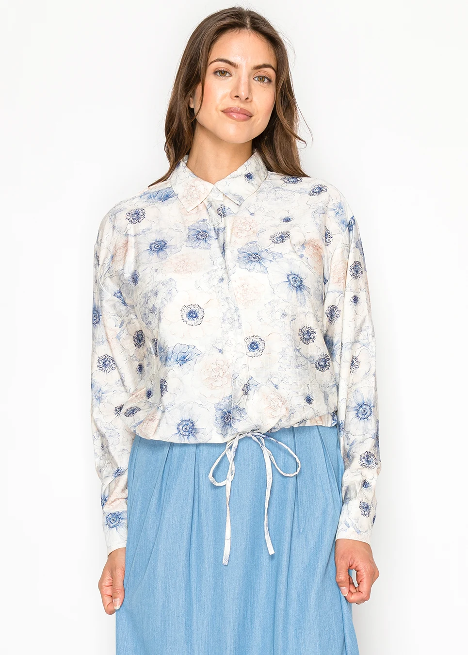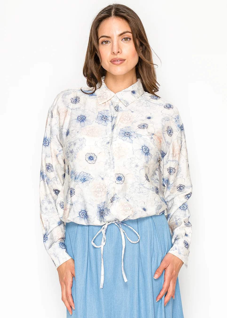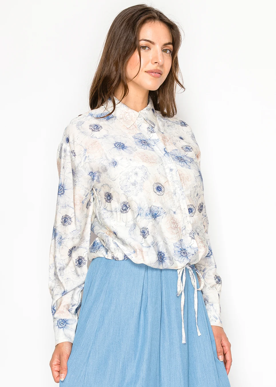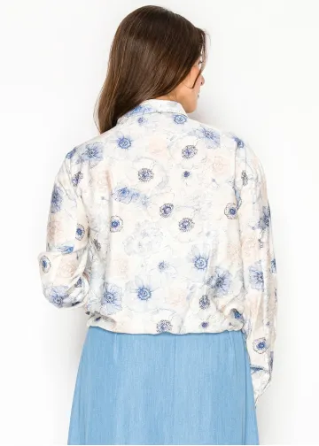 Floral Button Blouse with Drawstring Waist