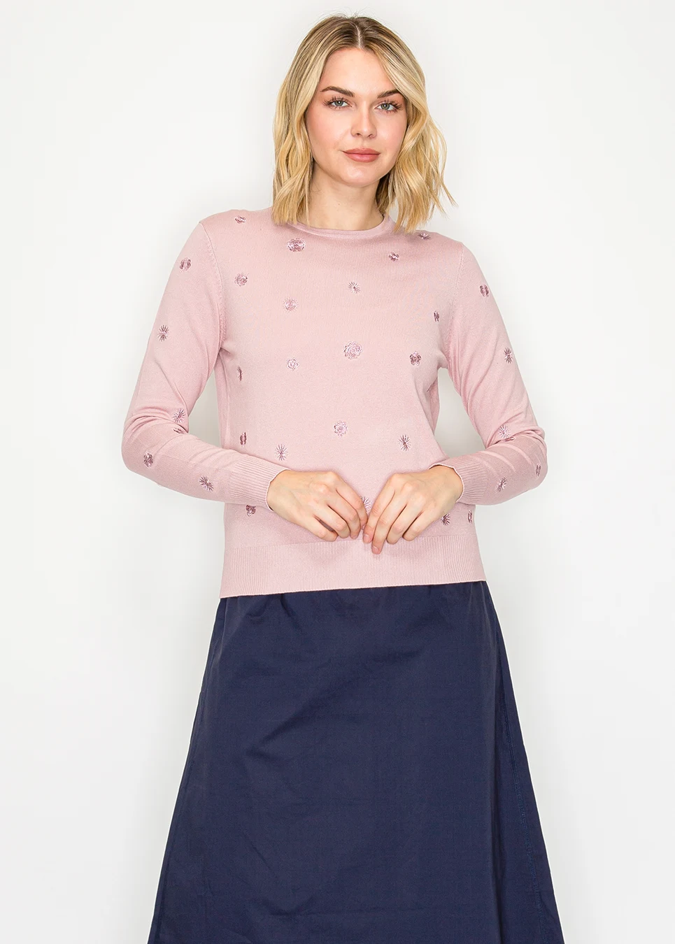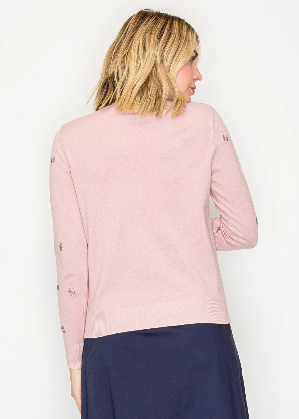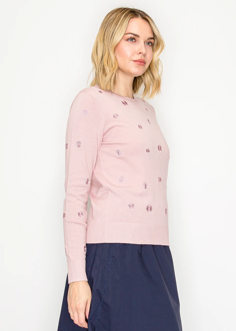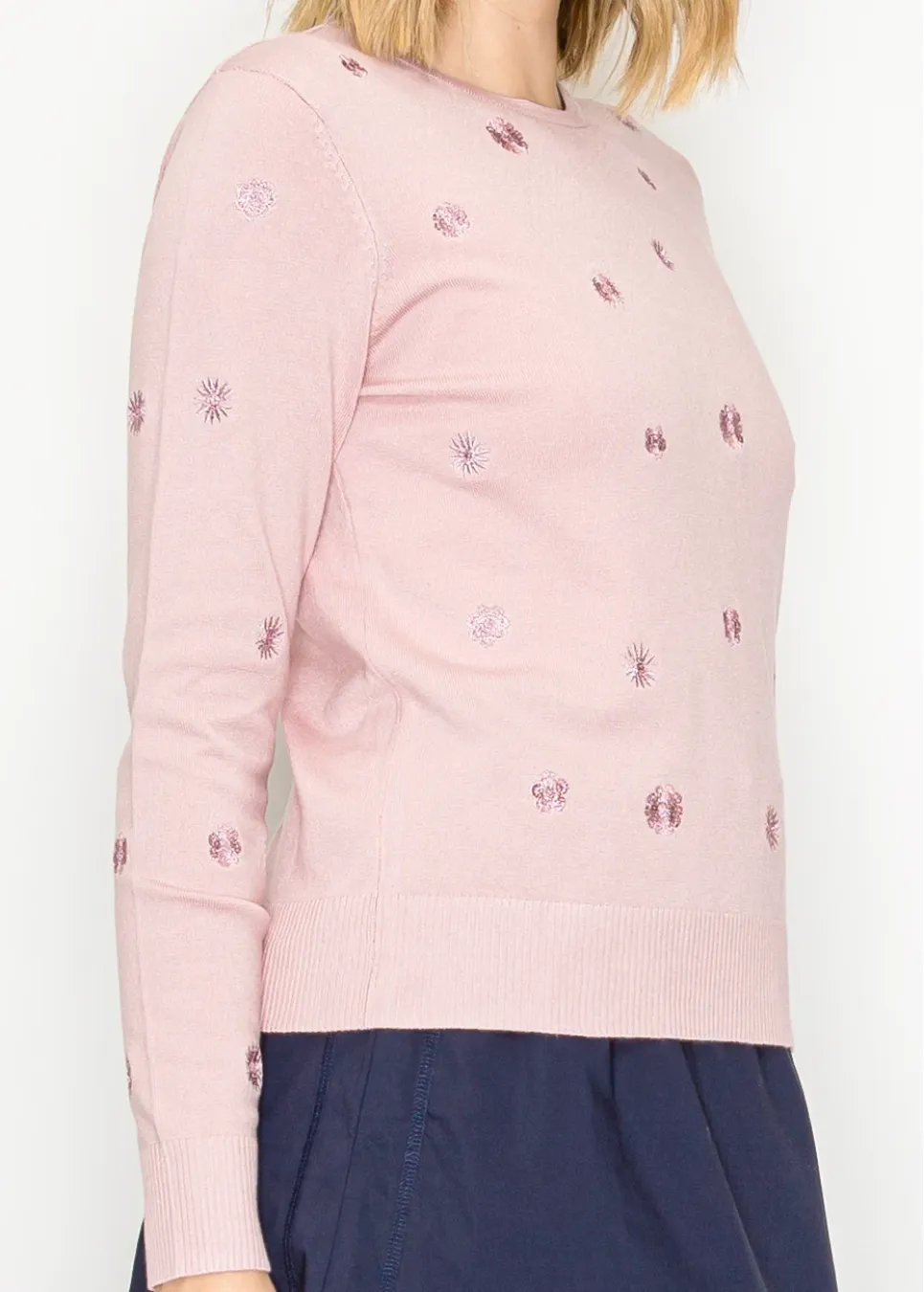 Floral embroidered knit sweater in soft pink