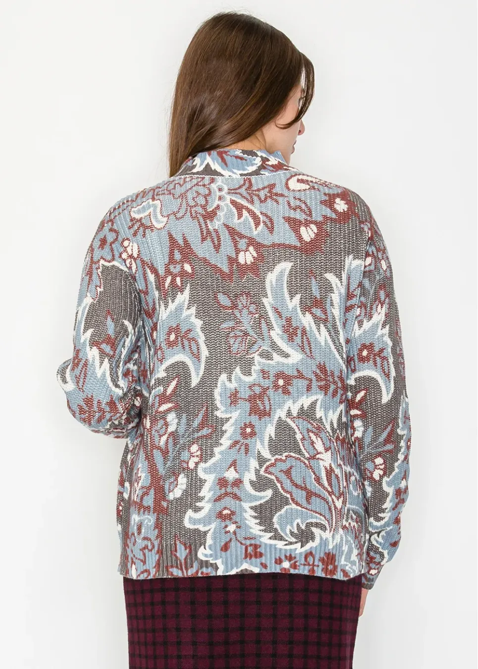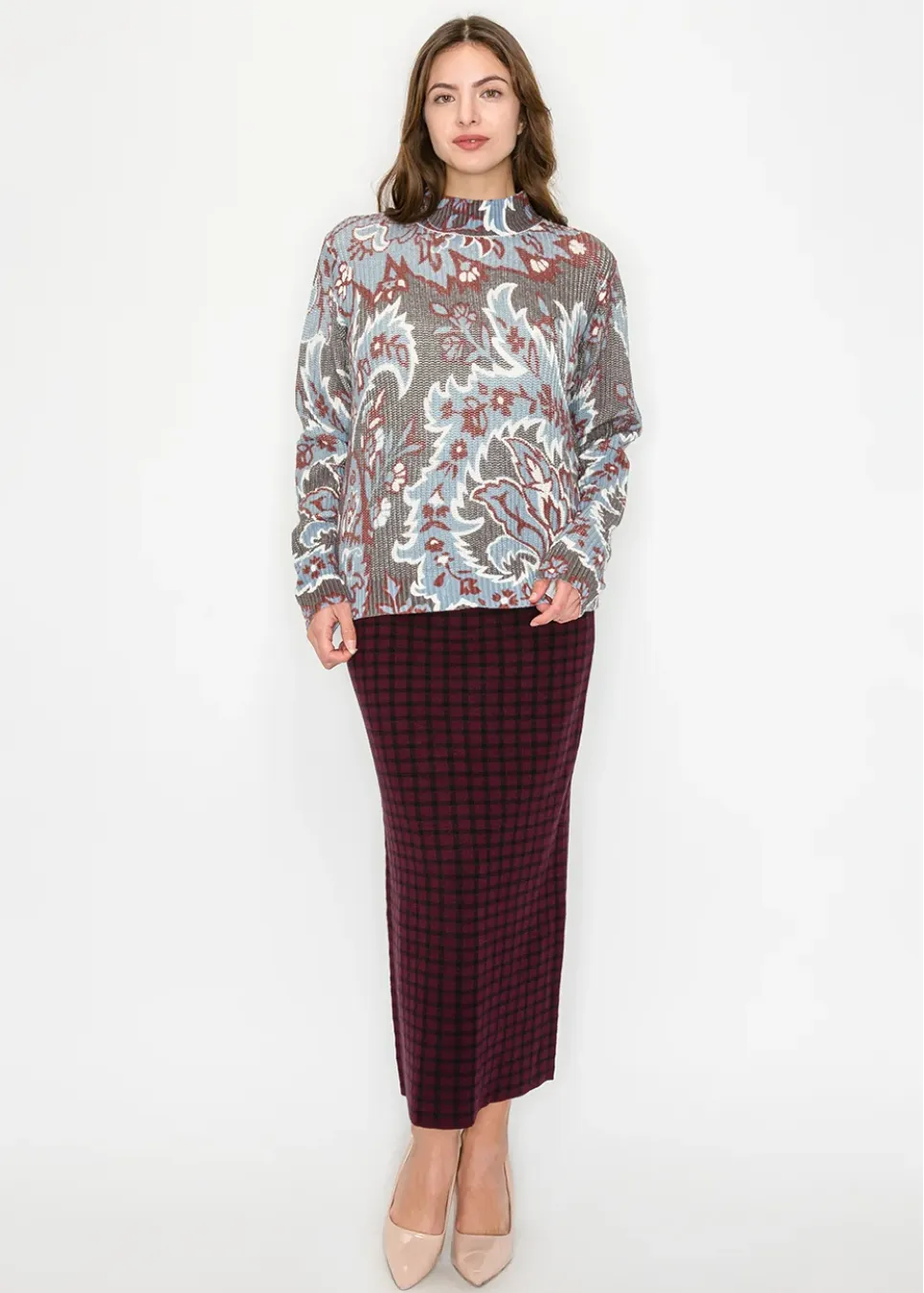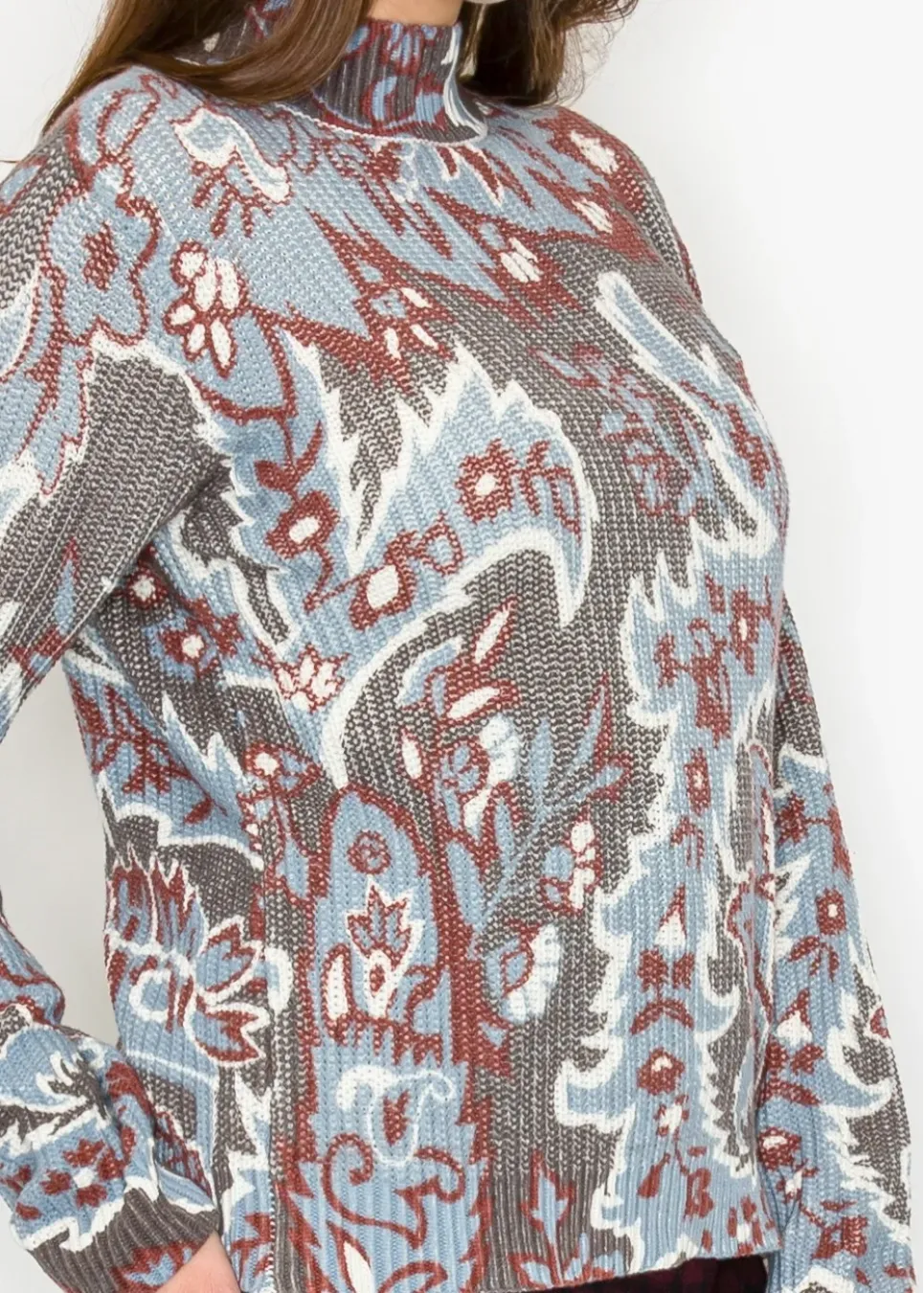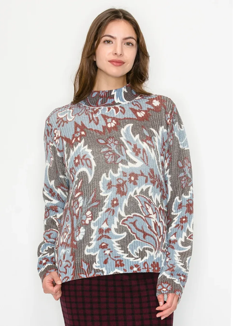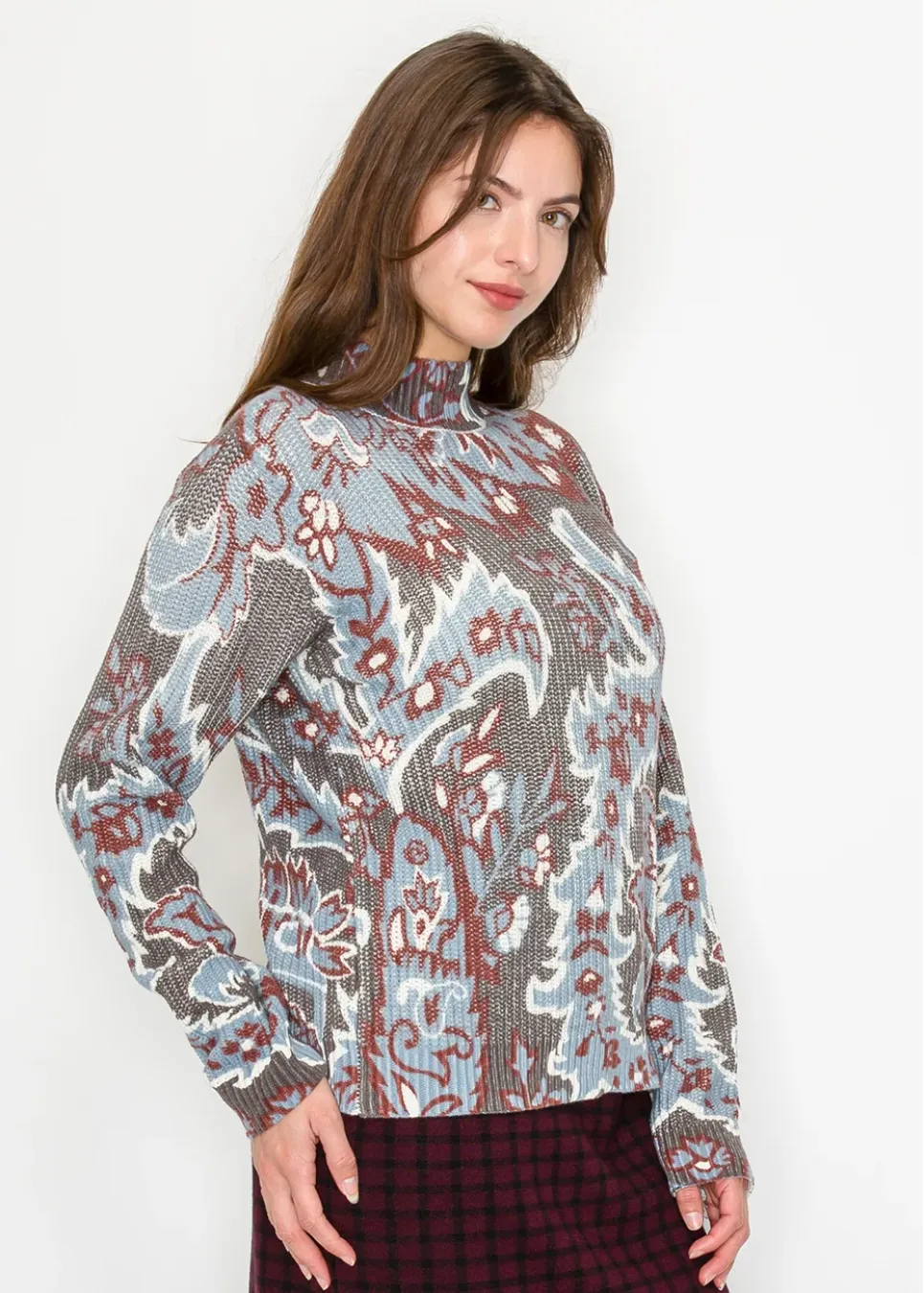 Throwback floral, modern comfort. Designed in a soft, mid-weight knit with a mock neck and full-length sleeves, this sweater is your cozy answer to cooler days.