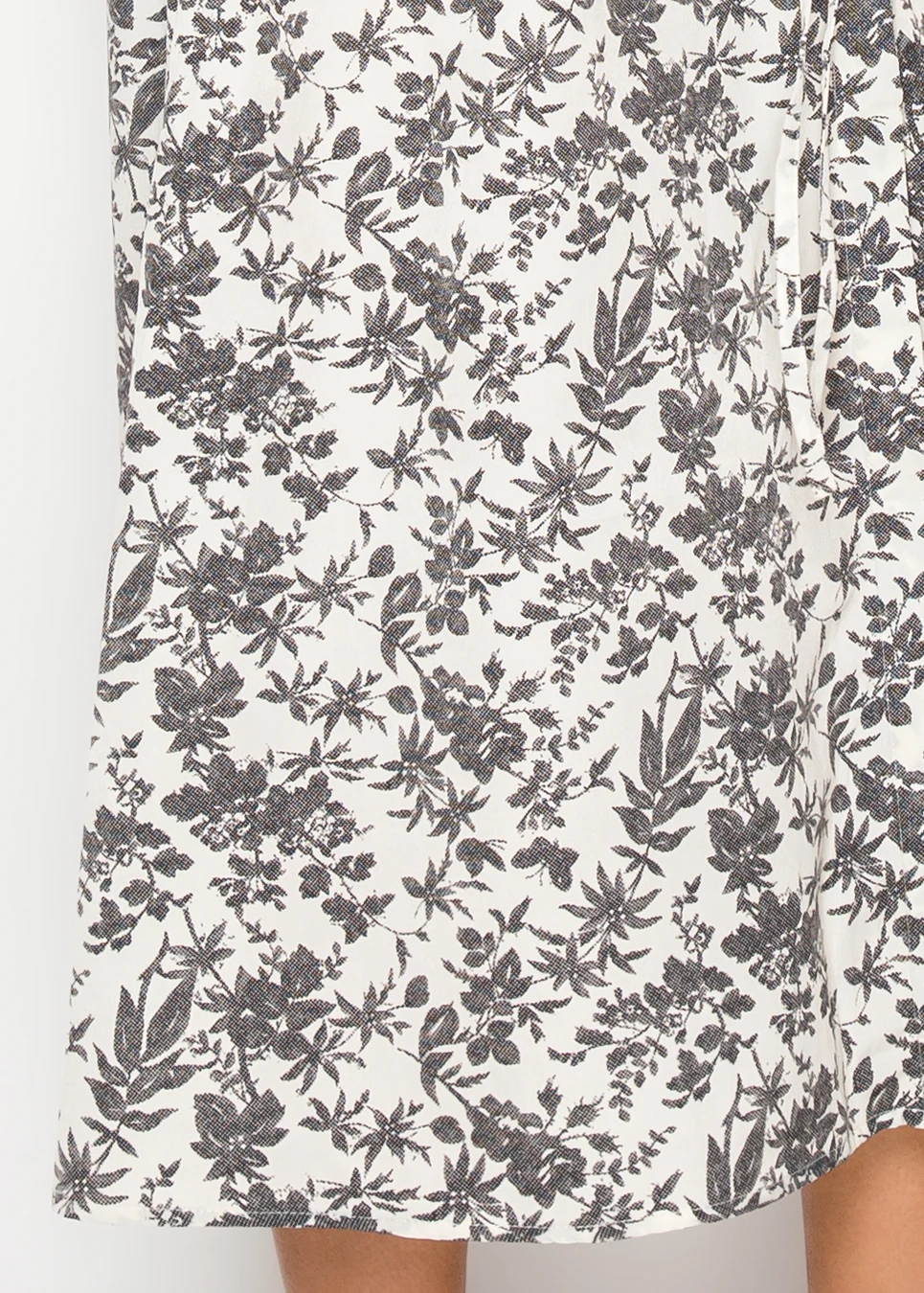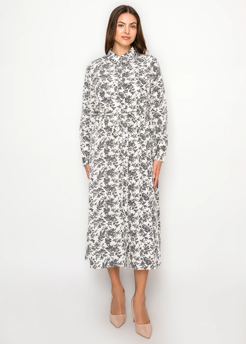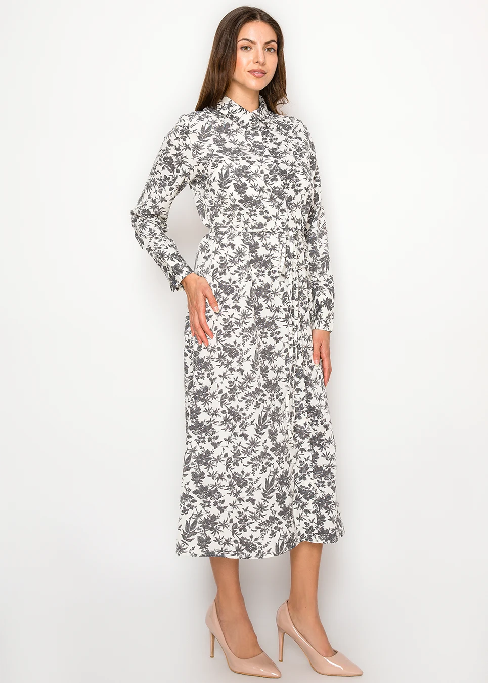 Charcoal botanical print on white, shirt collar, self-tie waist, full A-line midi skirt. Dense but not heavy — the white base keeps it fresh. Long sleeves, fully covered. Looks put-together from every angle.