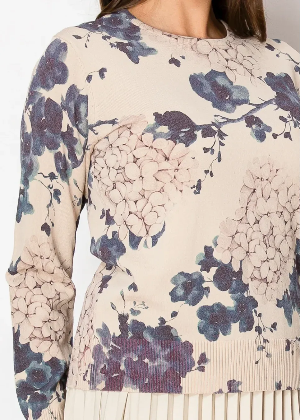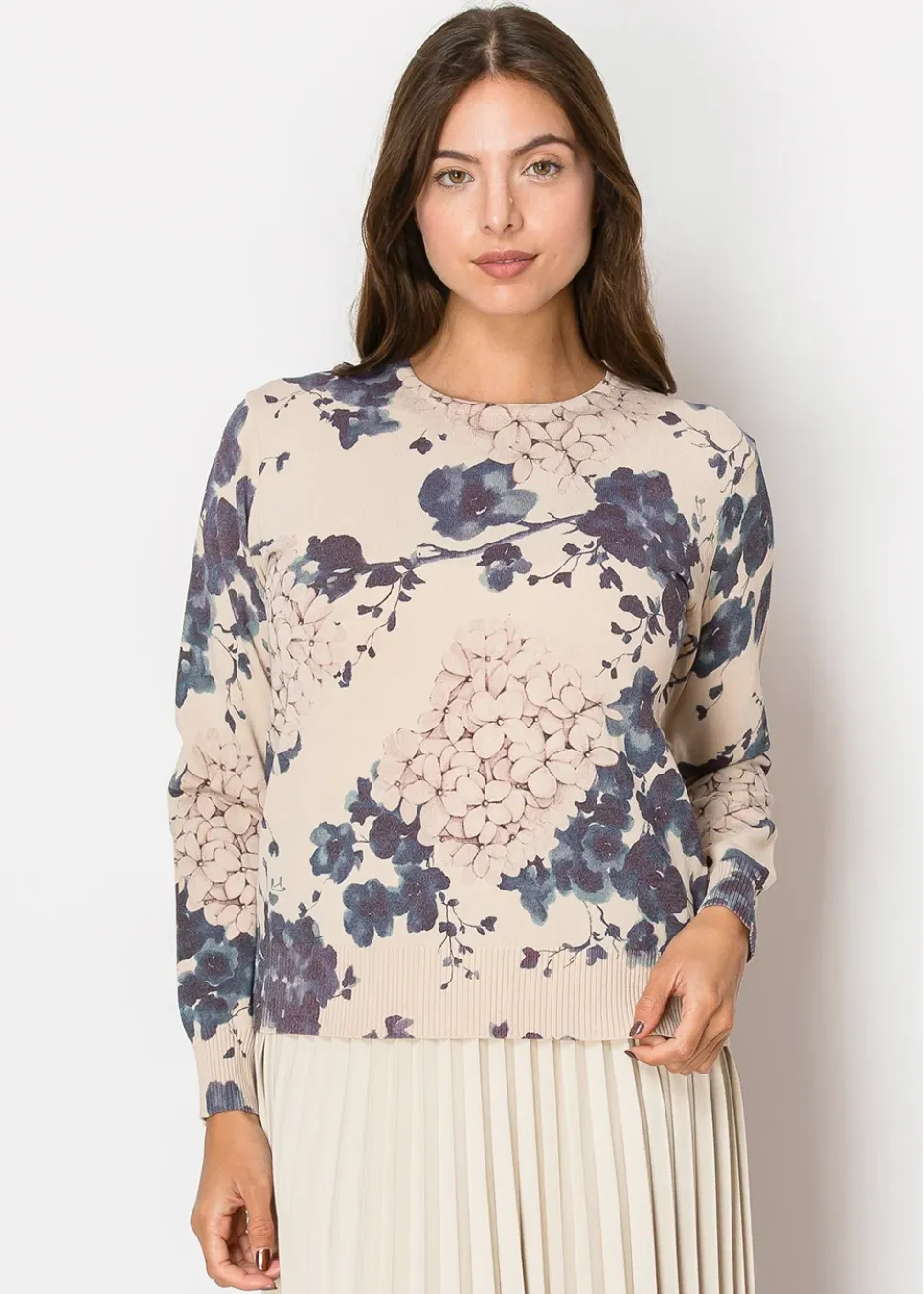 Soft blooms in purple and blue give this beige sweater a fresh, floral vibe. The ribbed cuffs and hem add structure, while the relaxed fit keeps it comfortable. Perfect for layering over dresses or pairing with skirts.