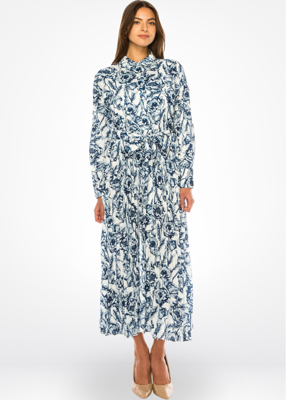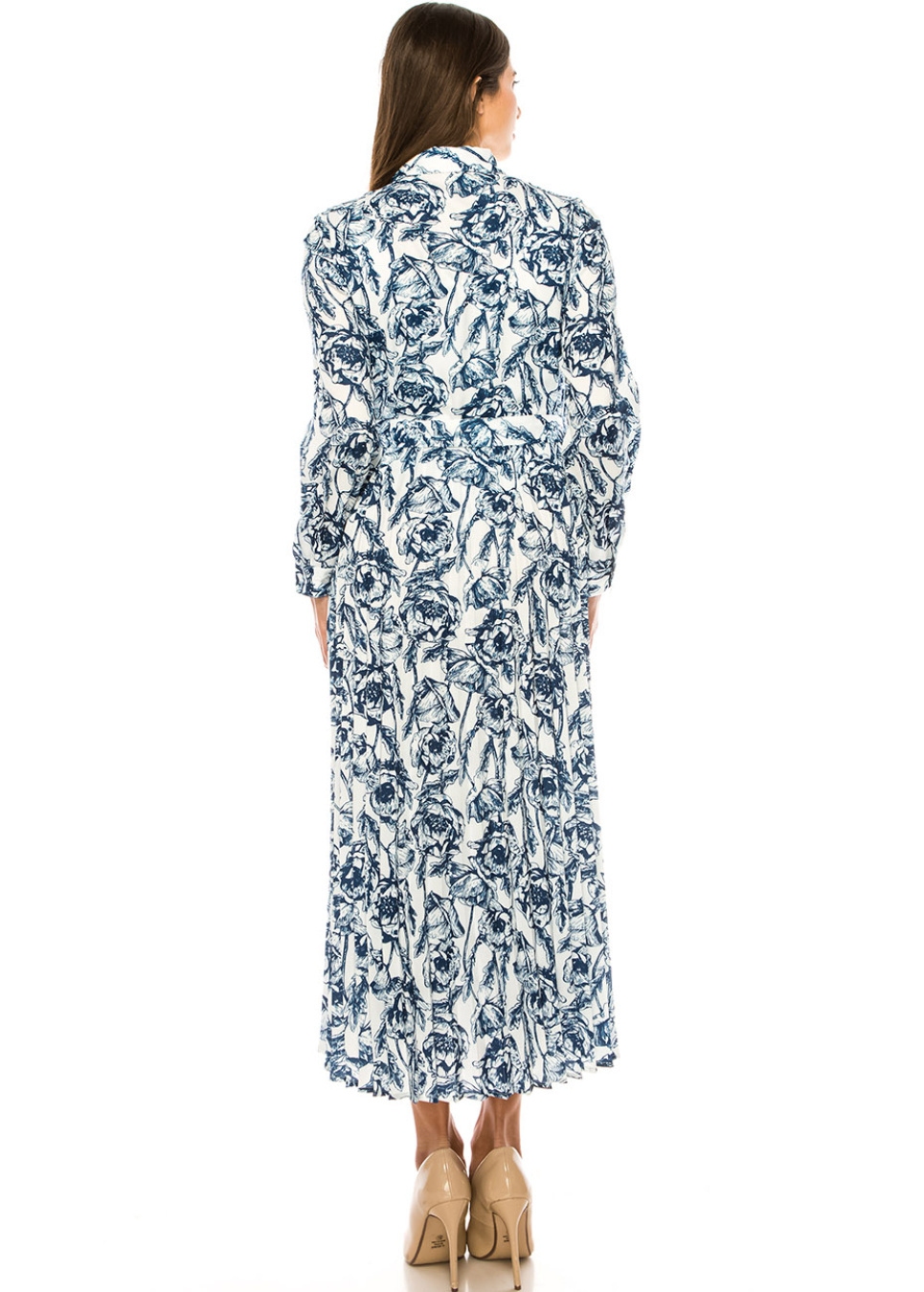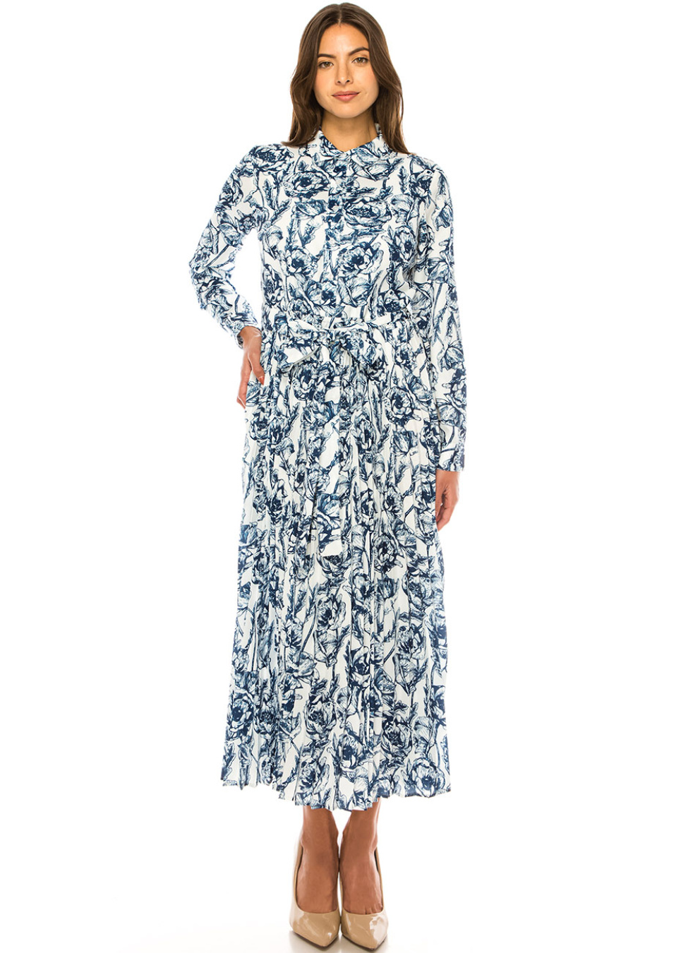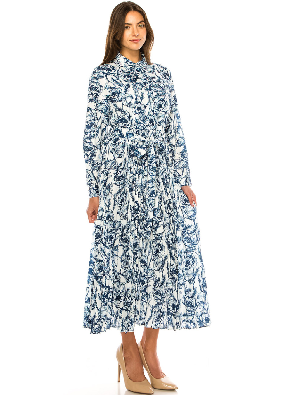 Blue Floral Midi Shirt Dress with Belted Waist