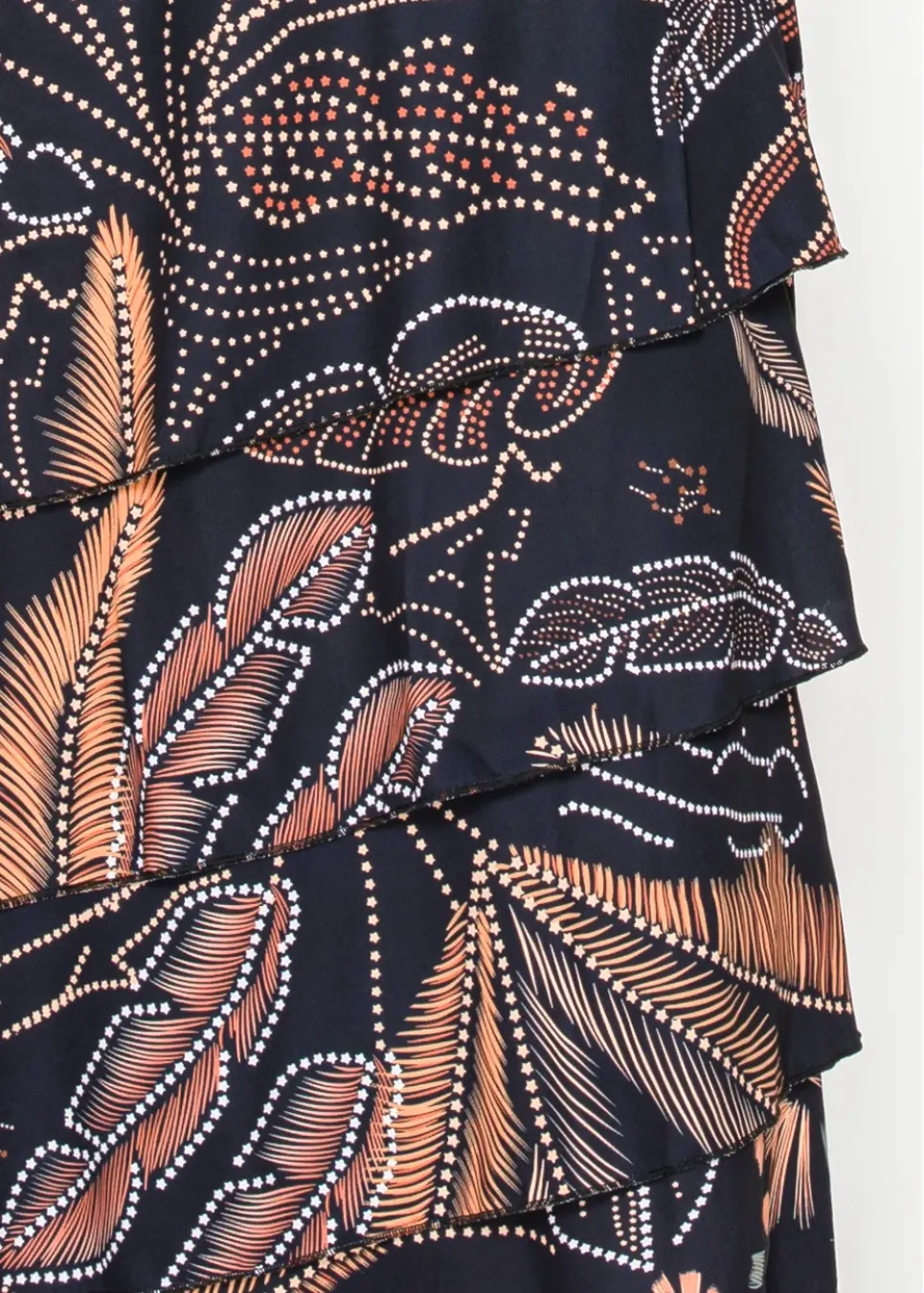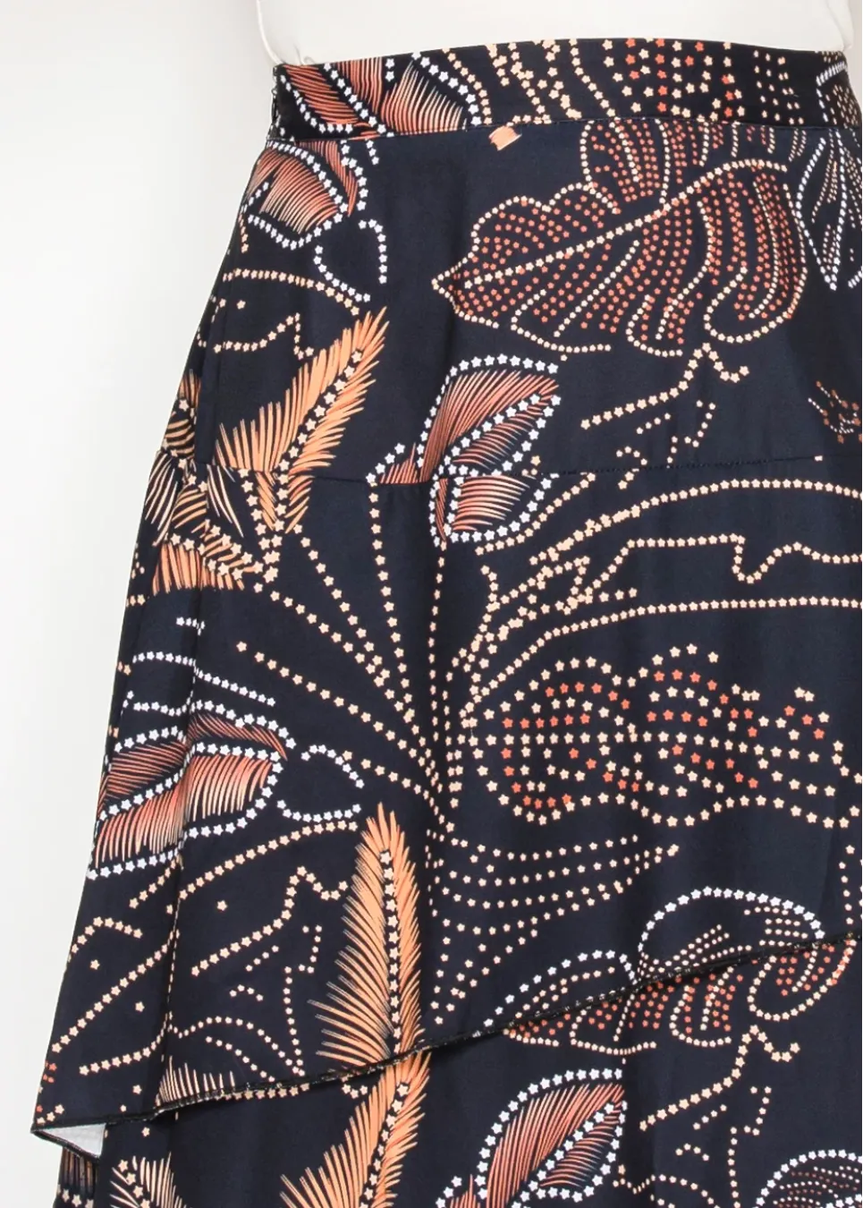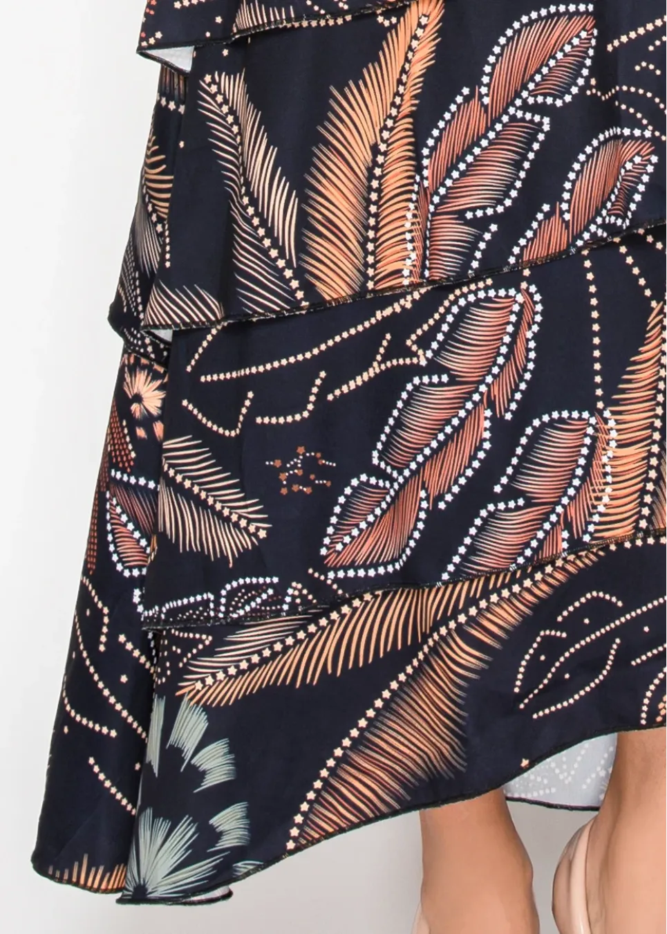 Layered tiers meet bold abstract florals in this statement skirt. The asymmetrical hem and modern print bring just the right amount of edge to a classic silhouette.