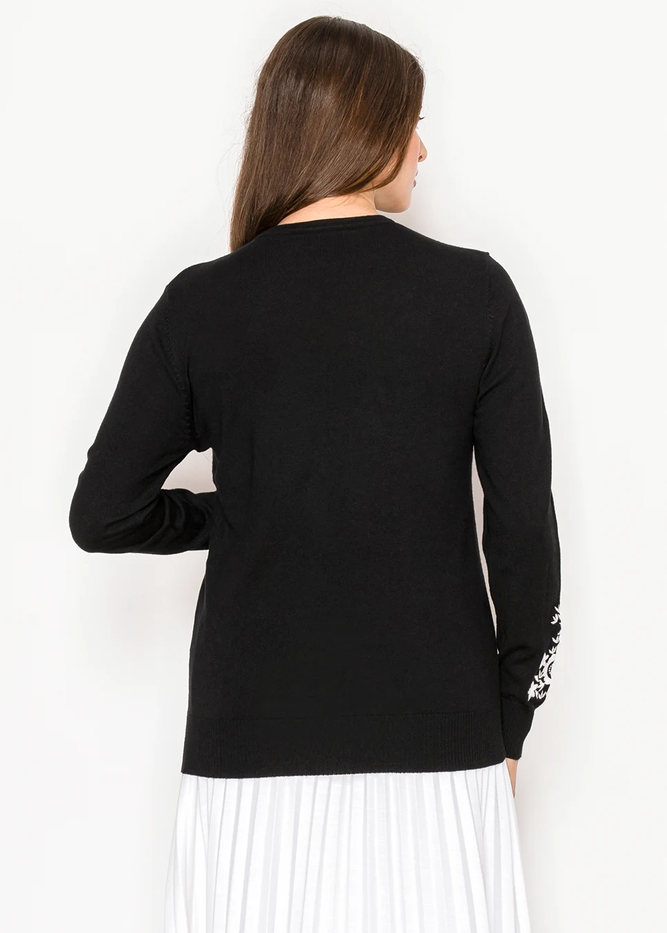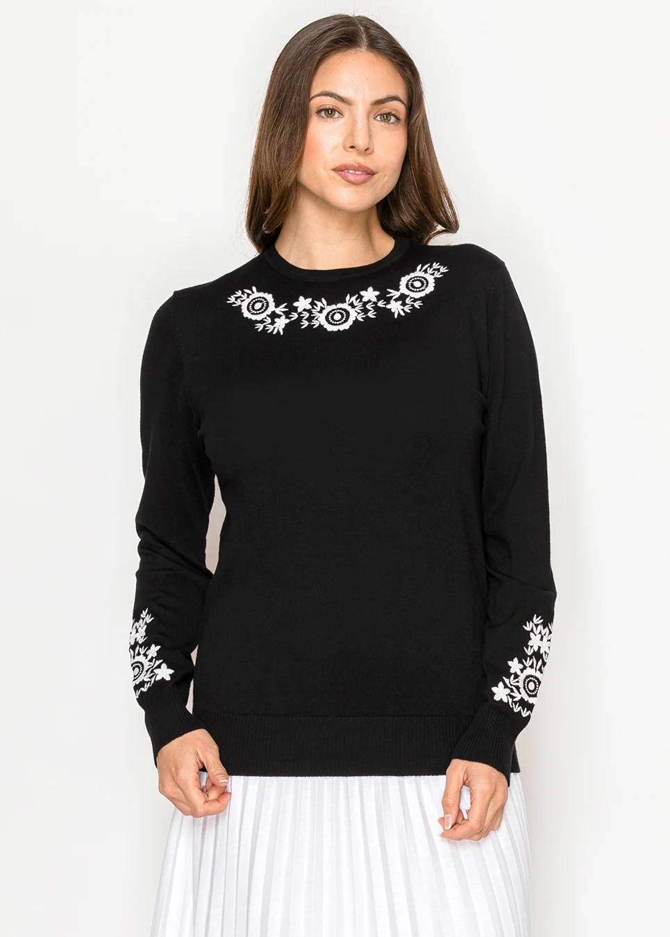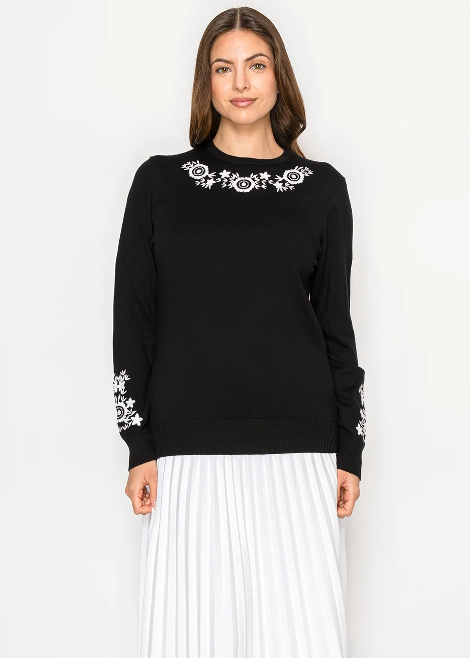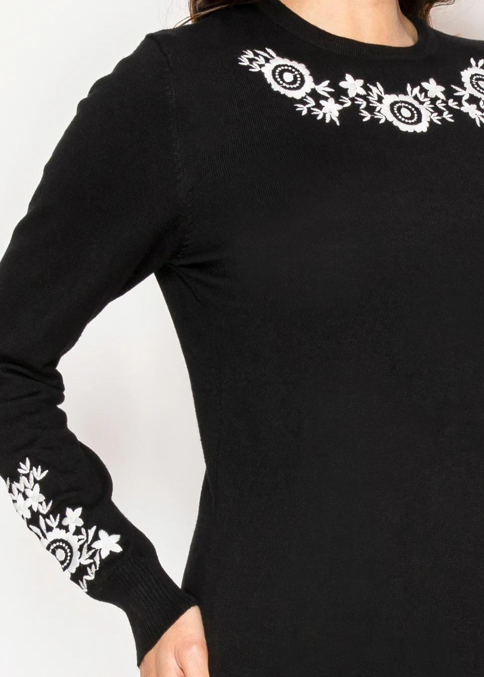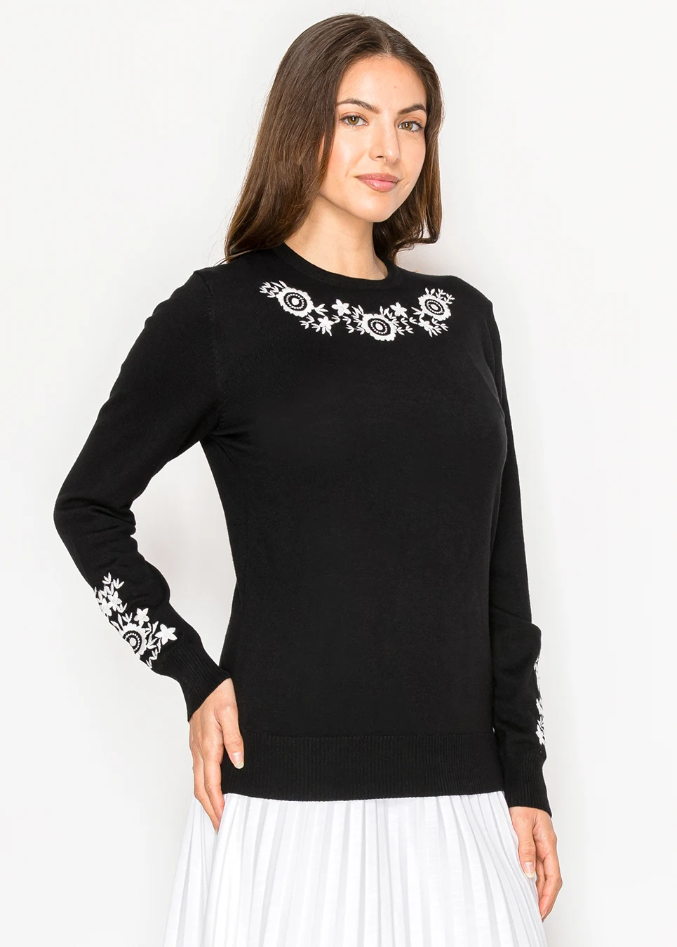 This black sweater looks simple until you notice the white floral detail across the neckline. It gives just enough interest without making the piece feel busy. The knit is light and smooth, so it’s comfortable even for long days.