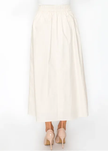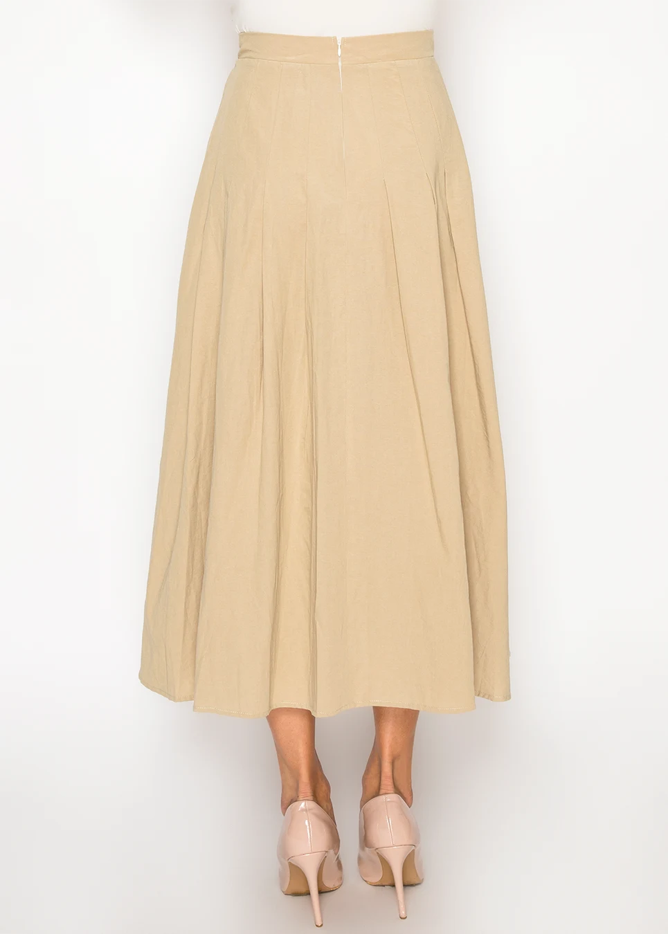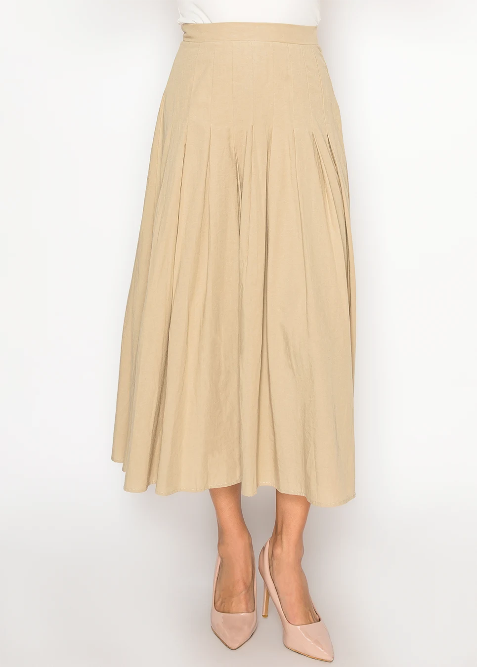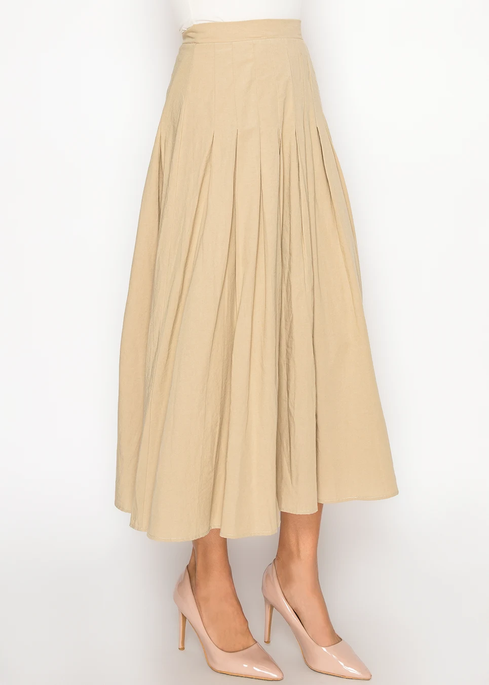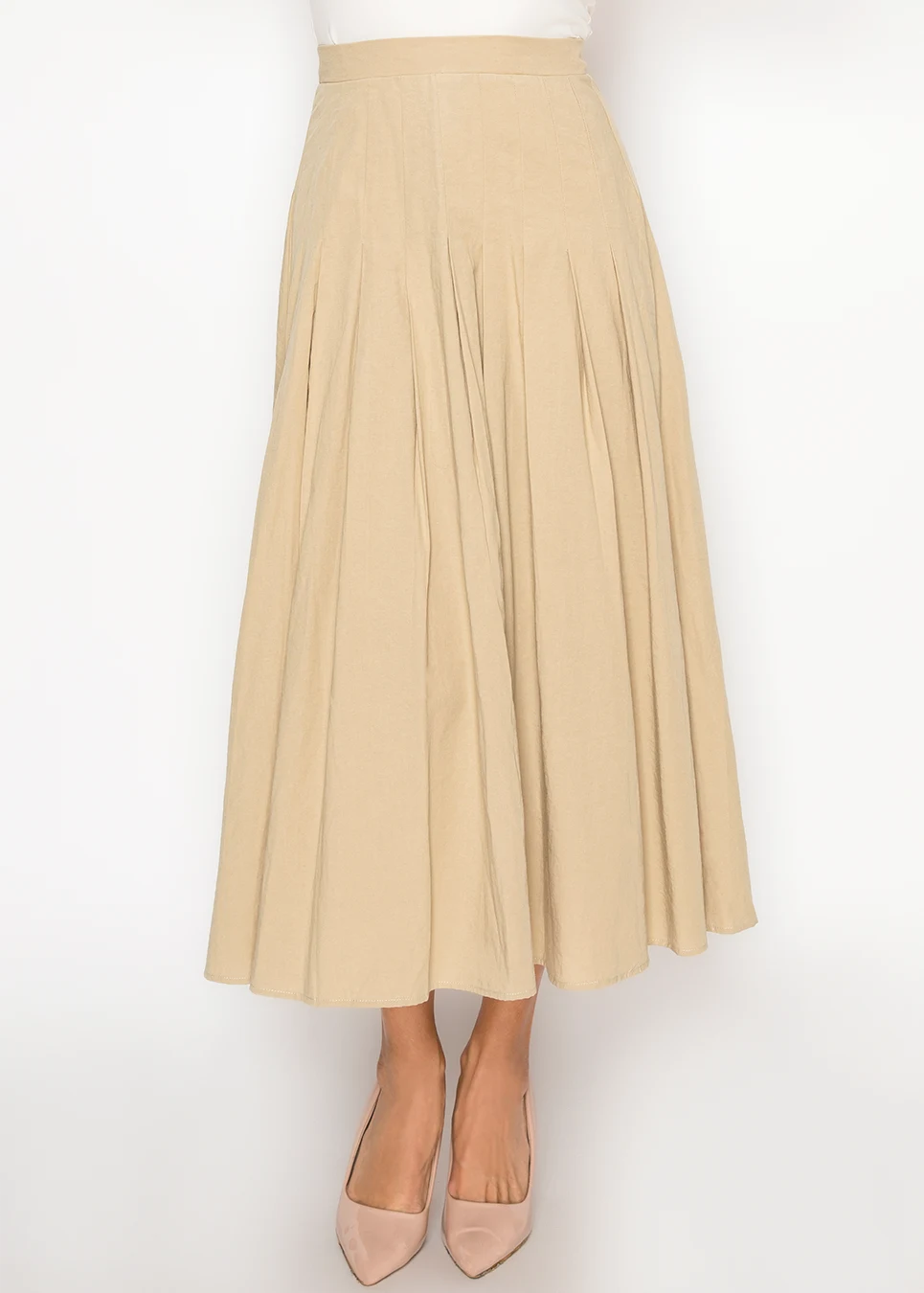 If you're looking for a pleated skirt that actually has volume — not just the suggestion of it — this is worth a close look. Deep knife pleats, soft fabric with real drape, high structured waist, midi length. Beige that reads warm and neutral at the same time.