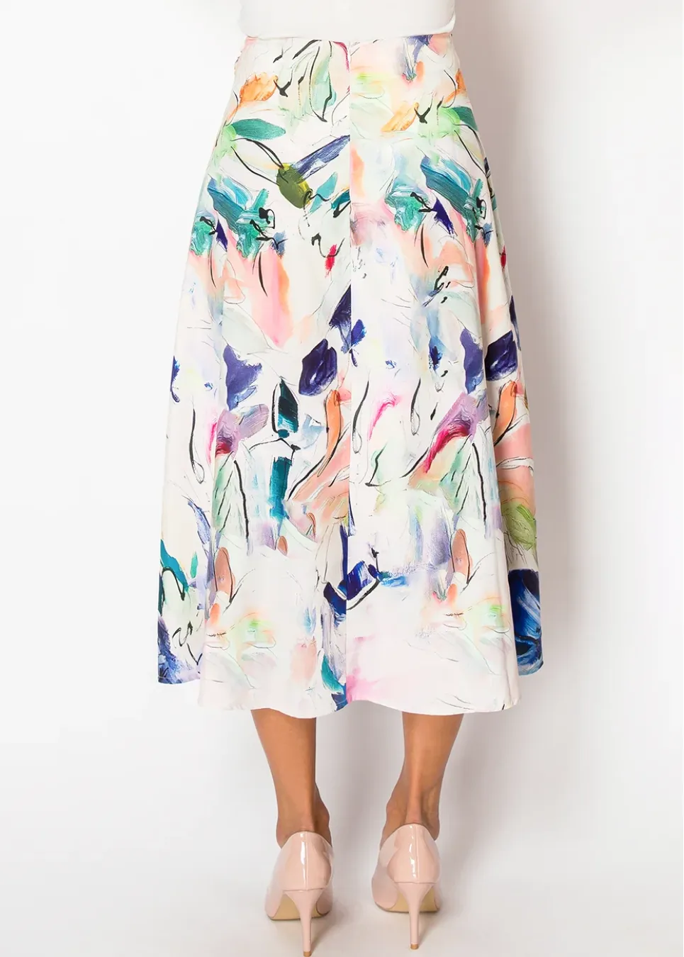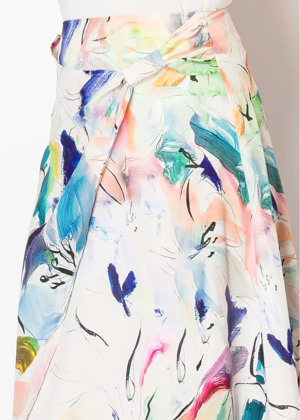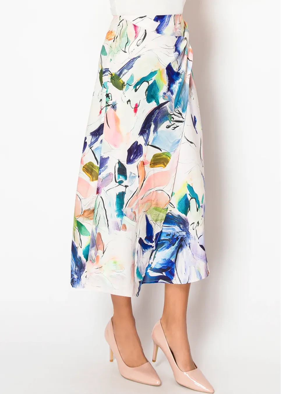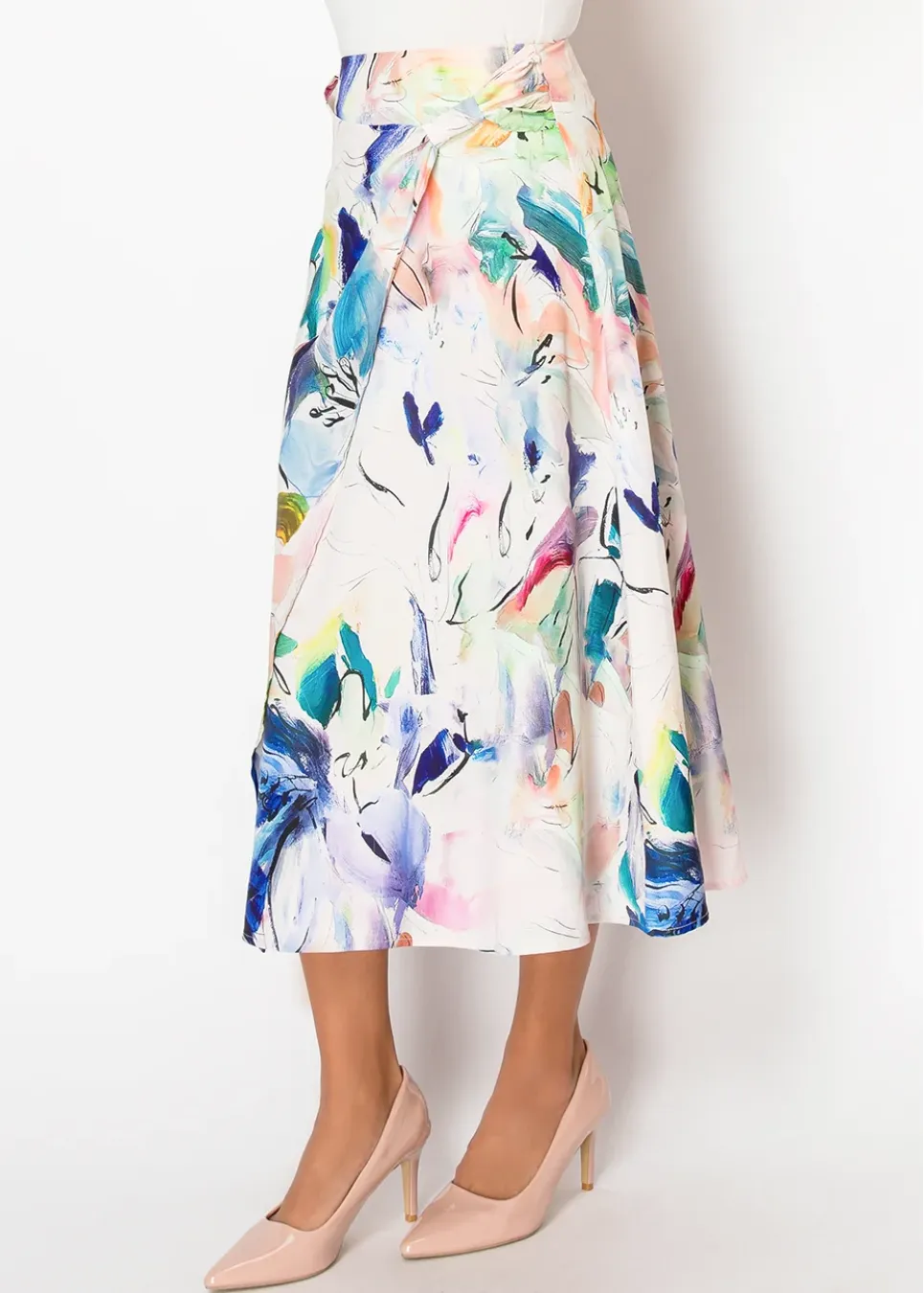 If comfort and elegance had a perfect match, this would be it. This midi skirt flows beautifully with every step, featuring an abstract brushstroke print and a subtle front tie for an extra touch of charm.