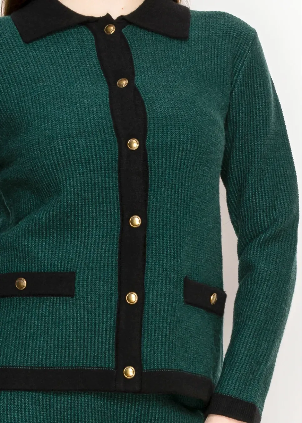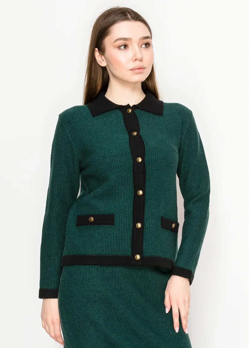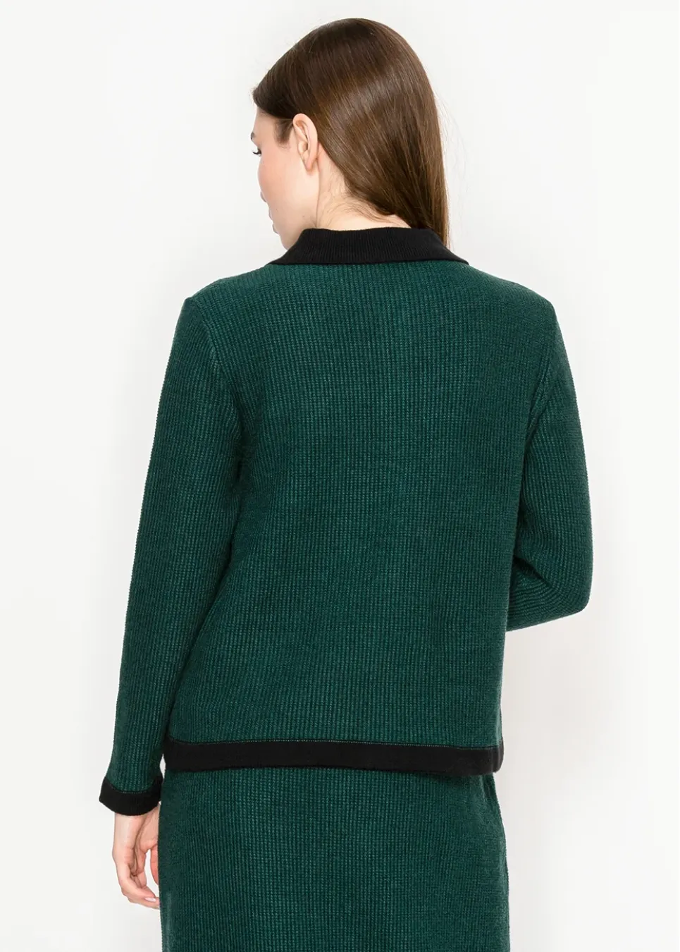 A refined cardigan in deep green, framed with black trim and finished with gold-tone buttons for a timeless look.