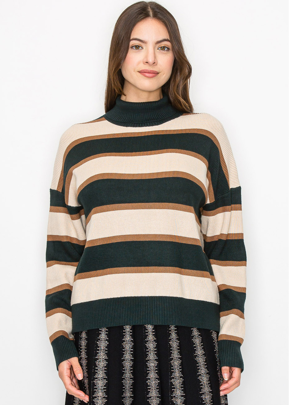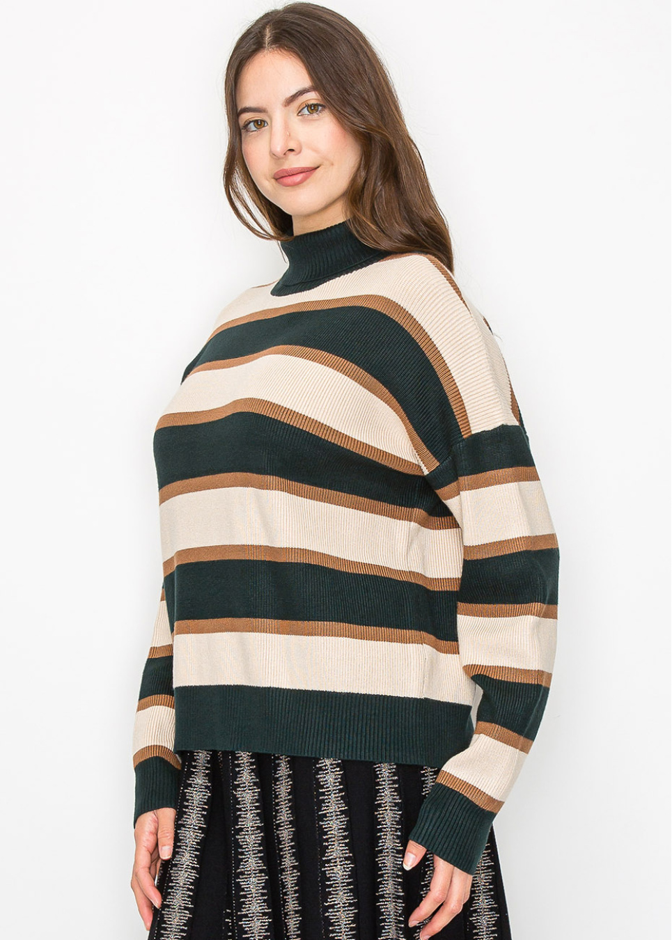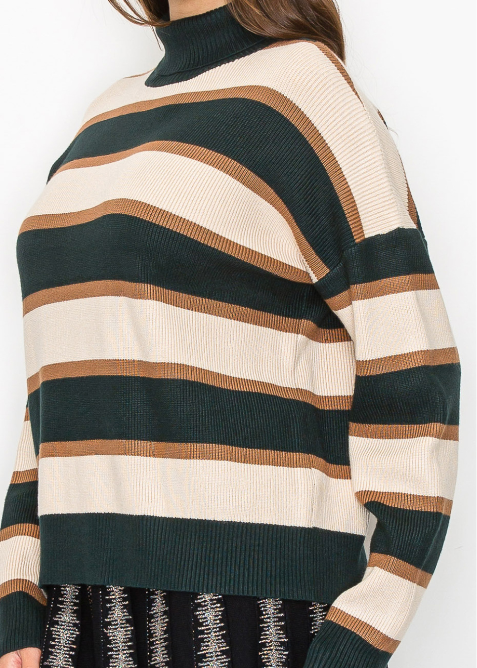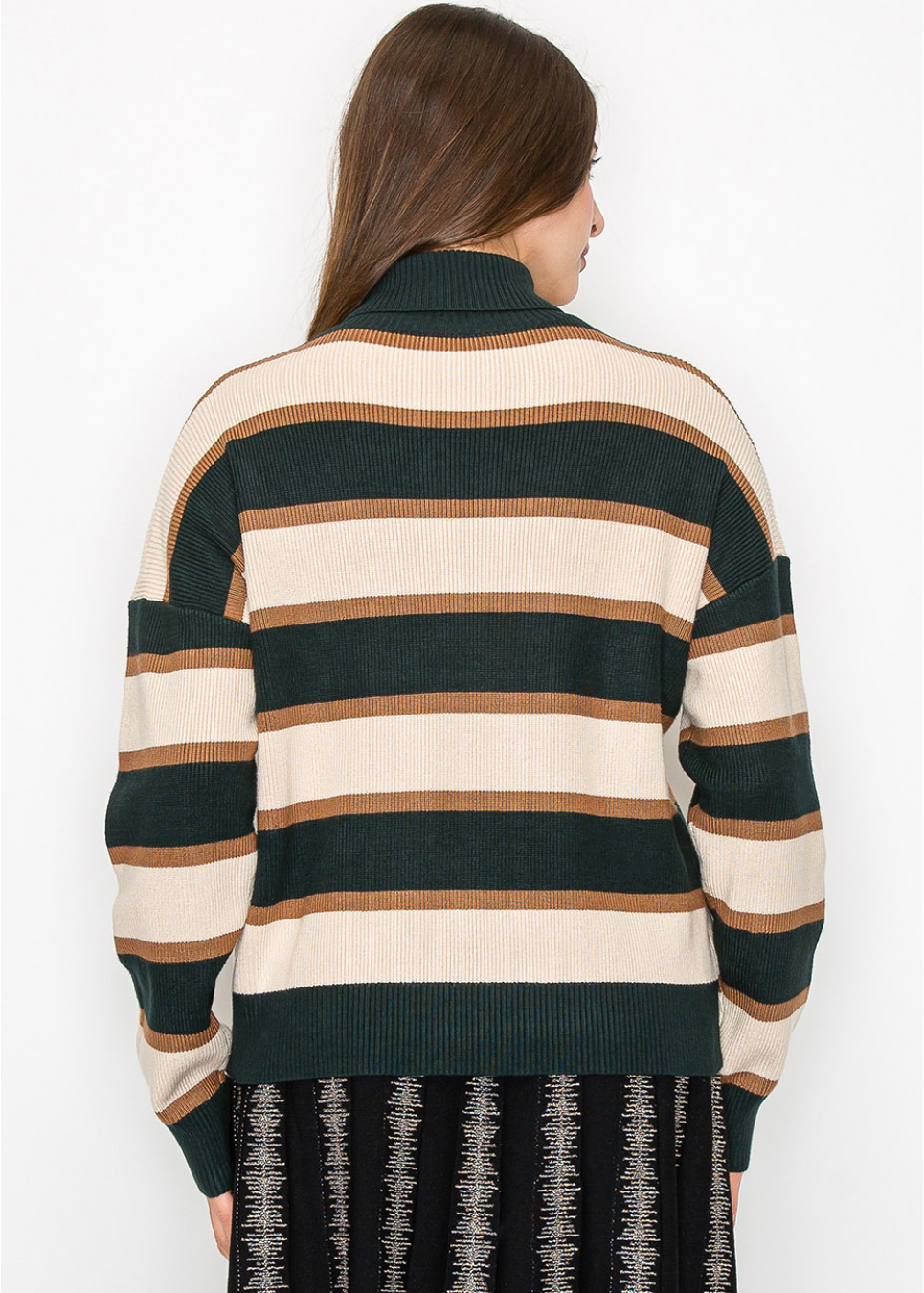 A cozy turtleneck sweater with wide stripes in forest green, beige, and brown. The relaxed fit and soft knit make this sweater perfect for cooler days, offering both comfort and a stylish, modern look. It pairs beautifully with a variety of skirts for an effortlessly chic outfit.