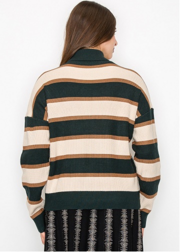 A cozy turtleneck sweater with wide stripes in forest green, beige, and brown. The relaxed fit and soft knit make this sweater perfect for cooler days, offering both comfort and a stylish, modern look. It pairs beautifully with a variety of skirts for an effortlessly chic outfit.