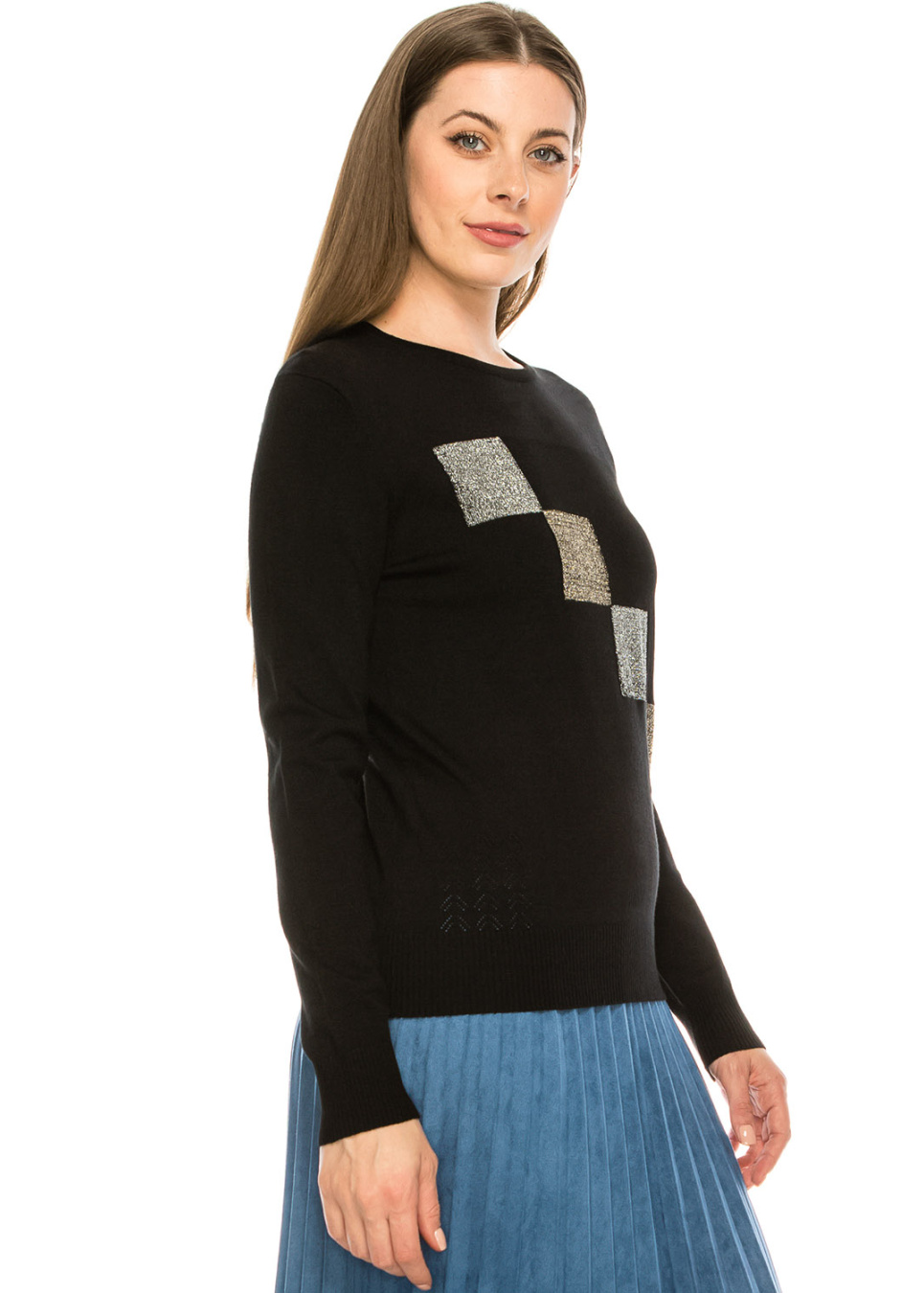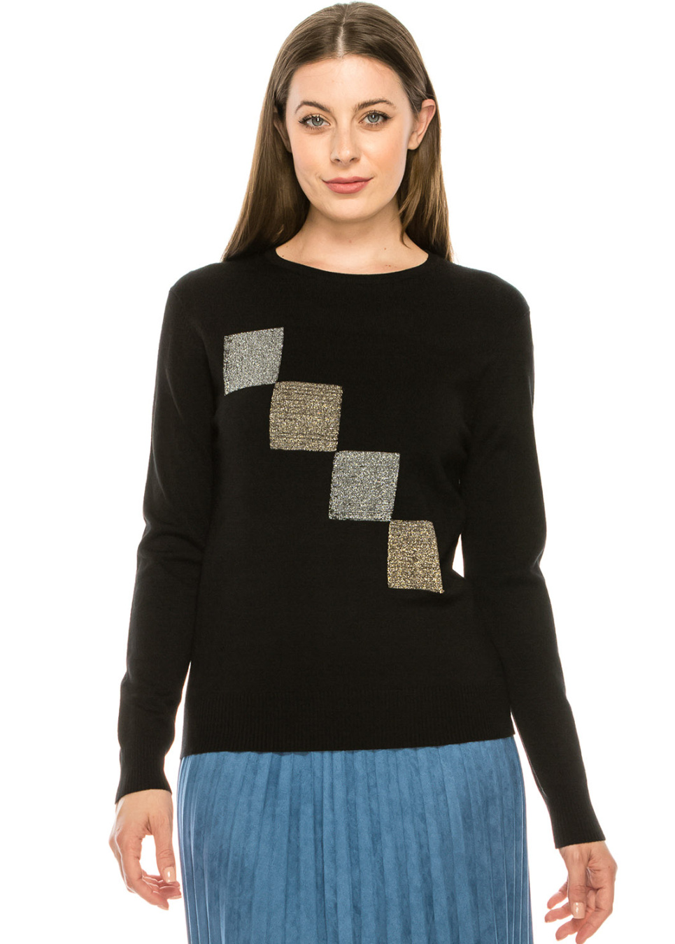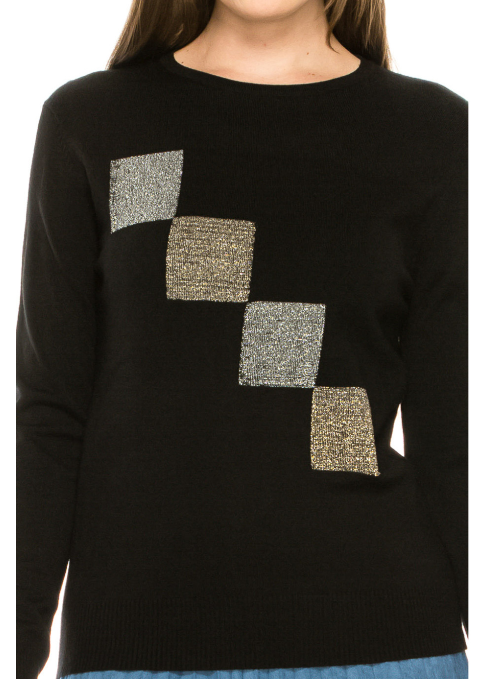 - Knit top with four metallic squares for a fun, but subtle look