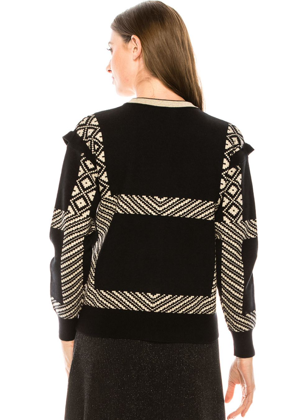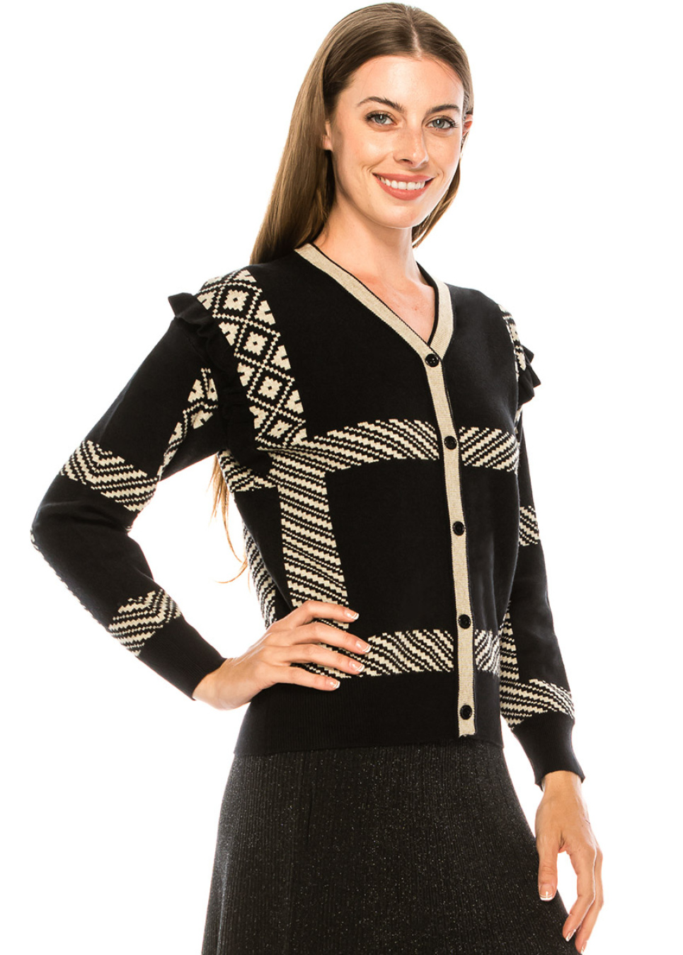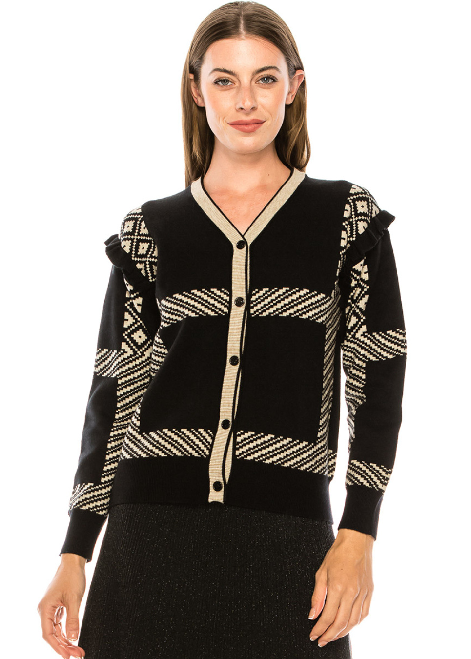 This cardigan’s classic cut is complemented by sophisticated details. Frills on sleeves and contrast cream lines on a black background make the look stylish and sleek. If you are all for elegance but also value comfort, this item can be your new favorite.