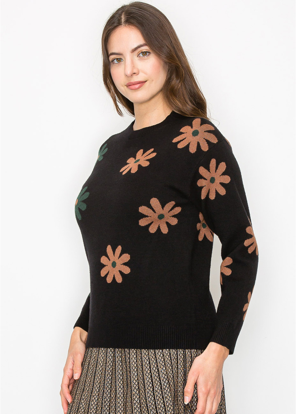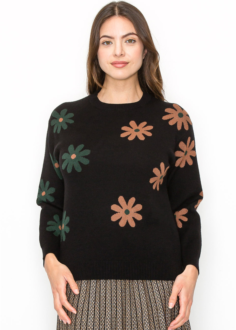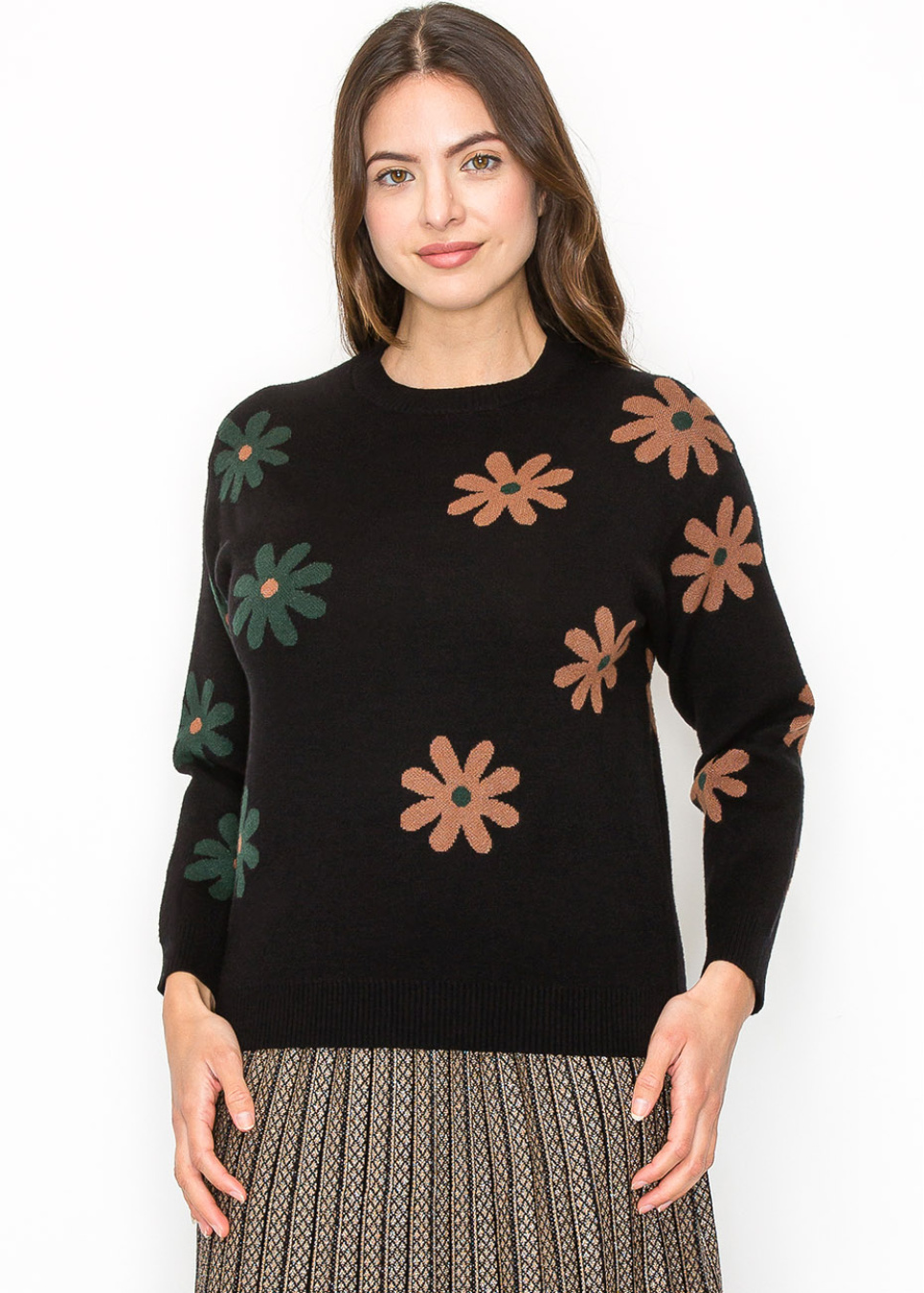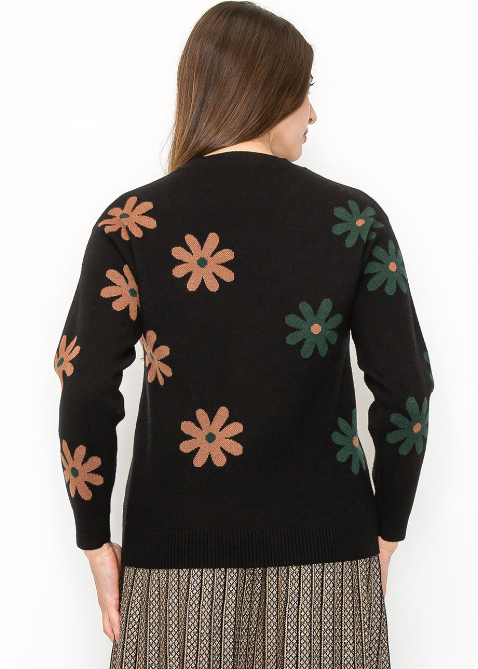Brighten up your wardrobe with this floral-printed black pullover. The contrast of green and brown flowers against the black backdrop offers a fun, unique touch. With its soft knit and relaxed fit, it’s a perfect layering piece for those cooler days.