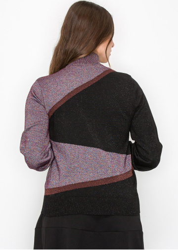 Stand out with this geometric colorblock turtleneck sweater, where rich tones blend seamlessly into a striking design. The shimmering accents and bold lines add a contemporary twist, making it perfect for those who love to combine elegance with a modern edge.
