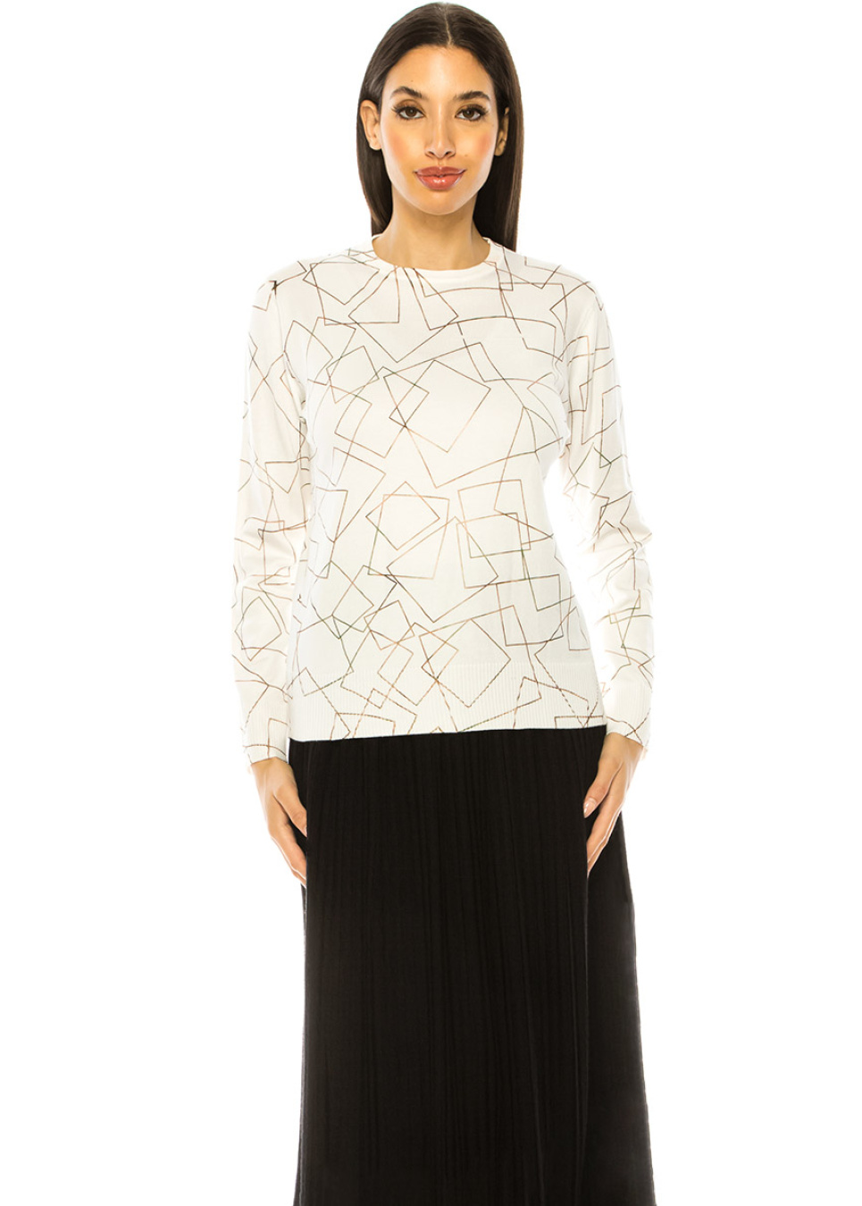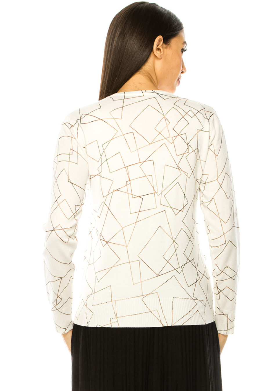 Introducing our white sweater with a stunning geometric pattern. This wardrobe essential is made from soft and stretchy fabric, providing ultimate comfort for your day-to-day activities. The geometric pattern adds a touch of elegance to this practical sweater, making it a versatile choice for any casual occasion. Wear it with denim for a classic style or pair it with your favorite pants to create a comfortable yet trendy look.