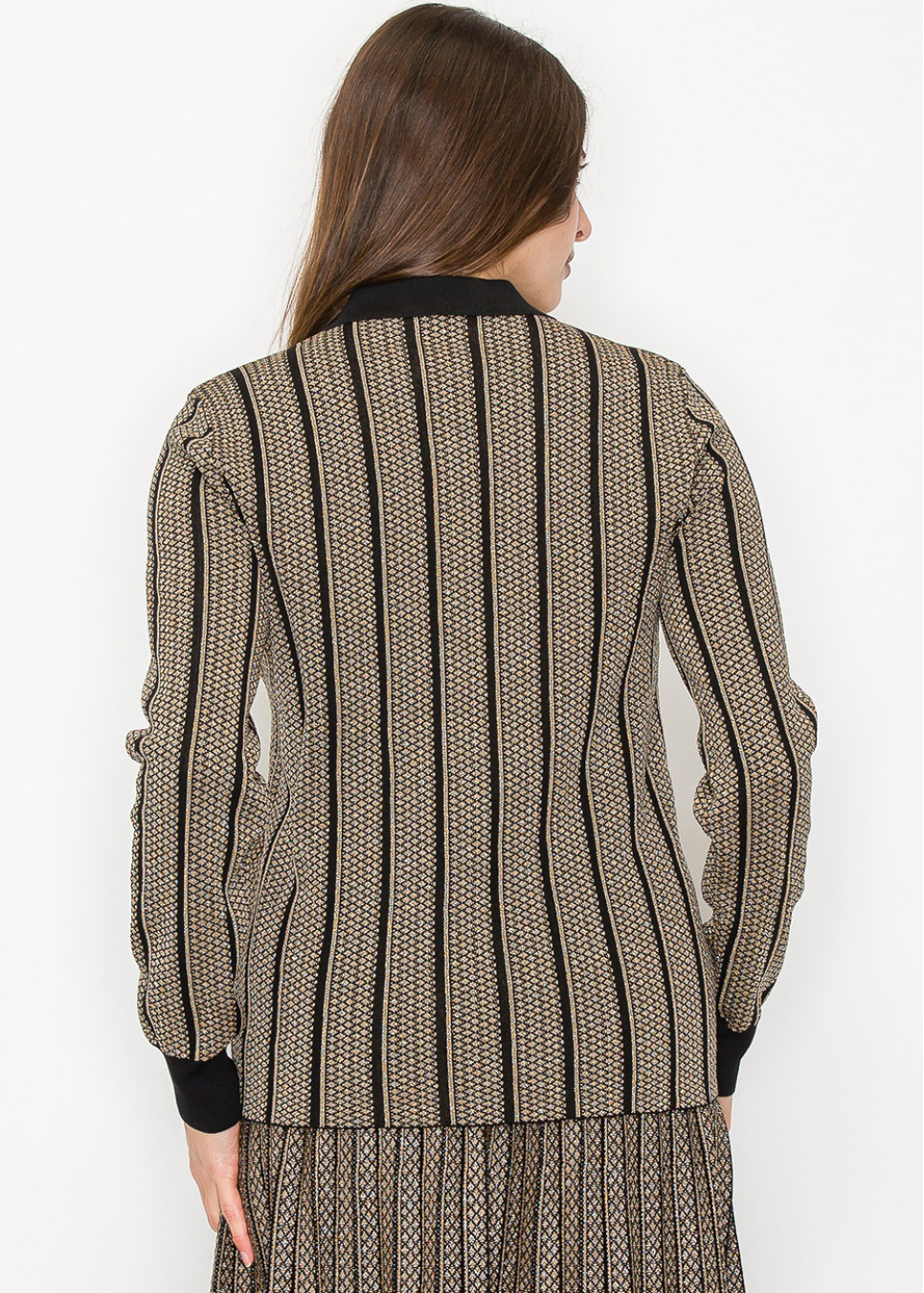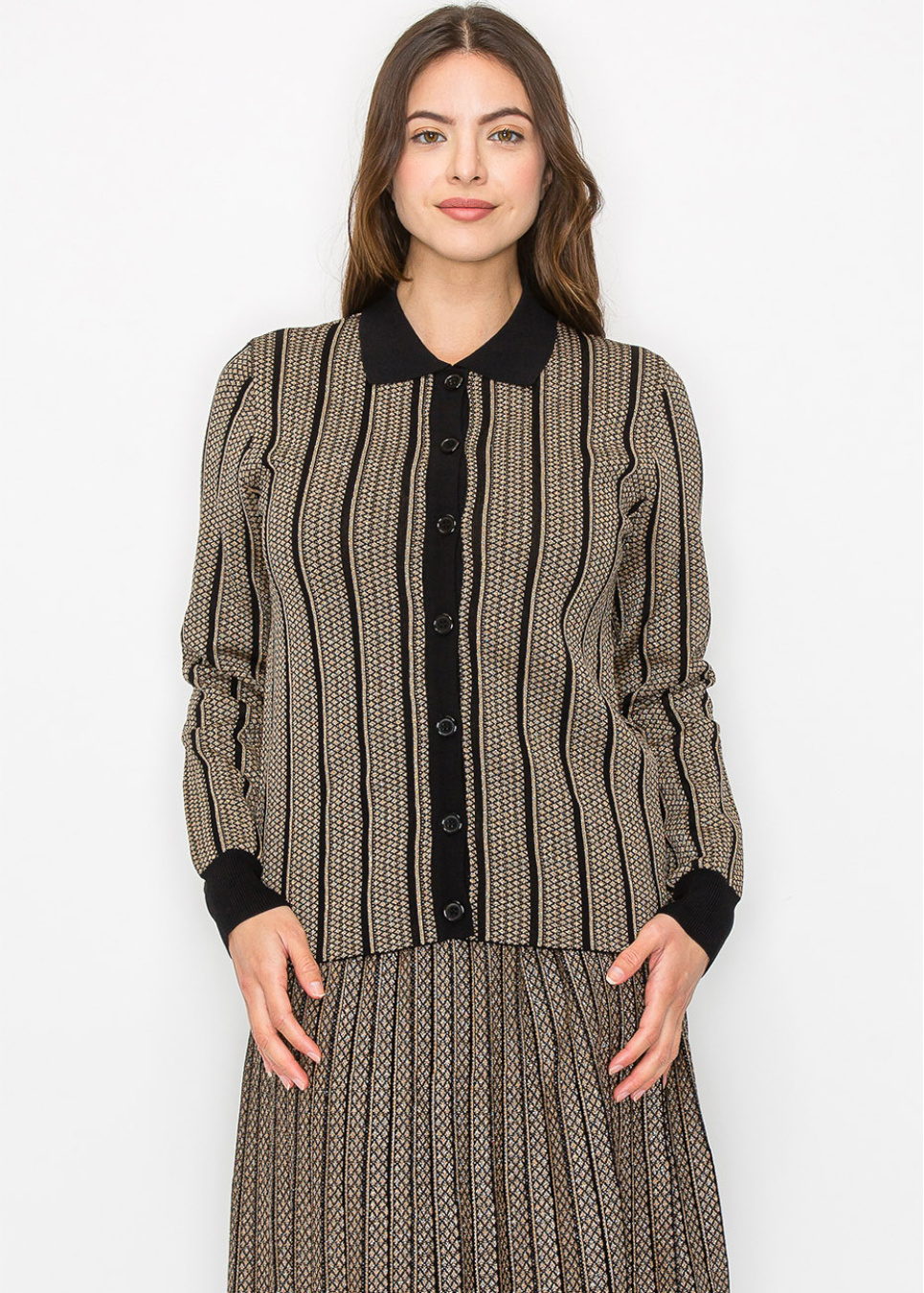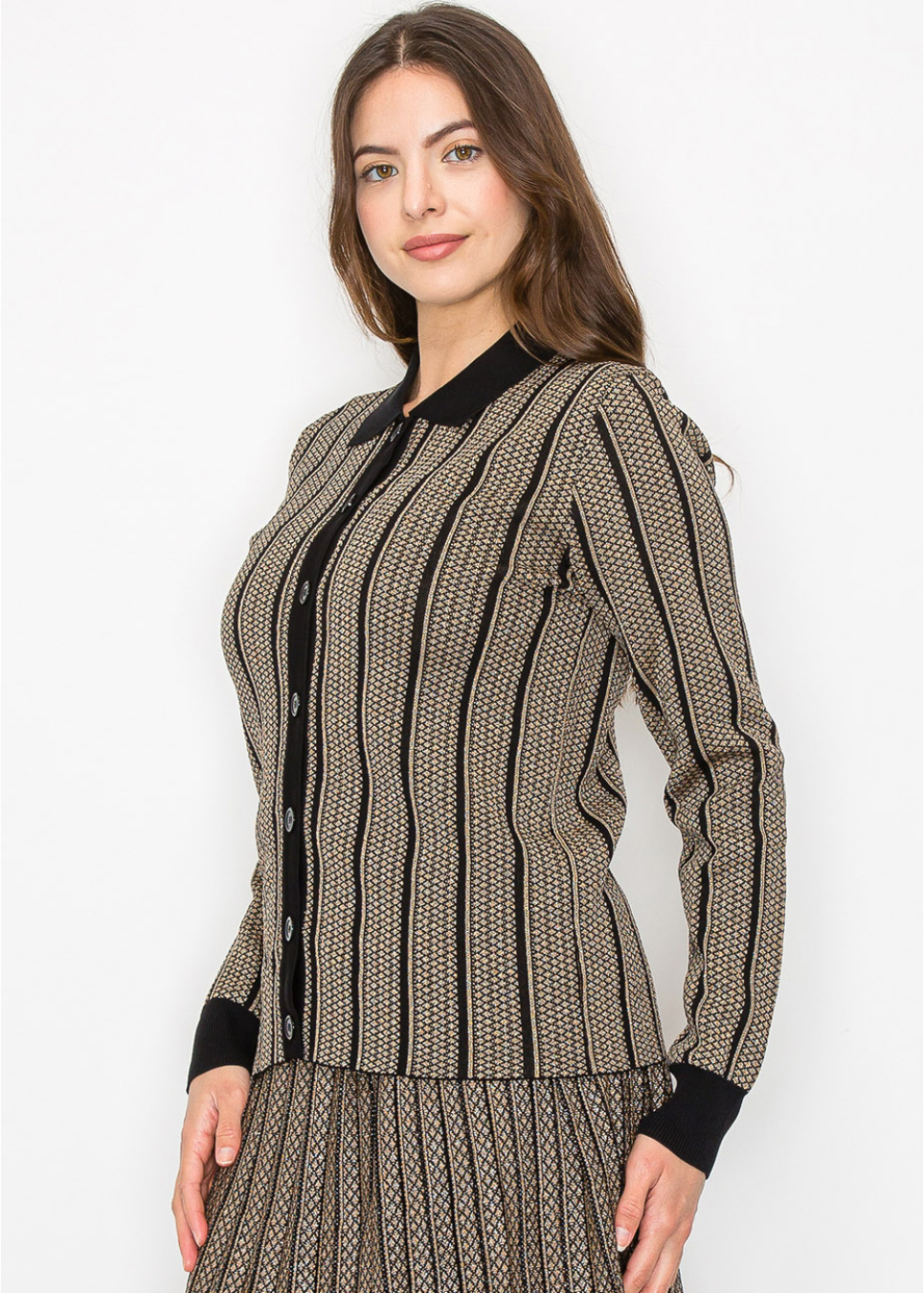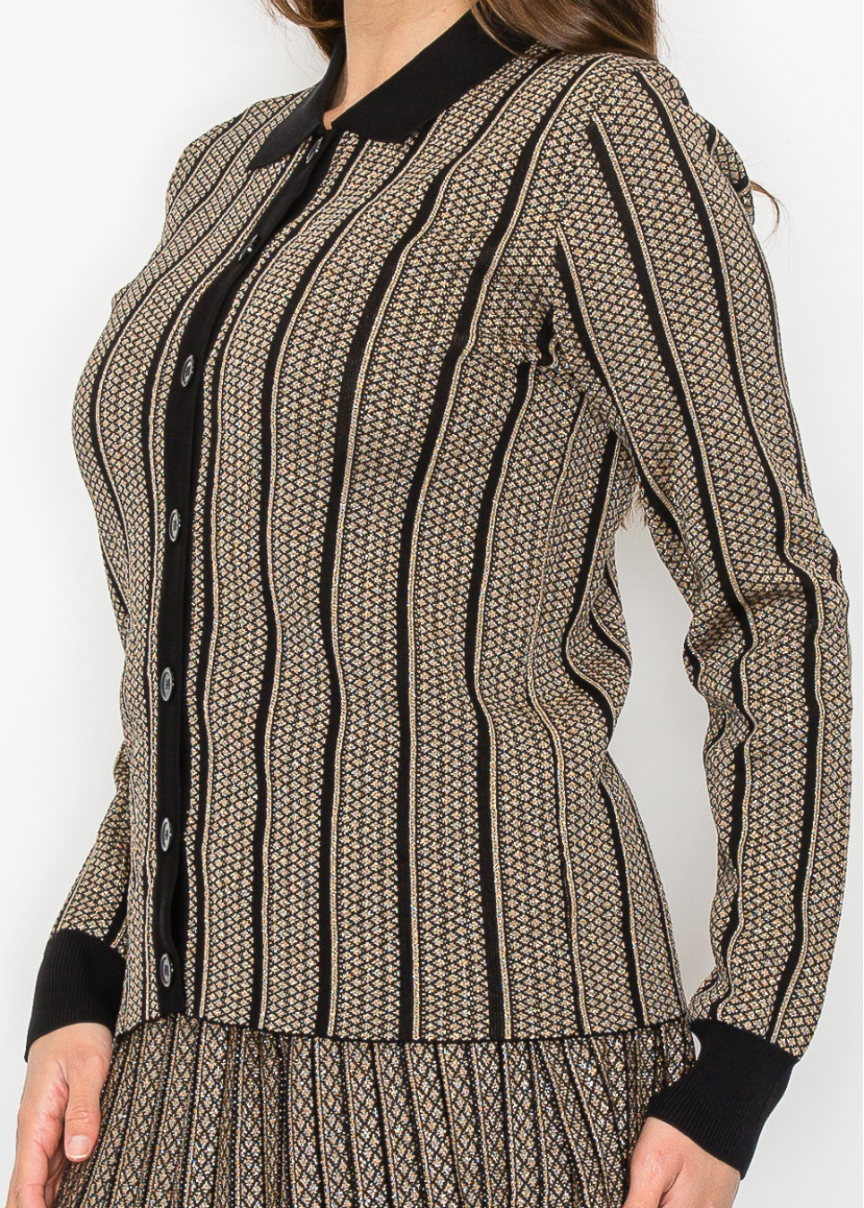 A chic knit top with striking vertical stripes in gold and black, complete with a button-down front. The structured collar gives it a refined look, making it perfect for both casual and formal settings. The soft fabric ensures all-day comfort while maintaining a modest fit.
