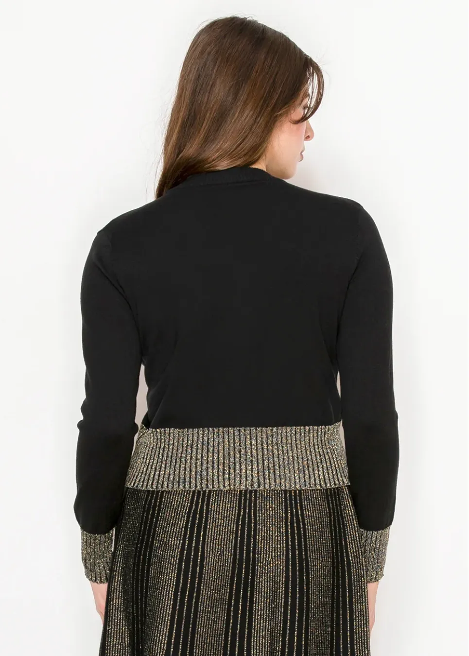 A little shimmer, a lot of charm. With metallic gold ribbing and timeless buttons, this cardigan adds just the right touch of polish to any look.