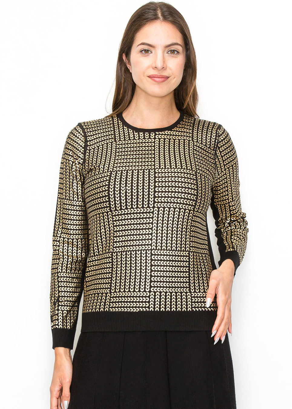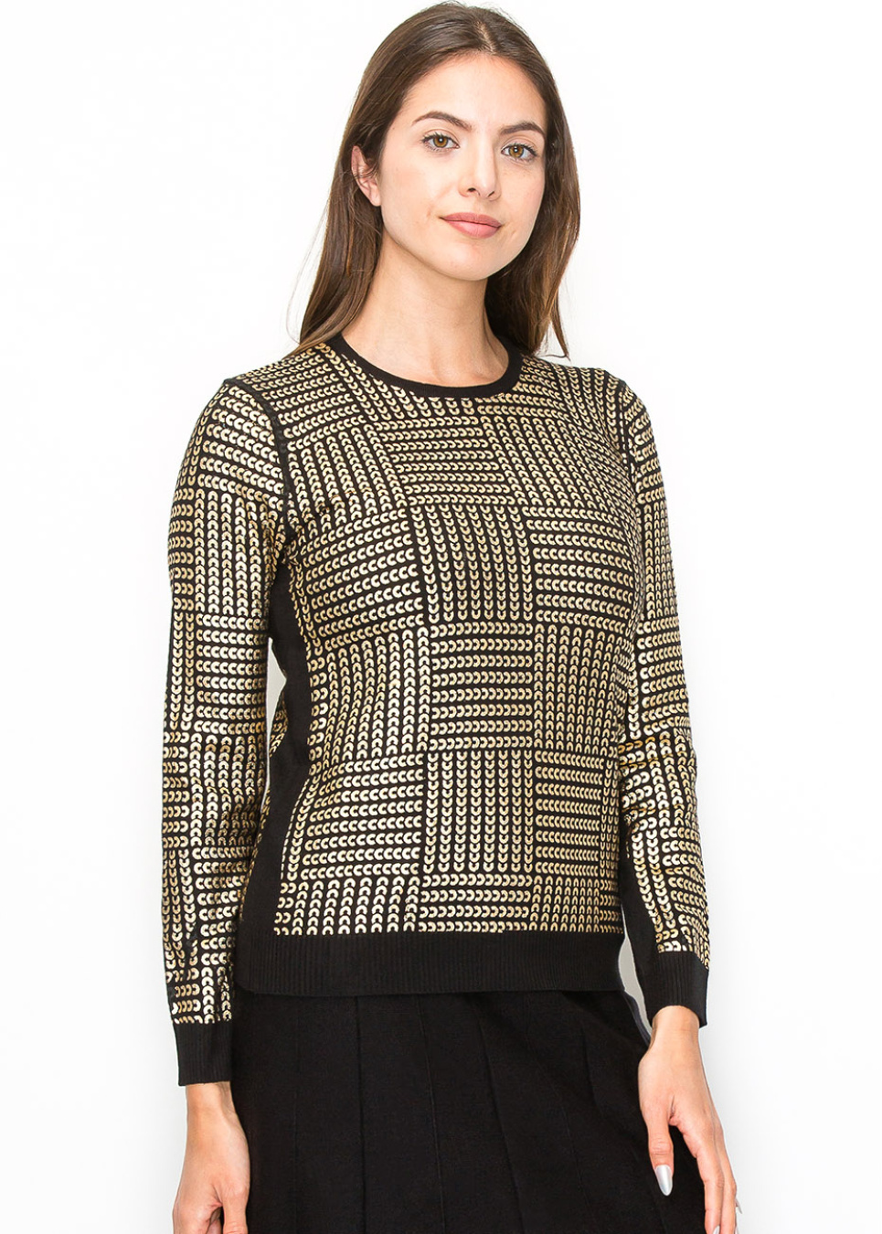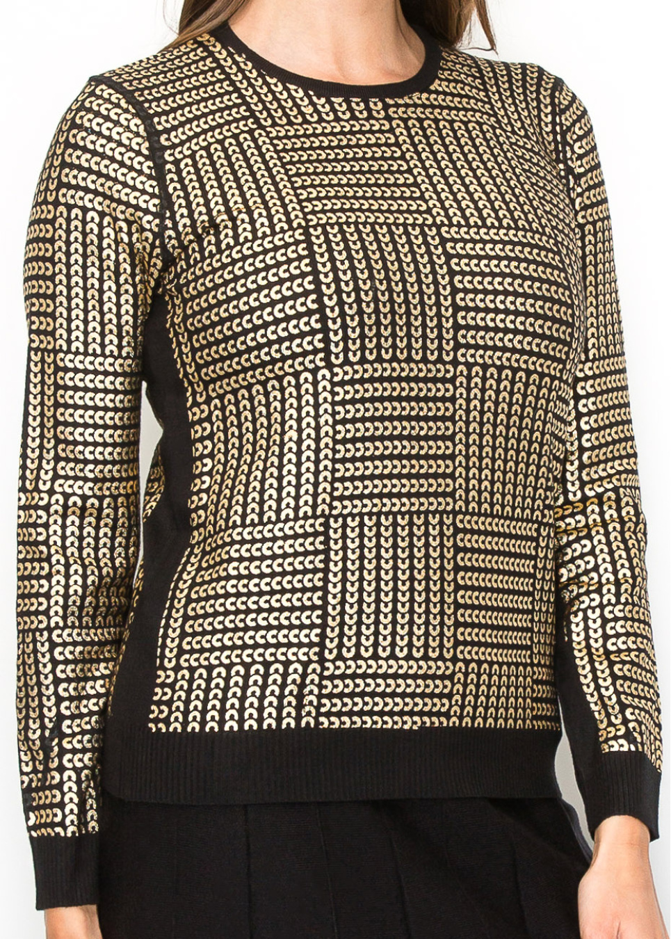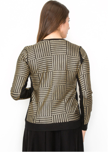 Subtle yet striking, the metallic gold details on this black sweater create a refined and artistic look. The texture of the knit combined with the geometric patterns offers an elevated style that’s still easy to wear. The soft knit fabric and modest cut make it a comfortable choice for any season.