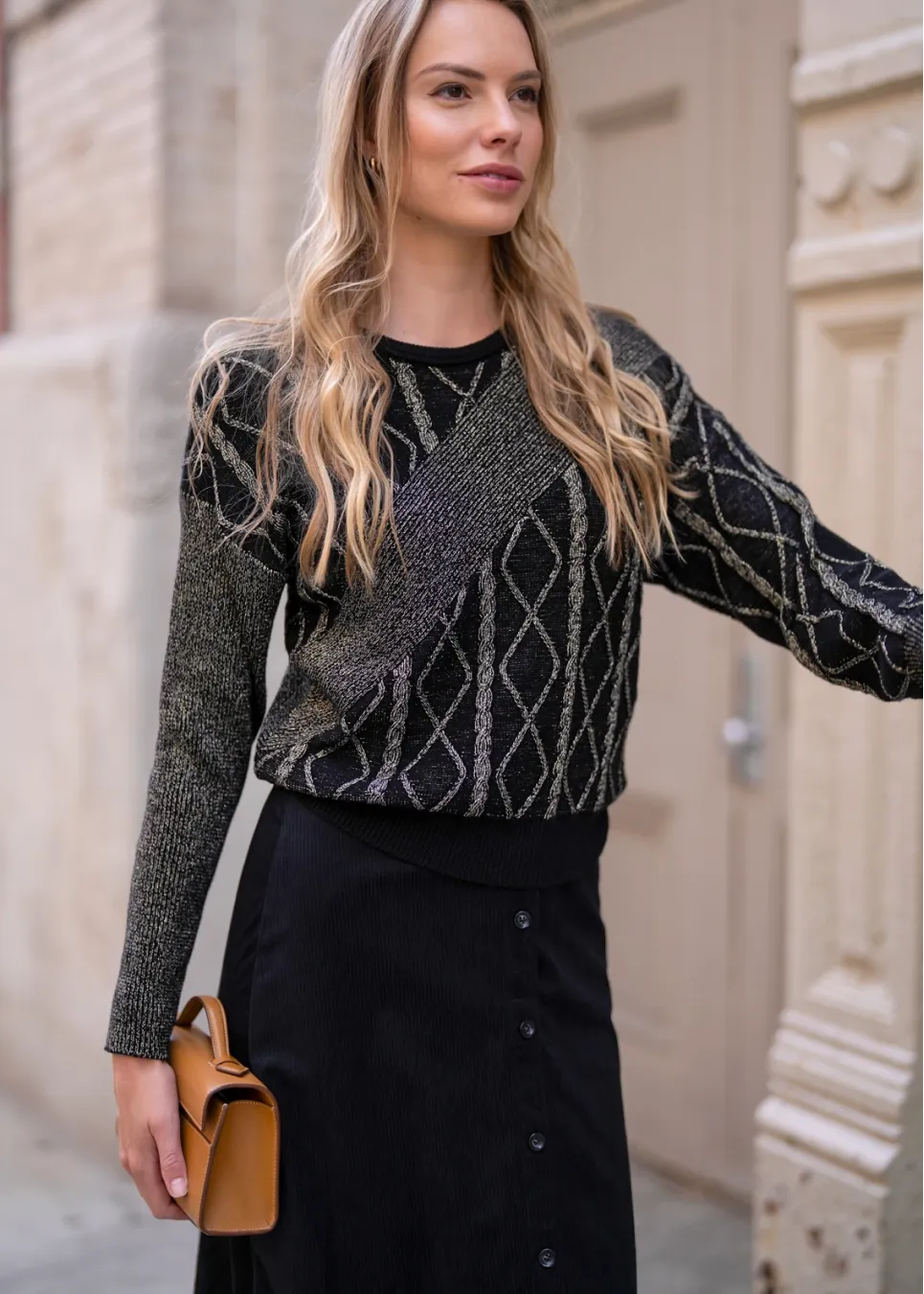 An elegant pairing of textures: a black midi skirt with clean tailoring meets a sweater woven with luminous gold threads. A refined outfit that transitions seamlessly from day to night.