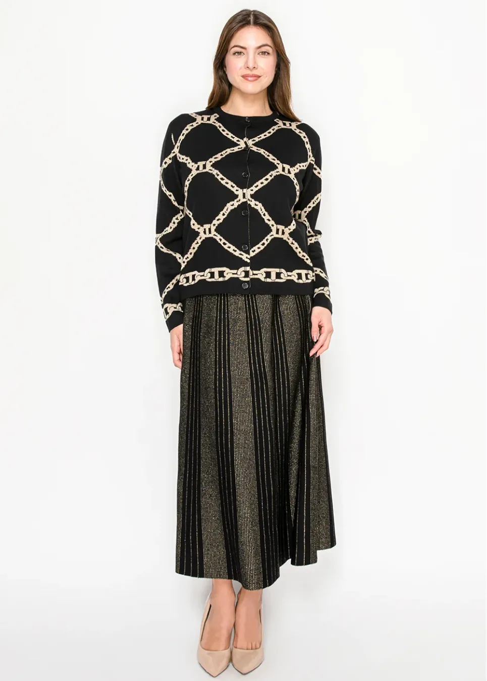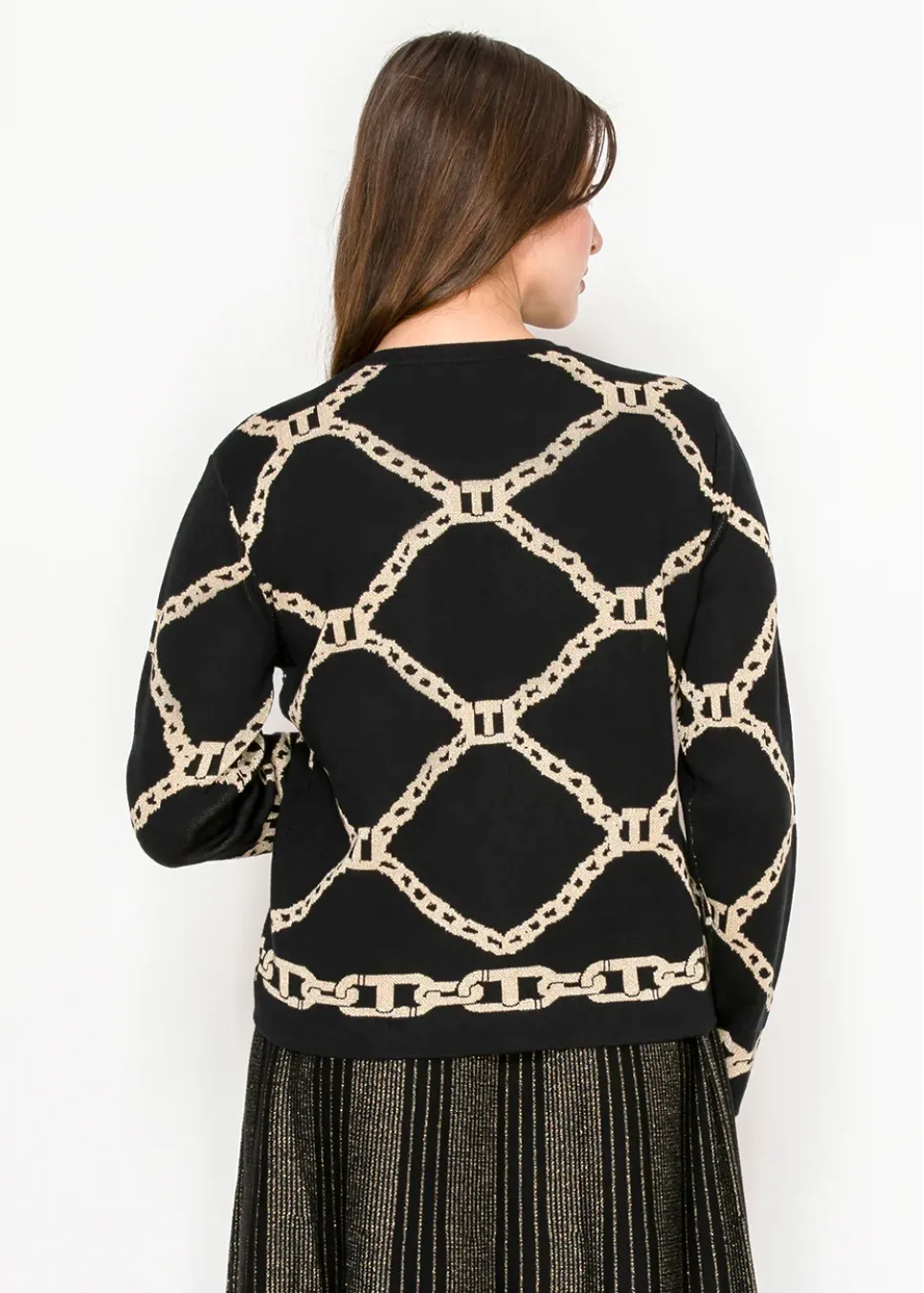 Elegant yet bold, this cardigan features an all-over chain motif. A refined piece that makes everyday styling feel special.
